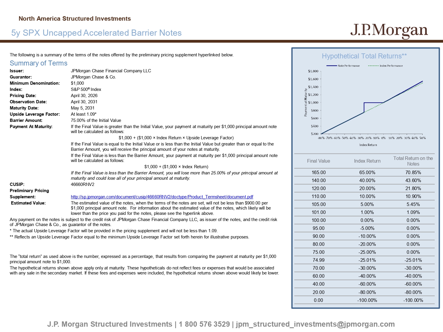 The following is a summary of the terms of the notes offered by the preliminary pricing supplement hyperlinked below. Summary of Terms Issuer: JPMorgan Chase Financial Company LLC Guarantor: JPMorgan Chase & Co. Minimum Denomination: $1,000 Index: S&P 500 ® Index Pricing Date: April 30, 2026 Observation Date: April 30, 2031 Maturity Date: May 5, 2031 Upside Leverage Factor: At least 1.09* Barrier Amount: 75.00% of the Initial Value Payment At Maturity: If the Final Value is greater than the Initial Value, your payment at maturity per $1,000 principal amount note will be calculated as follows: $1,000 + ($1,000 î Index Return î Upside Leverage Factor) If the Final Value is equal to the Initial Value or is less than the Initial Value but greater than or equal to the Barrier Amount, you will receive the principal amount of your notes at maturity. If the Final Value is less than the Barrier Amount, your payment at maturity per $1,000 principal amount note will be calculated as follows: $1,000 + ($1,000 î Index Return) If the Final Value is less than the Barrier Amount, you will lose more than 25.00% of your principal amount at maturity and could lose all of your principal amount at maturity. CUSIP: 46660RNV2 Preliminary Pricing Supplement: http://sp.jpmorgan.com/document/cusip/46660RNV2/doctype/Product_Termsheet/document.pdf Estimated Value: The estimated value of the notes, when the terms of the notes are set, will not be less than $900.00 per $1,000 principal amount note. For information about the estimated value of the notes, which likely will be lower than the price you paid for the notes, please see the hyperlink above. Any payment on the notes is subject to the credit risk of JPMorgan Chase Financial Company LLC, as issuer of the notes, and t he credit risk of JPMorgan Chase & Co., as guarantor of the notes. * The actual Upside Leverage Factor will be provided in the pricing supplement and will not be less than 1.09. ** Reflects an Upside Leverage Factor equal to the minimum Upside Leverage Factor set forth herein for illustrative purposes. The “total return” as used above is the number, expressed as a percentage, that results from comparing the payment at maturit y p er $1,000 principal amount note to $1,000. The hypothetical returns shown above apply only at maturity. These hypotheticals do not reflect fees or expenses that would b e a ssociated with any sale in the secondary market. If these fees and expenses were included, the hypothetical returns shown above would l ike ly be lower. J.P. Morgan Structured Investments | 1 800 576 3529 | jpm_structured_investments@jpmorgan.com 5y SPX Uncapped Accelerated Barrier Notes H North America Structured Investments Hypothetical Total Returns** Total Return on the Notes Index Return Final Value 70.85% 65.00% 165.00 43.60% 40.00% 140.00 21.80% 20.00% 120.00 10.90% 10.00% 110.00 5.45% 5.00% 105.00 1.09% 1.00% 101.00 0.00% 0.00% 100.00 0.00% - 5.00% 95.00 0.00% - 10.00% 90.00 0.00% - 20.00% 80.00 0.00 % - 25.00% 75.00 - 25.01% - 25.01% 74.99 - 30.00% - 30.00% 70.00 - 40.00% - 40.00% 60.00 - 60.00% - 60.00% 40.00 - 80.00% - 80.00% 20.00 - 100.00% - 100.00% 0.00