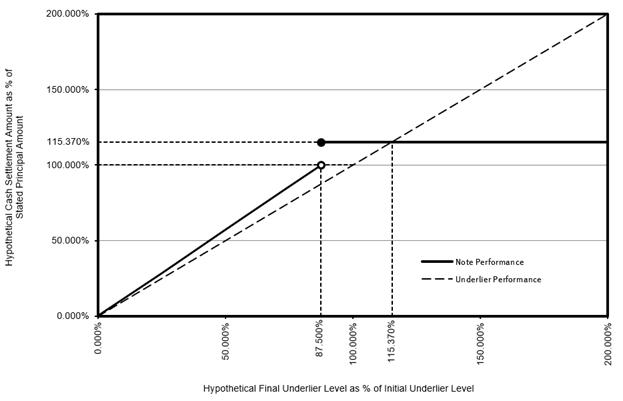 The following chart also shows a graphical illustration of the hypothetical cash settlement amounts that we would pay on your notes on the maturity date, if the final underlier level (expressed as a percentage of the initial underlier level) were any of the hypothetical levels shown on the horizontal axis. The chart shows that any hypothetical final underlier level (expressed as a percentage of the initial underlier level) of less than 87.500% (the section left of the 87.500% marker on the horizontal axis) would result in a hypothetical cash settlement amount of less than 100.000% of the stated principal amount of your notes (the section below the 100.000% marker on the vertical axis) and, accordingly, in a loss of principal to the holder of the notes. The chart also shows that any hypothetical final underlier level (expressed as a percentage of the initial underlier level) of greater than or equal to 87.500% (the section right of the 87.500% marker on the horizontal axis) would result in a capped return on your investment.