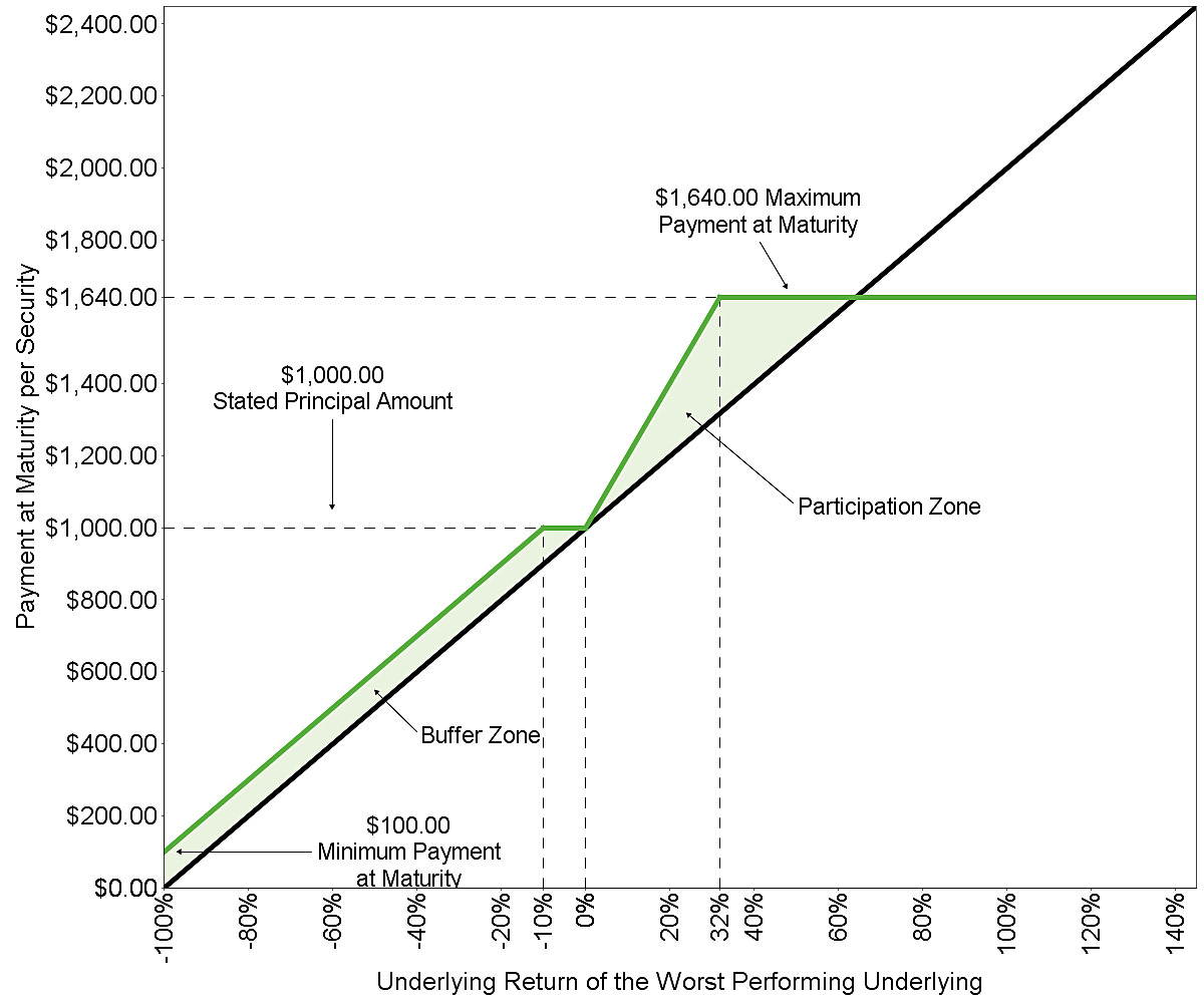 ▪The securities offer modified exposure to the performance of the worst performing underlying, with (i) the opportunity to participate in a limited range of potential appreciation of the worst performing underlying at the upside participation rate specified below and (ii) a limited buffer against any depreciation of the worst performing underlying as described below. In exchange for these features, investors in the securities must be willing to forgo any appreciation of the worst performing underlying in excess of the maximum return at maturity specified below and must be willing to forgo any dividends with respect to any underlying. In addition, investors in the securities must be willing to accept downside exposure to any depreciation of the worst performing underlying in excess of the buffer percentage specified below. If the worst performing underlying depreciates by more than the buffer percentage from its initial underlying value to its final underlying value, you will lose 1% of the stated principal amount of your securities for every 1% by which that depreciation exceeds the buffer percentage.