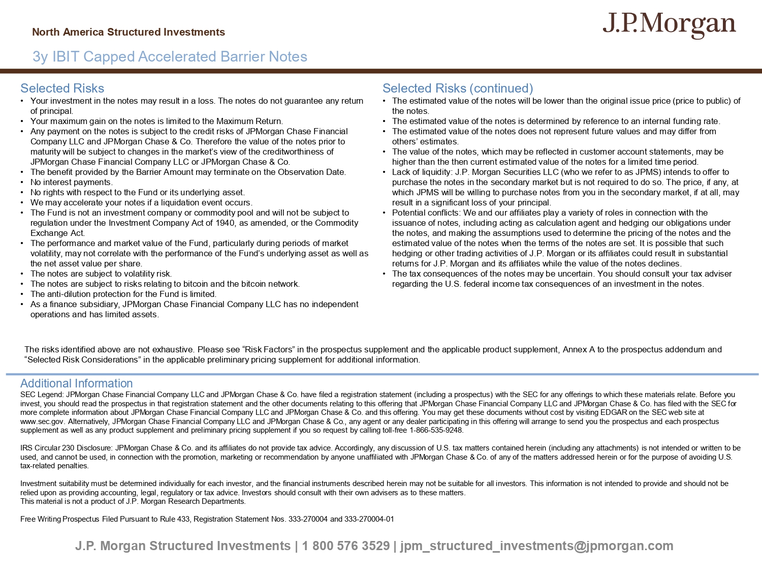 J.P. Morgan Structured Investments | 1 800 576 3529 | jpm_structured_investments@jpmorgan.com Selected Risks • Your investment in the notes may result in a loss. The notes do not guarantee any return of principal. • Your maximum gain on the notes is limited to the Maximum Return. • Any payment on the notes is subject to the credit risks of JPMorgan Chase Financial Company LLC and JPMorgan Chase & Co. Therefore the value of the notes prior to maturity will be subject to changes in the market’s view of the creditworthiness of JPMorgan Chase Financial Company LLC or JPMorgan Chase & Co. • The benefit provided by the Barrier Amount may terminate on the Observation Date. • No interest payments. • No rights with respect to the Fund or its underlying asset. • We may accelerate your notes if a liquidation event occurs. • The Fund is not an investment company or commodity pool and will not be subject to regulation under the Investment Company Act of 1940, as amended, or the Commodity Exchange Act. • The performance and market value of the Fund, particularly during periods of market volatility, may not correlate with the performance of the Fund’s underlying asset as well as the net asset value per share. • The notes are subject to volatility risk. • The notes are subject to risks relating to bitcoin and the bitcoin network. • The anti - dilution protection for the Fund is limited. • As a finance subsidiary, JPMorgan Chase Financial Company LLC has no independent operations and has limited assets. Selected Risks (continued) • The estimated value of the notes will be lower than the original issue price (price to public) of the notes. • The estimated value of the notes is determined by reference to an internal funding rate. • The estimated value of the notes does not represent future values and may differ from others’ estimates. • The value of the notes, which may be reflected in customer account statements, may be higher than the then current estimated value of the notes for a limited time period. • Lack of liquidity: J.P. Morgan Securities LLC (who we refer to as JPMS) intends to offer to purchase the notes in the secondary market but is not required to do so. The price, if any, at which JPMS will be willing to purchase notes from you in the secondary market, if at all, may result in a significant loss of your principal. • Potential conflicts: We and our affiliates play a variety of roles in connection with the issuance of notes, including acting as calculation agent and hedging our obligations under the notes, and making the assumptions used to determine the pricing of the notes and the estimated value of the notes when the terms of the notes are set. It is possible that such hedging or other trading activities of J.P. Morgan or its affiliates could result in substantial returns for J.P. Morgan and its affiliates while the value of the notes declines. • The tax consequences of the notes may be uncertain. You should consult your tax adviser regarding the U.S. federal income tax consequences of an investment in the notes. Additional Information SEC Legend: JPMorgan Chase Financial Company LLC and JPMorgan Chase & Co. have filed a registration statement (including a pr osp ectus) with the SEC for any offerings to which these materials relate. Before you invest, you should read the prospectus in that registration statement and the other documents relating to this offering that JPM organ Chase Financial Company LLC and JPMorgan Chase & Co. has filed with the SEC for more complete information about JPMorgan Chase Financial Company LLC and JPMorgan Chase & Co. and this offering. You may get the se documents without cost by visiting EDGAR on the SEC web site at www.sec.gov. Alternatively, JPMorgan Chase Financial Company LLC and JPMorgan Chase & Co., any agent or any dealer participat ing in this offering will arrange to send you the prospectus and each prospectus supplement as well as any product supplement and preliminary pricing supplement if you so request by calling toll - free 1 - 866 - 535 - 9248. IRS Circular 230 Disclosure: JPMorgan Chase & Co. and its affiliates do not provide tax advice. Accordingly, any discussion o f U .S. tax matters contained herein (including any attachments) is not intended or written to be used, and cannot be used, in connection with the promotion, marketing or recommendation by anyone unaffiliated with JPMorgan Cha se & Co. of any of the matters addressed herein or for the purpose of avoiding U.S. tax - related penalties. Investment suitability must be determined individually for each investor, and the financial instruments described herein may not be suitable for all investors. This information is not intended to provide and should not be relied upon as providing accounting, legal, regulatory or tax advice. Investors should consult with their own advisers as to the se matters. This material is not a product of J.P. Morgan Research Departments. Free Writing Prospectus Filed Pursuant to Rule 433, Registration Statement Nos. 333 - 270004 and 333 - 270004 - 01 3y IBIT Capped Accelerated Barrier Notes North America Structured Investments The risks identified above are not exhaustive. Please see “Risk Factors” in the prospectus supplement and the applicable prod uct supplement, Annex A to the prospectus addendum and “Selected Risk Considerations” in the applicable preliminary pricing supplement for additional information.