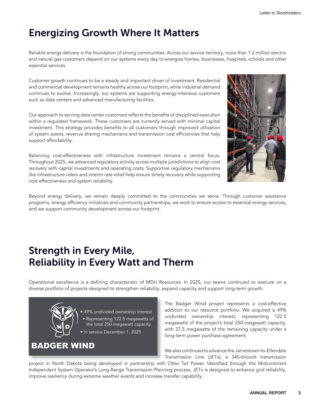 Energizing Growth Where It Matters Reliable energy delivery is the foundation of strong communities. Across our service territory, more than 1.2 million electric and natural gas customers depend on our systems every day to energize homes, businesses, hospitals, schools and other essential services. Customer growth continues to be a steady and important driver of investment. Residential and commercial development remains healthy across our footprint, while industrial demand continues to evolve. Increasingly, our systems are supporting energy‑intensive customers such as data centers and advanced manufacturing facilities. Our approach to serving data center customers reflects the benefits of disciplined execution within a regulated framework. These customers are currently served with minimal capital investment. This strategy provides benefits to all customers through improved utilization of system assets, revenue sharing mechanisms and transmission cost efficiencies that help support affordability. Balancing cost-effectiveness with infrastructure investment remains a central focus. Throughout 2025, we advanced regulatory activity across multiple jurisdictions to align cost recovery with capital investments and operating costs. Supportive regulatory mechanisms like infrastructure riders and interim rate relief help ensure timely recovery while supporting cost-effectiveness and system reliability. Beyond energy delivery, we remain deeply committed to the communities we serve. Through customer assistance programs, energy efficiency initiatives and community partnerships, we work to ensure access to essential energy services, and we support community development across our footprint. Strength in Every Mile, Reliability in Every Watt and Therm Operational excellence is a defining characteristic of MDU Resources. In 2025, our teams continued to execute on a diverse portfolio of projects designed to strengthen reliability, expand capacity and support long‑term growth. The Badger Wind project represents a cost-effective addition to our resource portfolio. We acquired a 49% undivided ownership interest, representing 122.5 megawatts of the project’s total 250‑megawatt capacity, with 27.5 megawatts of the remaining capacity under a long‑term power purchase agreement. We also continued to advance the Jamestown‑to‑Ellendale Transmission Line (JETx), a 345‑kilovolt transmission project in North Dakota being developed in partnership with Otter Tail Power. Identified through the Midcontinent Independent System Operator’s Long‑Range Transmission Planning process, JETx is designed to enhance grid reliability, improve resiliency during extreme weather events and increase transfer capability. • 49% undivided ownership interest • Representing 122.5 megawatts of the total 250 megawatt capacity • In service December 1, 2025 Letter to Stockholders MDU RESOURCES GROUP, INC. 3ANNUAL REPORT