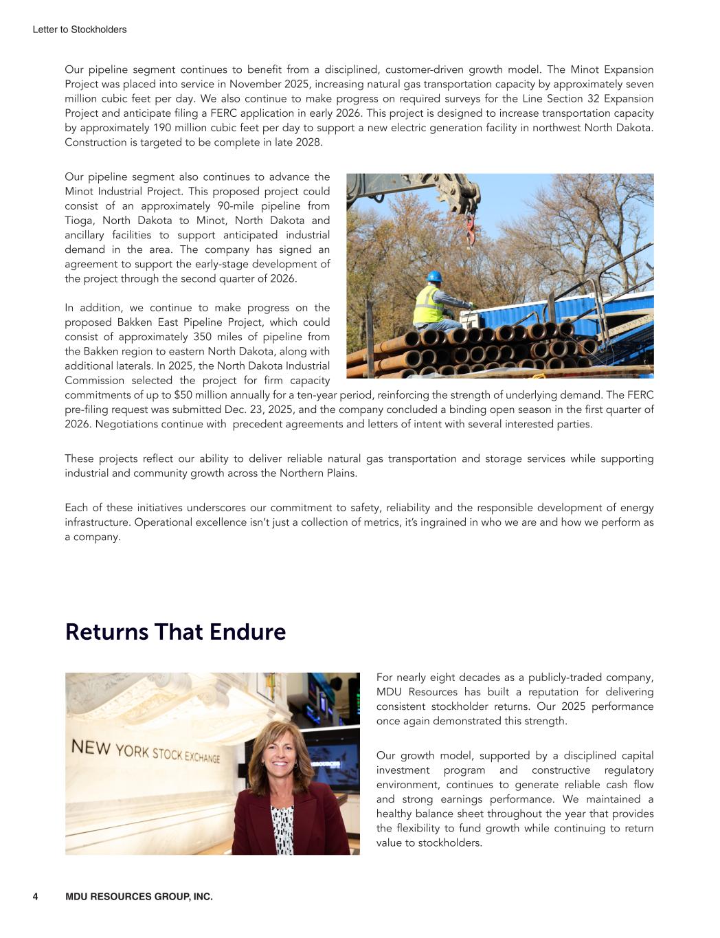 Our pipeline segment continues to benefit from a disciplined, customer‑driven growth model. The Minot Expansion Project was placed into service in November 2025, increasing natural gas transportation capacity by approximately seven million cubic feet per day. We also continue to make progress on required surveys for the Line Section 32 Expansion Project and anticipate filing a FERC application in early 2026. This project is designed to increase transportation capacity by approximately 190 million cubic feet per day to support a new electric generation facility in northwest North Dakota. Construction is targeted to be complete in late 2028. Our pipeline segment also continues to advance the Minot Industrial Project. This proposed project could consist of an approximately 90-mile pipeline from Tioga, North Dakota to Minot, North Dakota and ancillary facilities to support anticipated industrial demand in the area. The company has signed an agreement to support the early-stage development of the project through the second quarter of 2026. In addition, we continue to make progress on the proposed Bakken East Pipeline Project, which could consist of approximately 350 miles of pipeline from the Bakken region to eastern North Dakota, along with additional laterals. In 2025, the North Dakota Industrial Commission selected the project for firm capacity commitments of up to $50 million annually for a ten‑year period, reinforcing the strength of underlying demand. The FERC pre-filing request was submitted Dec. 23, 2025, and the company concluded a binding open season in the first quarter of 2026. Negotiations continue with precedent agreements and letters of intent with several interested parties. These projects reflect our ability to deliver reliable natural gas transportation and storage services while supporting industrial and community growth across the Northern Plains. Each of these initiatives underscores our commitment to safety, reliability and the responsible development of energy infrastructure. Operational excellence isn’t just a collection of metrics, it’s ingrained in who we are and how we perform as a company. Returns That Endure For nearly eight decades as a publicly-traded company, MDU Resources has built a reputation for delivering consistent stockholder returns. Our 2025 performance once again demonstrated this strength. Our growth model, supported by a disciplined capital investment program and constructive regulatory environment, continues to generate reliable cash flow and strong earnings performance. We maintained a healthy balance sheet throughout the year that provides the flexibility to fund growth while continuing to return value to stockholders. Letter to Stockholders MDU RESOURCES GROUP, INC.4
