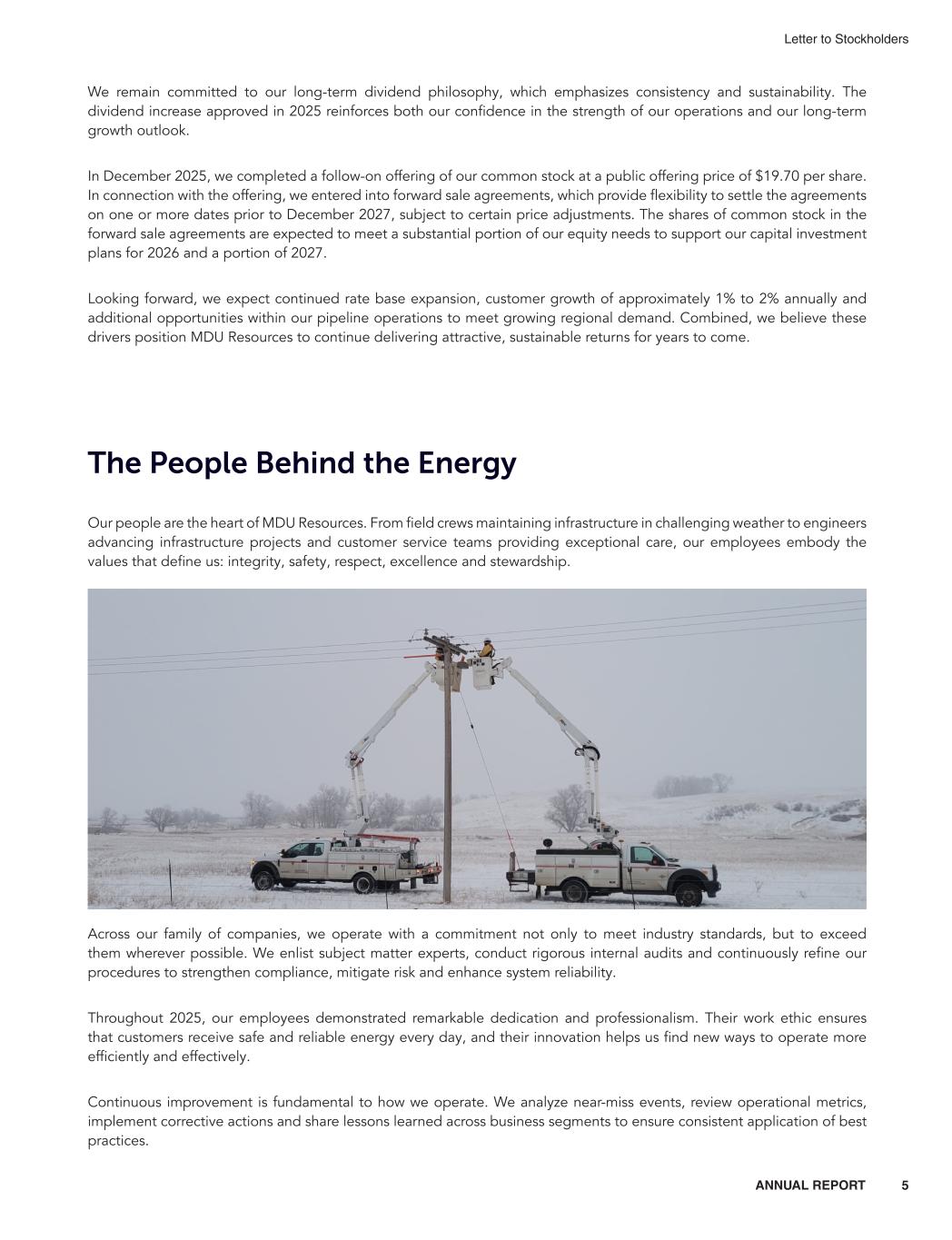 We remain committed to our long-term dividend philosophy, which emphasizes consistency and sustainability. The dividend increase approved in 2025 reinforces both our confidence in the strength of our operations and our long-term growth outlook. In December 2025, we completed a follow-on offering of our common stock at a public offering price of $19.70 per share. In connection with the offering, we entered into forward sale agreements, which provide flexibility to settle the agreements on one or more dates prior to December 2027, subject to certain price adjustments. The shares of common stock in the forward sale agreements are expected to meet a substantial portion of our equity needs to support our capital investment plans for 2026 and a portion of 2027. Looking forward, we expect continued rate base expansion, customer growth of approximately 1% to 2% annually and additional opportunities within our pipeline operations to meet growing regional demand. Combined, we believe these drivers position MDU Resources to continue delivering attractive, sustainable returns for years to come. The People Behind the Energy Our people are the heart of MDU Resources. From field crews maintaining infrastructure in challenging weather to engineers advancing infrastructure projects and customer service teams providing exceptional care, our employees embody the values that define us: integrity, safety, respect, excellence and stewardship. Across our family of companies, we operate with a commitment not only to meet industry standards, but to exceed them wherever possible. We enlist subject matter experts, conduct rigorous internal audits and continuously refine our procedures to strengthen compliance, mitigate risk and enhance system reliability. Throughout 2025, our employees demonstrated remarkable dedication and professionalism. Their work ethic ensures that customers receive safe and reliable energy every day, and their innovation helps us find new ways to operate more efficiently and effectively. Continuous improvement is fundamental to how we operate. We analyze near-miss events, review operational metrics, implement corrective actions and share lessons learned across business segments to ensure consistent application of best practices. Letter to Stockholders MDU RESOURCES GROUP, INC. 5ANNUAL REPORT