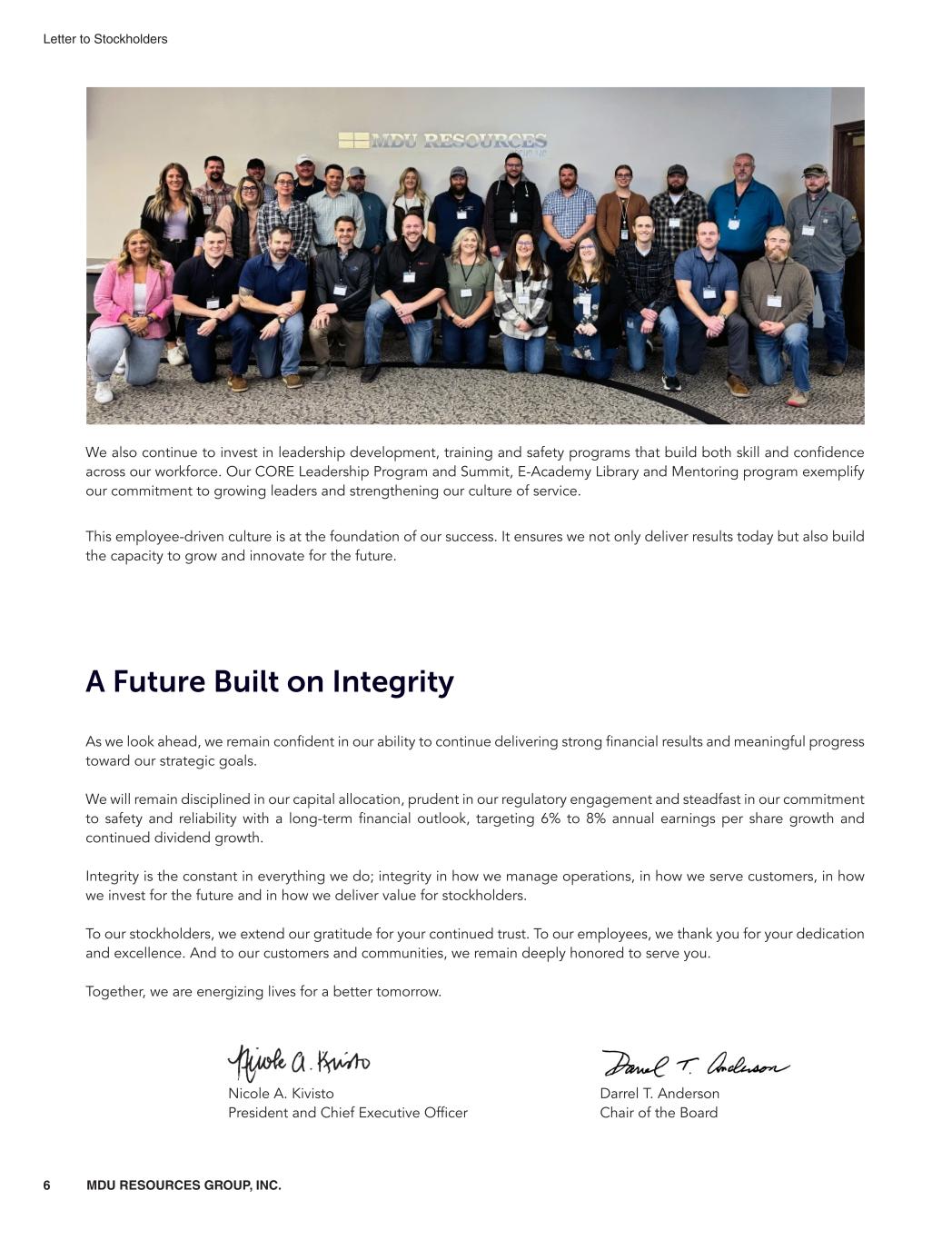 Nicole A. Kivisto President and Chief Executive Officer Darrel T. Anderson Chair of the Board We also continue to invest in leadership development, training and safety programs that build both skill and confidence across our workforce. Our CORE Leadership Program and Summit, E-Academy Library and Mentoring program exemplify our commitment to growing leaders and strengthening our culture of service. This employee-driven culture is at the foundation of our success. It ensures we not only deliver results today but also build the capacity to grow and innovate for the future. A Future Built on Integrity As we look ahead, we remain confident in our ability to continue delivering strong financial results and meaningful progress toward our strategic goals. We will remain disciplined in our capital allocation, prudent in our regulatory engagement and steadfast in our commitment to safety and reliability with a long-term financial outlook, targeting 6% to 8% annual earnings per share growth and continued dividend growth. Integrity is the constant in everything we do; integrity in how we manage operations, in how we serve customers, in how we invest for the future and in how we deliver value for stockholders. To our stockholders, we extend our gratitude for your continued trust. To our employees, we thank you for your dedication and excellence. And to our customers and communities, we remain deeply honored to serve you. Together, we are energizing lives for a better tomorrow. Letter to Stockholders MDU RESOURCES GROUP, INC.6