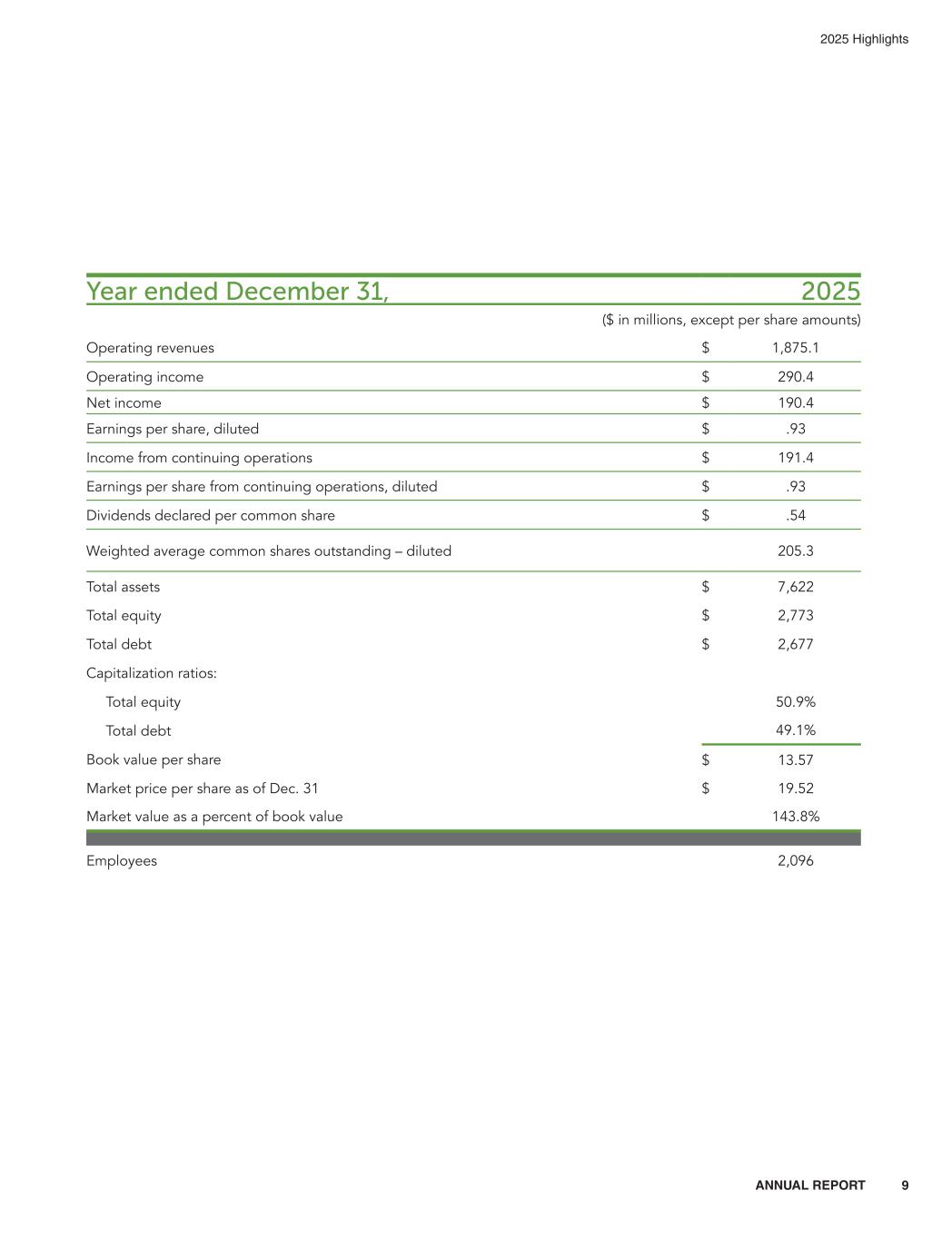 Year ended December 31, 2025 ($ in millions, except per share amounts) Operating revenues $ 1,875.1 Operating income $ 290.4 Net income $ 190.4 Earnings per share, diluted $ .93 Income from continuing operations $ 191.4 Earnings per share from continuing operations, diluted $ .93 Dividends declared per common share $ .54 Weighted average common shares outstanding – diluted 205.3 Total assets $ 7,622 Total equity $ 2,773 Total debt $ 2,677 Capitalization ratios: Total equity 50.9% Total debt 49.1% Book value per share $ 13.57 Market price per share as of Dec. 31 $ 19.52 Market value as a percent of book value 143.8% Employees 2,096 2025 Highlights MDU RESOURCES GROUP, INC. 9ANNUAL REPORT