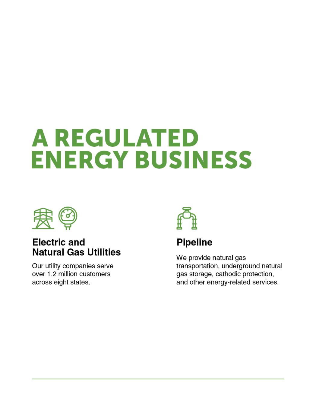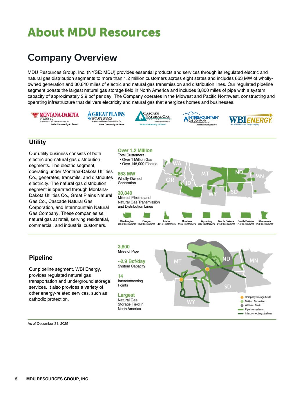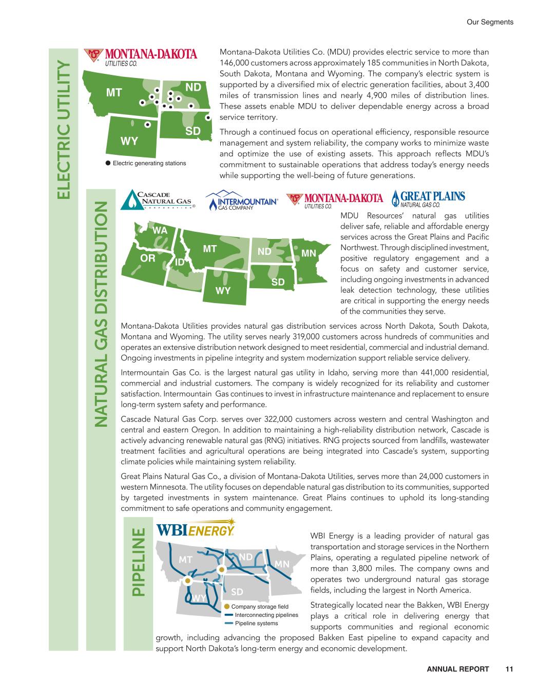 Our Segments SD MT ID WY OR ND MN WA SD MT WY ND MN Pipeline systems Interconnecting pipelines Company storage field SD MT WY ND Electric generating stations Montana‑Dakota Utilities Co. (MDU) provides electric service to more than 146,000 customers across approximately 185 communities in North Dakota, South Dakota, Montana and Wyoming. The company’s electric system is supported by a diversified mix of electric generation facilities, about 3,400 miles of transmission lines and nearly 4,900 miles of distribution lines. These assets enable MDU to deliver dependable energy across a broad service territory. Through a continued focus on operational efficiency, responsible resource management and system reliability, the company works to minimize waste and optimize the use of existing assets. This approach reflects MDU’s commitment to sustainable operations that address today’s energy needs while supporting the well‑being of future generations. MDU Resources’ natural gas utilities deliver safe, reliable and affordable energy services across the Great Plains and Pacific Northwest. Through disciplined investment, positive regulatory engagement and a focus on safety and customer service, including ongoing investments in advanced leak detection technology, these utilities are critical in supporting the energy needs of the communities they serve. Montana-Dakota Utilities provides natural gas distribution services across North Dakota, South Dakota, Montana and Wyoming. The utility serves nearly 319,000 customers across hundreds of communities and operates an extensive distribution network designed to meet residential, commercial and industrial demand. Ongoing investments in pipeline integrity and system modernization support reliable service delivery. Intermountain Gas Co. is the largest natural gas utility in Idaho, serving more than 441,000 residential, commercial and industrial customers. The company is widely recognized for its reliability and customer satisfaction. Intermountain Gas continues to invest in infrastructure maintenance and replacement to ensure long‑term system safety and performance. Cascade Natural Gas Corp. serves over 322,000 customers across western and central Washington and central and eastern Oregon. In addition to maintaining a high‑reliability distribution network, Cascade is actively advancing renewable natural gas (RNG) initiatives. RNG projects sourced from landfills, wastewater treatment facilities and agricultural operations are being integrated into Cascade’s system, supporting climate policies while maintaining system reliability. Great Plains Natural Gas Co., a division of Montana‑Dakota Utilities, serves more than 24,000 customers in western Minnesota. The utility focuses on dependable natural gas distribution to its communities, supported by targeted investments in system maintenance. Great Plains continues to uphold its long‑standing commitment to safe operations and community engagement. WBI Energy is a leading provider of natural gas transportation and storage services in the Northern Plains, operating a regulated pipeline network of more than 3,800 miles. The company owns and operates two underground natural gas storage fields, including the largest in North America. Strategically located near the Bakken, WBI Energy plays a critical role in delivering energy that supports communities and regional economic growth, including advancing the proposed Bakken East pipeline to expand capacity and support North Dakota’s long‑term energy and economic development. MDU RESOURCES GROUP, INC. 11ANNUAL REPORT