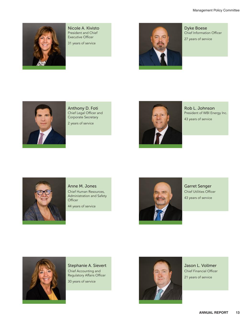 Nicole A. Kivisto President and Chief Executive Officer 31 years of service Dyke Boese Chief Information Officer 27 years of service Anthony D. Foti Chief Legal Officer and Corporate Secretary 2 years of service Rob L. Johnson President of WBI Energy Inc. 43 years of service Anne M. Jones Chief Human Resources, Administration and Safety Officer 44 years of service Garret Senger Chief Utilities Officer 43 years of service Stephanie A. Sievert Chief Accounting and Regulatory Affairs Officer 30 years of service Jason L. Vollmer Chief Financial Officer 21 years of service Management Policy Committee MDU RESOURCES GROUP, INC. 13ANNUAL REPORT