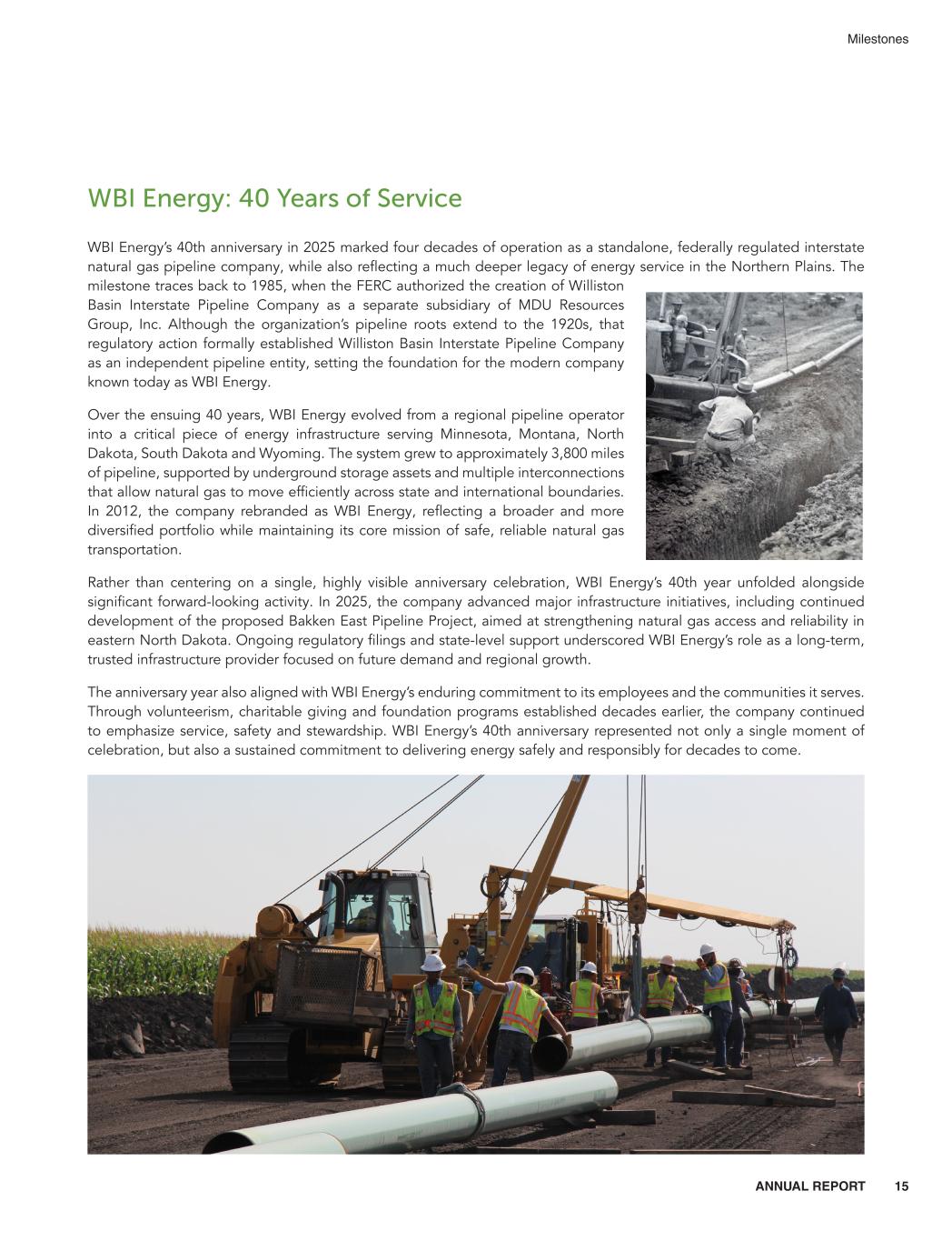 Milestones MDU RESOURCES GROUP, INC. 15ANNUAL REPORT WBI Energy’s 40th anniversary in 2025 marked four decades of operation as a standalone, federally regulated interstate natural gas pipeline company, while also reflecting a much deeper legacy of energy service in the Northern Plains. The milestone traces back to 1985, when the FERC authorized the creation of Williston Basin Interstate Pipeline Company as a separate subsidiary of MDU Resources Group, Inc. Although the organization’s pipeline roots extend to the 1920s, that regulatory action formally established Williston Basin Interstate Pipeline Company as an independent pipeline entity, setting the foundation for the modern company known today as WBI Energy. Over the ensuing 40 years, WBI Energy evolved from a regional pipeline operator into a critical piece of energy infrastructure serving Minnesota, Montana, North Dakota, South Dakota and Wyoming. The system grew to approximately 3,800 miles of pipeline, supported by underground storage assets and multiple interconnections that allow natural gas to move efficiently across state and international boundaries. In 2012, the company rebranded as WBI Energy, reflecting a broader and more diversified portfolio while maintaining its core mission of safe, reliable natural gas transportation. Rather than centering on a single, highly visible anniversary celebration, WBI Energy’s 40th year unfolded alongside significant forward-looking activity. In 2025, the company advanced major infrastructure initiatives, including continued development of the proposed Bakken East Pipeline Project, aimed at strengthening natural gas access and reliability in eastern North Dakota. Ongoing regulatory filings and state-level support underscored WBI Energy’s role as a long-term, trusted infrastructure provider focused on future demand and regional growth. The anniversary year also aligned with WBI Energy’s enduring commitment to its employees and the communities it serves. Through volunteerism, charitable giving and foundation programs established decades earlier, the company continued to emphasize service, safety and stewardship. WBI Energy’s 40th anniversary represented not only a single moment of celebration, but also a sustained commitment to delivering energy safely and responsibly for decades to come. WBI Energy: 40 Years of Service