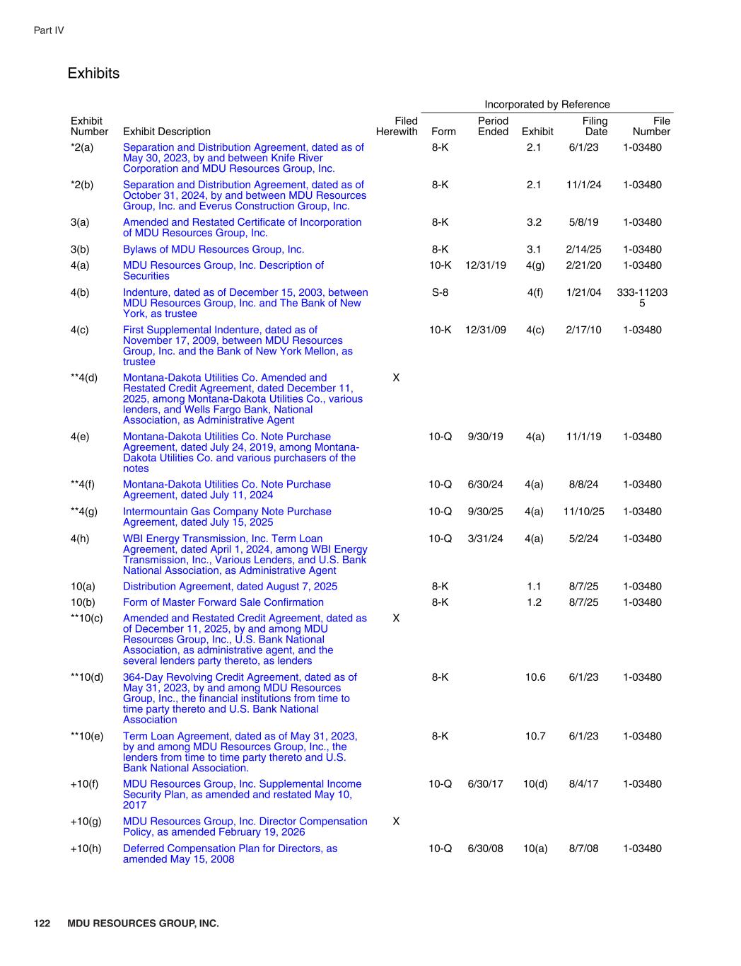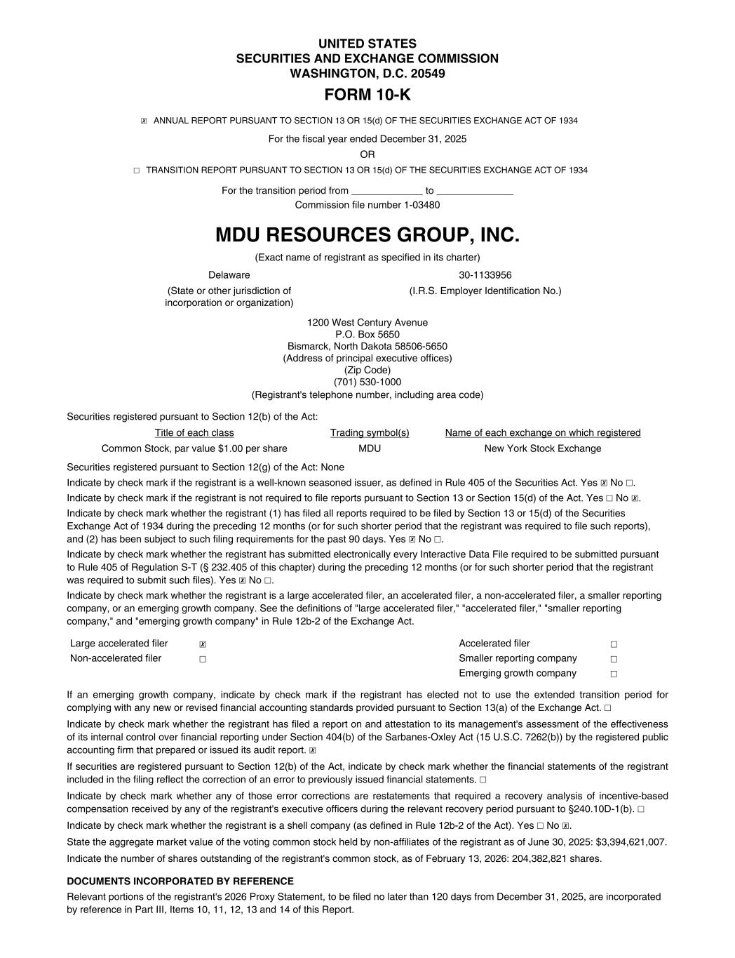 UNITED STATES SECURITIES AND EXCHANGE COMMISSION WASHINGTON, D.C. 20549 FORM 10-K ☒ ANNUAL REPORT PURSUANT TO SECTION 13 OR 15(d) OF THE SECURITIES EXCHANGE ACT OF 1934 For the fiscal year ended December 31, 2025 OR ☐ TRANSITION REPORT PURSUANT TO SECTION 13 OR 15(d) OF THE SECURITIES EXCHANGE ACT OF 1934 For the transition period from _____________ to ______________ Commission file number 1-03480 MDU RESOURCES GROUP, INC. (Exact name of registrant as specified in its charter) Delaware 30-1133956 (State or other jurisdiction of incorporation or organization) (I.R.S. Employer Identification No.) 1200 West Century Avenue P.O. Box 5650 Bismarck, North Dakota 58506-5650 (Address of principal executive offices) (Zip Code) (701) 530-1000 (Registrant's telephone number, including area code) Securities registered pursuant to Section 12(b) of the Act: Title of each class Trading symbol(s) Name of each exchange on which registered Common Stock, par value $1.00 per share MDU New York Stock Exchange Securities registered pursuant to Section 12(g) of the Act: None Indicate by check mark if the registrant is a well-known seasoned issuer, as defined in Rule 405 of the Securities Act. Yes ☒ No ☐. Indicate by check mark if the registrant is not required to file reports pursuant to Section 13 or Section 15(d) of the Act. Yes ☐ No ☒. Indicate by check mark whether the registrant (1) has filed all reports required to be filed by Section 13 or 15(d) of the Securities Exchange Act of 1934 during the preceding 12 months (or for such shorter period that the registrant was required to file such reports), and (2) has been subject to such filing requirements for the past 90 days. Yes ☒ No ☐. Indicate by check mark whether the registrant has submitted electronically every Interactive Data File required to be submitted pursuant to Rule 405 of Regulation S-T (§ 232.405 of this chapter) during the preceding 12 months (or for such shorter period that the registrant was required to submit such files). Yes ☒ No ☐. Indicate by check mark whether the registrant is a large accelerated filer, an accelerated filer, a non-accelerated filer, a smaller reporting company, or an emerging growth company. See the definitions of "large accelerated filer," "accelerated filer," "smaller reporting company," and "emerging growth company" in Rule 12b-2 of the Exchange Act. Large accelerated filer ☒ Accelerated filer ☐ Non-accelerated filer ☐ Smaller reporting company ☐ Emerging growth company ☐ If an emerging growth company, indicate by check mark if the registrant has elected not to use the extended transition period for complying with any new or revised financial accounting standards provided pursuant to Section 13(a) of the Exchange Act. ☐ Indicate by check mark whether the registrant has filed a report on and attestation to its management's assessment of the effectiveness of its internal control over financial reporting under Section 404(b) of the Sarbanes-Oxley Act (15 U.S.C. 7262(b)) by the registered public accounting firm that prepared or issued its audit report. ☒ If securities are registered pursuant to Section 12(b) of the Act, indicate by check mark whether the financial statements of the registrant included in the filing reflect the correction of an error to previously issued financial statements. ☐ Indicate by check mark whether any of those error corrections are restatements that required a recovery analysis of incentive-based compensation received by any of the registrant's executive officers during the relevant recovery period pursuant to §240.10D-1(b). ☐ Indicate by check mark whether the registrant is a shell company (as defined in Rule 12b-2 of the Act). Yes ☐ No ☒. State the aggregate market value of the voting common stock held by non-affiliates of the registrant as of June 30, 2025: $3,394,621,007. Indicate the number of shares outstanding of the registrant's common stock, as of February 13, 2026: 204,382,821 shares. DOCUMENTS INCORPORATED BY REFERENCE Relevant portions of the registrant's 2026 Proxy Statement, to be filed no later than 120 days from December 31, 2025, are incorporated by reference in Part III, Items 10, 11, 12, 13 and 14 of this Report.