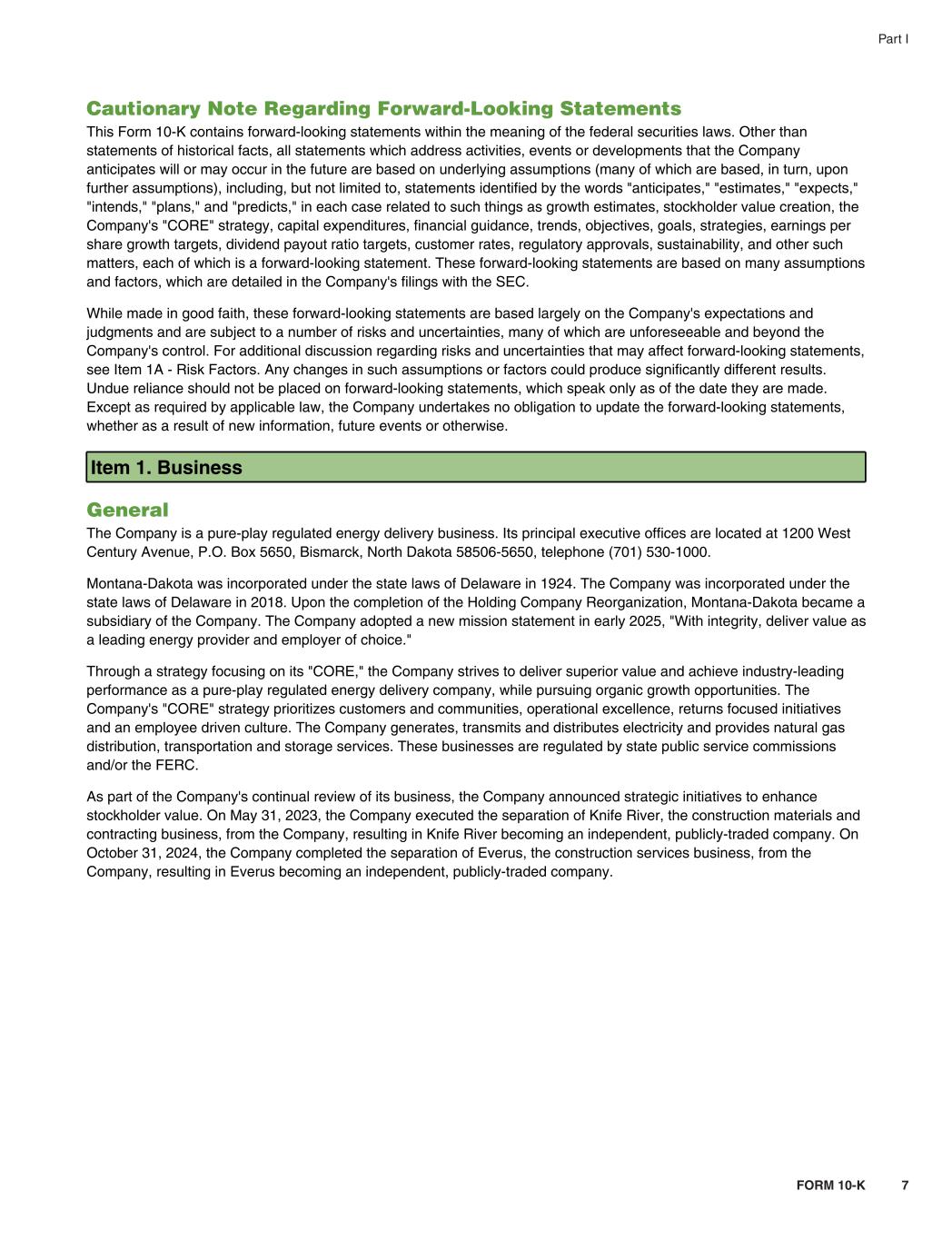 7 Part I FORM 10-K Cautionary Note Regarding Forward-Looking Statements This Form 10-K contains forward-looking statements within the meaning of the federal securities laws. Other than statements of historical facts, all statements which address activities, events or developments that the Company anticipates will or may occur in the future are based on underlying assumptions (many of which are based, in turn, upon further assumptions), including, but not limited to, statements identified by the words "anticipates," "estimates," "expects," "intends," "plans," and "predicts," in each case related to such things as growth estimates, stockholder value creation, the Company's "CORE" strategy, capital expenditures, financial guidance, trends, objectives, goals, strategies, earnings per share growth targets, dividend payout ratio targets, customer rates, regulatory approvals, sustainability, and other such matters, each of which is a forward-looking statement. These forward-looking statements are based on many assumptions and factors, which are detailed in the Company's filings with the SEC. While made in good faith, these forward-looking statements are based largely on the Company's expectations and judgments and are subject to a number of risks and uncertainties, many of which are unforeseeable and beyond the Company's control. For additional discussion regarding risks and uncertainties that may affect forward-looking statements, see Item 1A - Risk Factors. Any changes in such assumptions or factors could produce significantly different results. Undue reliance should not be placed on forward-looking statements, which speak only as of the date they are made. Except as required by applicable law, the Company undertakes no obligation to update the forward-looking statements, whether as a result of new information, future events or otherwise. Item 1. Business General The Company is a pure-play regulated energy delivery business. Its principal executive offices are located at 1200 West Century Avenue, P.O. Box 5650, Bismarck, North Dakota 58506-5650, telephone (701) 530-1000. Montana-Dakota was incorporated under the state laws of Delaware in 1924. The Company was incorporated under the state laws of Delaware in 2018. Upon the completion of the Holding Company Reorganization, Montana-Dakota became a subsidiary of the Company. The Company adopted a new mission statement in early 2025, "With integrity, deliver value as a leading energy provider and employer of choice." Through a strategy focusing on its "CORE," the Company strives to deliver superior value and achieve industry-leading performance as a pure-play regulated energy delivery company, while pursuing organic growth opportunities. The Company's "CORE" strategy prioritizes customers and communities, operational excellence, returns focused initiatives and an employee driven culture. The Company generates, transmits and distributes electricity and provides natural gas distribution, transportation and storage services. These businesses are regulated by state public service commissions and/or the FERC. As part of the Company's continual review of its business, the Company announced strategic initiatives to enhance stockholder value. On May 31, 2023, the Company executed the separation of Knife River, the construction materials and contracting business, from the Company, resulting in Knife River becoming an independent, publicly-traded company. On October 31, 2024, the Company completed the separation of Everus, the construction services business, from the Company, resulting in Everus becoming an independent, publicly-traded company. Index Part I MDU Resources Group, Inc. Form 10-K 7