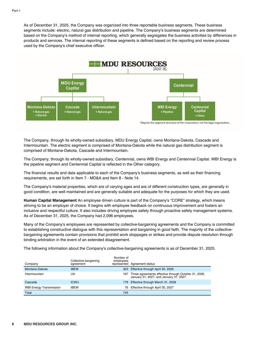 MDU RESOURCES GROUP, INC. Part I 8 As of December 31, 2025, the Company was organized into three reportable business segments. These business segments include: electric, natural gas distribution and pipeline. The Company's business segments are determined based on the Company's method of internal reporting, which generally segregates the business activities by differences in products and services. The internal reporting of these segments is defined based on the reporting and review process used by the Company's chief executive officer. The Company, through its wholly-owned subsidiary, MDU Energy Capital, owns Montana-Dakota, Cascade and Intermountain. The electric segment is comprised of Montana-Dakota while the natural gas distribution segment is comprised of Montana-Dakota, Cascade and Intermountain. The Company, through its wholly-owned subsidiary, Centennial, owns WBI Energy and Centennial Capital. WBI Energy is the pipeline segment and Centennial Capital is reflected in the Other category. The financial results and data applicable to each of the Company's business segments, as well as their financing requirements, are set forth in Item 7 - MD&A and Item 8 - Note 14. The Company's material properties, which are of varying ages and are of different construction types, are generally in good condition, are well maintained and are generally suitable and adequate for the purposes for which they are used. Human Capital Management An employee driven culture is part of the Company's "CORE" strategy, which means striving to be an employer of choice. It begins with employee feedback on continuous improvement and fosters an inclusive and respectful culture. It also includes driving employee safety through proactive safety management systems. As of December 31, 2025, the Company had 2,096 employees. Many of the Company's employees are represented by collective-bargaining agreements and the Company is committed to establishing constructive dialogue with this representation and bargaining in good faith. The majority of the collective- bargaining agreements contain provisions that prohibit work stoppages or strikes and provide dispute resolution through binding arbitration in the event of an extended disagreement. The following information about the Company's collective-bargaining agreements is as of December 31, 2025. Company Collective-bargaining agreement Number of employees represented Agreement status Montana-Dakota IBEW 323 Effective through April 30, 2026 Intermountain UA 167 Three agreements effective through October 31, 2026, January 31, 2027, and January 31, 2027. Cascade ICWU 179 Effective through March 31, 2028 WBI Energy Transmission IBEW 76 Effective through April 30, 2027 Total 745 Index Part I 8 MDU Resources Group, Inc. Form 10-K