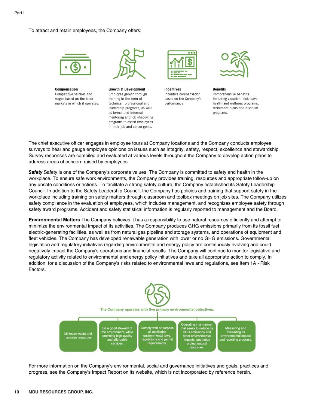 MDU RESOURCES GROUP, INC. Part I 10 To attract and retain employees, the Company offers: The chief executive officer engages in employee tours at Company locations and the Company conducts employee surveys to hear and gauge employee opinions on issues such as integrity, safety, respect, excellence and stewardship. Survey responses are compiled and evaluated at various levels throughout the Company to develop action plans to address areas of concern raised by employees. Safety Safety is one of the Company's corporate values. The Company is committed to safety and health in the workplace. To ensure safe work environments, the Company provides training, resources and appropriate follow-up on any unsafe conditions or actions. To facilitate a strong safety culture, the Company established its Safety Leadership Council. In addition to the Safety Leadership Council, the Company has policies and training that support safety in the workplace including training on safety matters through classroom and toolbox meetings on job sites. The Company utilizes safety compliance in the evaluation of employees, which includes management, and recognizes employee safety through safety award programs. Accident and safety statistical information is regularly reported to management and the Board. Environmental Matters The Company believes it has a responsibility to use natural resources efficiently and attempt to minimize the environmental impact of its activities. The Company produces GHG emissions primarily from its fossil fuel electric-generating facilities, as well as from natural gas pipeline and storage systems, and operations of equipment and fleet vehicles. The Company has developed renewable generation with lower or no GHG emissions. Governmental legislation and regulatory initiatives regarding environmental and energy policy are continuously evolving and could negatively impact the Company's operations and financial results. The Company will continue to monitor legislative and regulatory activity related to environmental and energy policy initiatives and take all appropriate action to comply. In addition, for a discussion of the Company's risks related to environmental laws and regulations, see Item 1A - Risk Factors. For more information on the Company's environmental, social and governance initiatives and goals, practices and progress, see the Company's Impact Report on its website, which is not incorporated by reference herein. Index Part I 10 MDU Resources Group, Inc. Form 10-K
