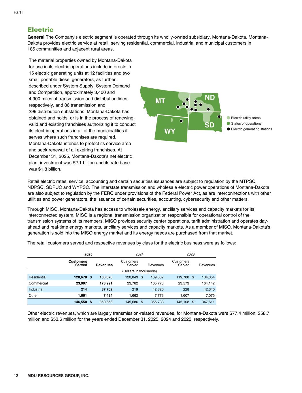 MDU RESOURCES GROUP, INC. Part I 12 Electric General The Company's electric segment is operated through its wholly-owned subsidiary, Montana-Dakota. Montana- Dakota provides electric service at retail, serving residential, commercial, industrial and municipal customers in 185 communities and adjacent rural areas. The material properties owned by Montana-Dakota for use in its electric operations include interests in 15 electric generating units at 12 facilities and two small portable diesel generators, as further described under System Supply, System Demand and Competition, approximately 3,400 and 4,900 miles of transmission and distribution lines, respectively, and 86 transmission and 299 distribution substations. Montana-Dakota has obtained and holds, or is in the process of renewing, valid and existing franchises authorizing it to conduct its electric operations in all of the municipalities it serves where such franchises are required. Montana-Dakota intends to protect its service area and seek renewal of all expiring franchises. At December 31, 2025, Montana-Dakota's net electric plant investment was $2.1 billion and its rate base was $1.8 billion. Retail electric rates, service, accounting and certain securities issuances are subject to regulation by the MTPSC, NDPSC, SDPUC and WYPSC. The interstate transmission and wholesale electric power operations of Montana-Dakota are also subject to regulation by the FERC under provisions of the Federal Power Act, as are interconnections with other utilities and power generators, the issuance of certain securities, accounting, cybersecurity and other matters. Through MISO, Montana-Dakota has access to wholesale energy, ancillary services and capacity markets for its interconnected system. MISO is a regional transmission organization responsible for operational control of the transmission systems of its members. MISO provides security center operations, tariff administration and operates day- ahead and real-time energy markets, ancillary services and capacity markets. As a member of MISO, Montana-Dakota's generation is sold into the MISO energy market and its energy needs are purchased from that market. The retail customers served and respective revenues by class for the electric business were as follows: 2025 2024 2023 Customers Served Revenues Customers Served Revenues Customers Served Revenues (Dollars in thousands) Residential 120,678 $ 136,676 120,043 $ 139,862 119,700 $ 134,054 Commercial 23,997 178,991 23,762 165,778 23,573 164,142 Industrial 214 37,762 219 42,320 228 42,340 Other 1,661 7,424 1,662 7,773 1,607 7,075 146,550 $ 360,853 145,686 $ 355,733 145,108 $ 347,611 Other electric revenues, which are largely transmission-related revenues, for Montana-Dakota were $77.4 million, $58.7 million and $53.6 million for the years ended December 31, 2025, 2024 and 2023, respectively. Index Part I 12 MDU Resources Group, Inc. Form 10-K