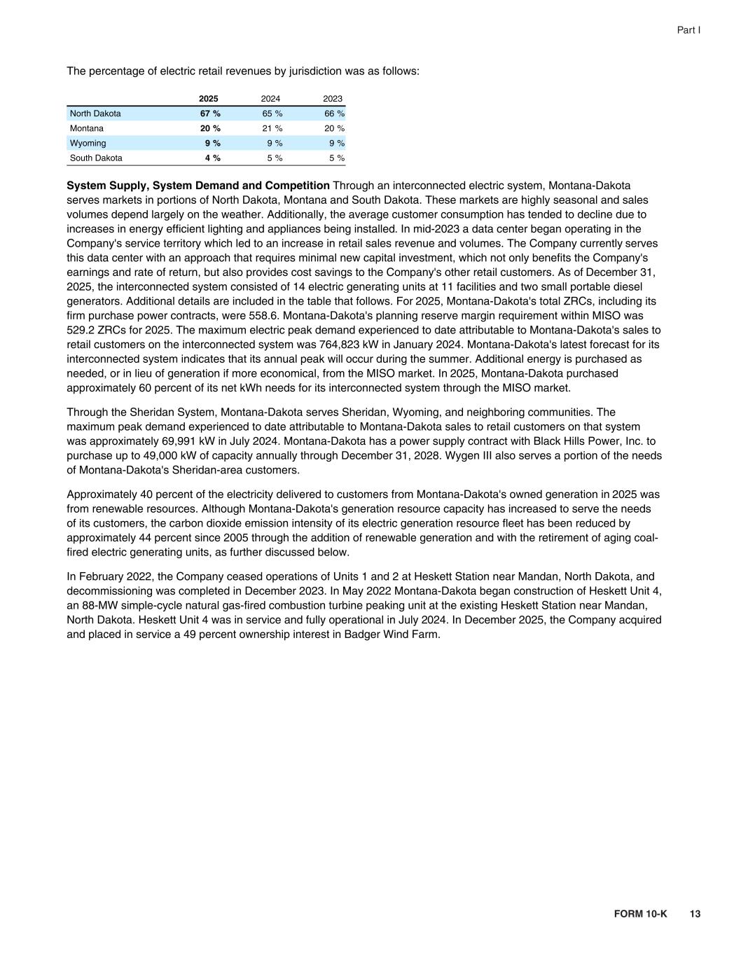 13 Part I FORM 10-K The percentage of electric retail revenues by jurisdiction was as follows: 2025 2024 2023 North Dakota 67 % 65 % 66 % Montana 20 % 21 % 20 % Wyoming 9 % 9 % 9 % South Dakota 4 % 5 % 5 % System Supply, System Demand and Competition Through an interconnected electric system, Montana-Dakota serves markets in portions of North Dakota, Montana and South Dakota. These markets are highly seasonal and sales volumes depend largely on the weather. Additionally, the average customer consumption has tended to decline due to increases in energy efficient lighting and appliances being installed. In mid-2023 a data center began operating in the Company's service territory which led to an increase in retail sales revenue and volumes. The Company currently serves this data center with an approach that requires minimal new capital investment, which not only benefits the Company's earnings and rate of return, but also provides cost savings to the Company's other retail customers. As of December 31, 2025, the interconnected system consisted of 14 electric generating units at 11 facilities and two small portable diesel generators. Additional details are included in the table that follows. For 2025, Montana-Dakota's total ZRCs, including its firm purchase power contracts, were 558.6. Montana-Dakota's planning reserve margin requirement within MISO was 529.2 ZRCs for 2025. The maximum electric peak demand experienced to date attributable to Montana-Dakota's sales to retail customers on the interconnected system was 764,823 kW in January 2024. Montana-Dakota's latest forecast for its interconnected system indicates that its annual peak will occur during the summer. Additional energy is purchased as needed, or in lieu of generation if more economical, from the MISO market. In 2025, Montana-Dakota purchased approximately 60 percent of its net kWh needs for its interconnected system through the MISO market. Through the Sheridan System, Montana-Dakota serves Sheridan, Wyoming, and neighboring communities. The maximum peak demand experienced to date attributable to Montana-Dakota sales to retail customers on that system was approximately 69,991 kW in July 2024. Montana-Dakota has a power supply contract with Black Hills Power, Inc. to purchase up to 49,000 kW of capacity annually through December 31, 2028. Wygen III also serves a portion of the needs of Montana-Dakota's Sheridan-area customers. Approximately 40 percent of the electricity delivered to customers from Montana-Dakota's owned generation in 2025 was from renewable resources. Although Montana-Dakota's generation resource capacity has increased to serve the needs of its customers, the carbon dioxide emission intensity of its electric generation resource fleet has been reduced by approximately 44 percent since 2005 through the addition of renewable generation and with the retirement of aging coal- fired electric generating units, as further discussed below. In February 2022, the Company ceased operations of Units 1 and 2 at Heskett Station near Mandan, North Dakota, and decommissioning was completed in December 2023. In May 2022 Montana-Dakota began construction of Heskett Unit 4, an 88-MW simple-cycle natural gas-fired combustion turbine peaking unit at the existing Heskett Station near Mandan, North Dakota. Heskett Unit 4 was in service and fully operational in July 2024. In December 2025, the Company acquired and placed in service a 49 percent ownership interest in Badger Wind Farm. Index Part I MDU Resources Group, Inc. Form 10-K 13