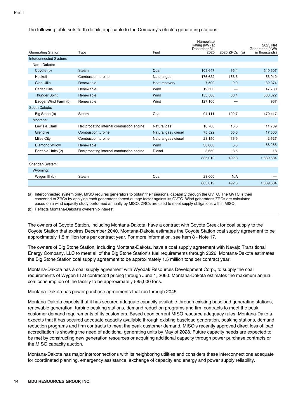 MDU RESOURCES GROUP, INC. Part I 14 The following table sets forth details applicable to the Company's electric generating stations: Generating Station Type Fuel Nameplate Rating (kW) at December 31, 2025 2025 ZRCs (a) 2025 Net Generation (kWh in thousands) Interconnected System: North Dakota: Coyote (b) Steam Coal 103,647 96.4 540,307 Heskett Combustion turbine Natural gas 176,632 158.8 58,942 Glen Ullin Renewable Heat recovery 7,500 2.9 32,374 Cedar Hills Renewable Wind 19,500 — 47,730 Thunder Spirit Renewable Wind 155,500 33.4 568,822 Badger Wind Farm (b) Renewable Wind 127,100 — 937 South Dakota: Big Stone (b) Steam Coal 94,111 102.7 470,417 Montana: Lewis & Clark Reciprocating internal combustion engine Natural gas 18,700 16.6 11,789 Glendive Combustion turbine Natural gas / diesel 75,522 55.6 17,506 Miles City Combustion turbine Natural gas / diesel 23,150 16.9 2,527 Diamond Willow Renewable Wind 30,000 5.5 88,265 Portable Units (2) Reciprocating internal combustion engine Diesel 3,650 3.5 18 835,012 492.3 1,839,634 Sheridan System: Wyoming: Wygen III (b) Steam Coal 28,000 N/A — 863,012 492.3 1,839,634 (a) Interconnected system only. MISO requires generators to obtain their seasonal capability through the GVTC. The GVTC is then converted to ZRCs by applying each generator's forced outage factor against its GVTC. Wind generator's ZRCs are calculated based on a wind capacity study performed annually by MISO. ZRCs are used to meet supply obligations within MISO. (b) Reflects Montana-Dakota's ownership interest. The owners of Coyote Station, including Montana-Dakota, have a contract with Coyote Creek for coal supply to the Coyote Station that expires December 2040. Montana-Dakota estimates the Coyote Station coal supply agreement to be approximately 1.5 million tons per contract year. For more information, see Item 8 - Note 17. The owners of Big Stone Station, including Montana-Dakota, have a coal supply agreement with Navajo Transitional Energy Company, LLC to meet all of the Big Stone Station's fuel requirements through 2026. Montana-Dakota estimates the Big Stone Station coal supply agreement to be approximately 1.5 million tons per contract year. Montana-Dakota has a coal supply agreement with Wyodak Resources Development Corp., to supply the coal requirements of Wygen III at contracted pricing through June 1, 2060. Montana-Dakota estimates the maximum annual coal consumption of the facility to be approximately 585,000 tons. Montana-Dakota has power purchase agreements that run through 2045. Montana-Dakota expects that it has secured adequate capacity available through existing baseload generating stations, renewable generation, turbine peaking stations, demand reduction programs and firm contracts to meet the peak customer demand requirements of its customers. Based upon current MISO resource adequacy rules, Montana-Dakota expects that it has secured adequate capacity available through existing baseload generation, peaking stations, demand reduction programs and firm contracts to meet the peak customer demand. MISO's recently approved direct loss of load accreditation is showing the need of additional generating units by May of 2028. Future capacity needs are expected to be met by constructing new generation resources or acquiring additional capacity through power purchase contracts or the MISO capacity auction. Montana-Dakota has major interconnections with its neighboring utilities and considers these interconnections adequate for coordinated planning, emergency assistance, exchange of capacity and energy and power supply reliability. Index Part I 14 MDU Resources Group, Inc. Form 10-K