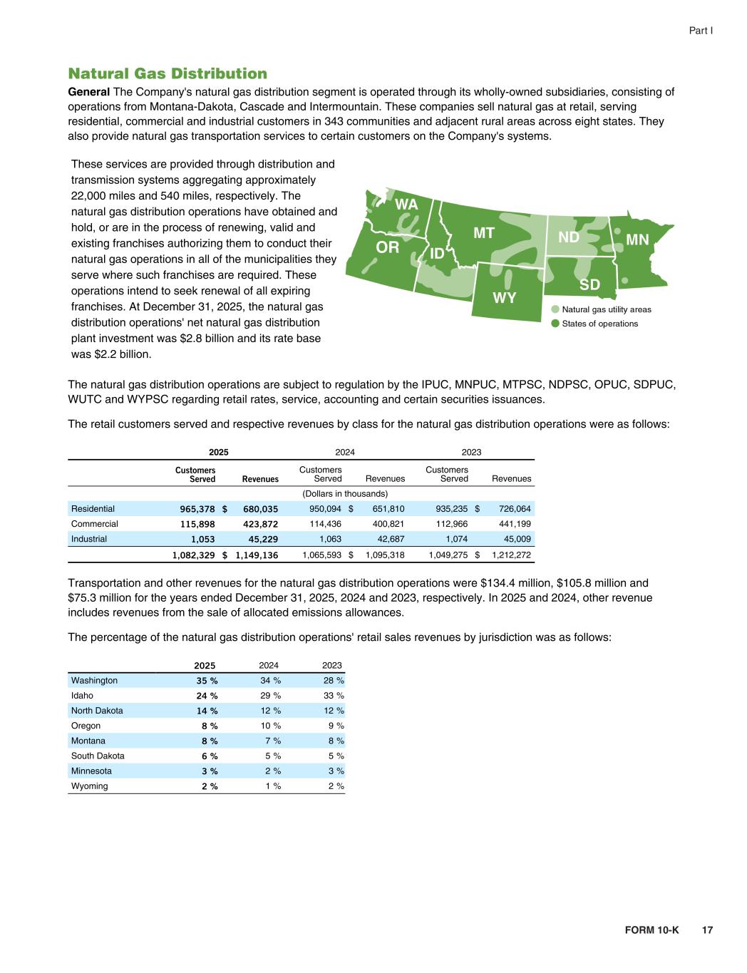 17 Part I FORM 10-K Natural Gas Distribution General The Company's natural gas distribution segment is operated through its wholly-owned subsidiaries, consisting of operations from Montana-Dakota, Cascade and Intermountain. These companies sell natural gas at retail, serving residential, commercial and industrial customers in 343 communities and adjacent rural areas across eight states. They also provide natural gas transportation services to certain customers on the Company's systems. These services are provided through distribution and transmission systems aggregating approximately 22,000 miles and 540 miles, respectively. The natural gas distribution operations have obtained and hold, or are in the process of renewing, valid and existing franchises authorizing them to conduct their natural gas operations in all of the municipalities they serve where such franchises are required. These operations intend to seek renewal of all expiring franchises. At December 31, 2025, the natural gas distribution operations' net natural gas distribution plant investment was $2.8 billion and its rate base was $2.2 billion. The natural gas distribution operations are subject to regulation by the IPUC, MNPUC, MTPSC, NDPSC, OPUC, SDPUC, WUTC and WYPSC regarding retail rates, service, accounting and certain securities issuances. The retail customers served and respective revenues by class for the natural gas distribution operations were as follows: 2025 2024 2023 Customers Served Revenues Customers Served Revenues Customers Served Revenues (Dollars in thousands) Residential 965,378 $ 680,035 950,094 $ 651,810 935,235 $ 726,064 Commercial 115,898 423,872 114,436 400,821 112,966 441,199 Industrial 1,053 45,229 1,063 42,687 1,074 45,009 1,082,329 $ 1,149,136 1,065,593 $ 1,095,318 1,049,275 $ 1,212,272 Transportation and other revenues for the natural gas distribution operations were $134.4 million, $105.8 million and $75.3 million for the years ended December 31, 2025, 2024 and 2023, respectively. In 2025 and 2024, other revenue includes revenues from the sale of allocated emissions allowances. The percentage of the natural gas distribution operations' retail sales revenues by jurisdiction was as follows: 2025 2024 2023 Washington 35 % 34 % 28 % Idaho 24 % 29 % 33 % North Dakota 14 % 12 % 12 % Oregon 8 % 10 % 9 % Montana 8 % 7 % 8 % South Dakota 6 % 5 % 5 % Minnesota 3 % 2 % 3 % Wyoming 2 % 1 % 2 % Index Part I MDU Resources Group, Inc. Form 10-K 17
