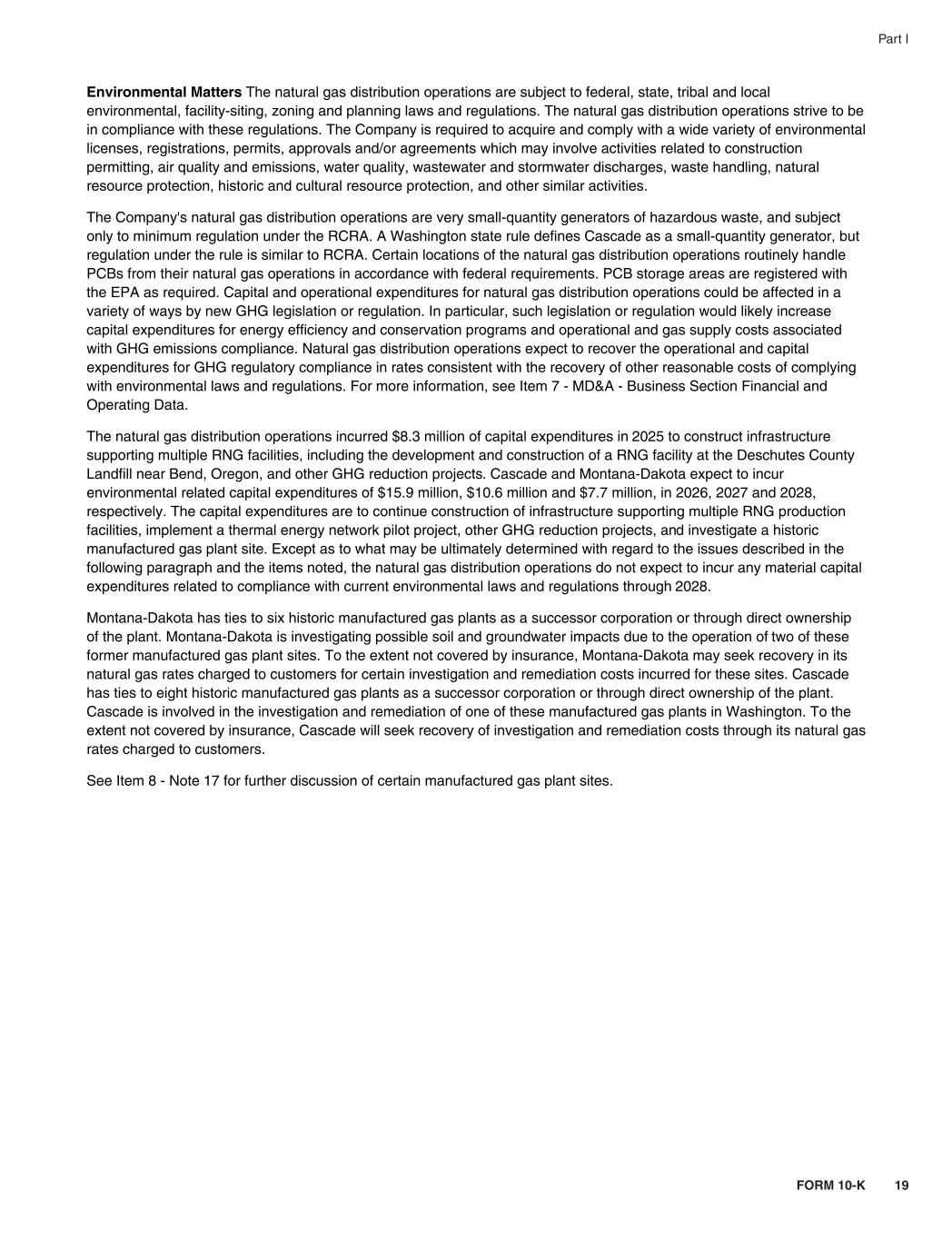 19 Part I FORM 10-K Environmental Matters The natural gas distribution operations are subject to federal, state, tribal and local environmental, facility-siting, zoning and planning laws and regulations. The natural gas distribution operations strive to be in compliance with these regulations. The Company is required to acquire and comply with a wide variety of environmental licenses, registrations, permits, approvals and/or agreements which may involve activities related to construction permitting, air quality and emissions, water quality, wastewater and stormwater discharges, waste handling, natural resource protection, historic and cultural resource protection, and other similar activities. The Company's natural gas distribution operations are very small-quantity generators of hazardous waste, and subject only to minimum regulation under the RCRA. A Washington state rule defines Cascade as a small-quantity generator, but regulation under the rule is similar to RCRA. Certain locations of the natural gas distribution operations routinely handle PCBs from their natural gas operations in accordance with federal requirements. PCB storage areas are registered with the EPA as required. Capital and operational expenditures for natural gas distribution operations could be affected in a variety of ways by new GHG legislation or regulation. In particular, such legislation or regulation would likely increase capital expenditures for energy efficiency and conservation programs and operational and gas supply costs associated with GHG emissions compliance. Natural gas distribution operations expect to recover the operational and capital expenditures for GHG regulatory compliance in rates consistent with the recovery of other reasonable costs of complying with environmental laws and regulations. For more information, see Item 7 - MD&A - Business Section Financial and Operating Data. The natural gas distribution operations incurred $8.3 million of capital expenditures in 2025 to construct infrastructure supporting multiple RNG facilities, including the development and construction of a RNG facility at the Deschutes County Landfill near Bend, Oregon, and other GHG reduction projects. Cascade and Montana-Dakota expect to incur environmental related capital expenditures of $15.9 million, $10.6 million and $7.7 million, in 2026, 2027 and 2028, respectively. The capital expenditures are to continue construction of infrastructure supporting multiple RNG production facilities, implement a thermal energy network pilot project, other GHG reduction projects, and investigate a historic manufactured gas plant site. Except as to what may be ultimately determined with regard to the issues described in the following paragraph and the items noted, the natural gas distribution operations do not expect to incur any material capital expenditures related to compliance with current environmental laws and regulations through 2028. Montana-Dakota has ties to six historic manufactured gas plants as a successor corporation or through direct ownership of the plant. Montana-Dakota is investigating possible soil and groundwater impacts due to the operation of two of these former manufactured gas plant sites. To the extent not covered by insurance, Montana-Dakota may seek recovery in its natural gas rates charged to customers for certain investigation and remediation costs incurred for these sites. Cascade has ties to eight historic manufactured gas plants as a successor corporation or through direct ownership of the plant. Cascade is involved in the investigation and remediation of one of these manufactured gas plants in Washington. To the extent not covered by insurance, Cascade will seek recovery of investigation and remediation costs through its natural gas rates charged to customers. See Item 8 - Note 17 for further discussion of certain manufactured gas plant sites. Index Part I MDU Resources Group, Inc. Form 10-K 19