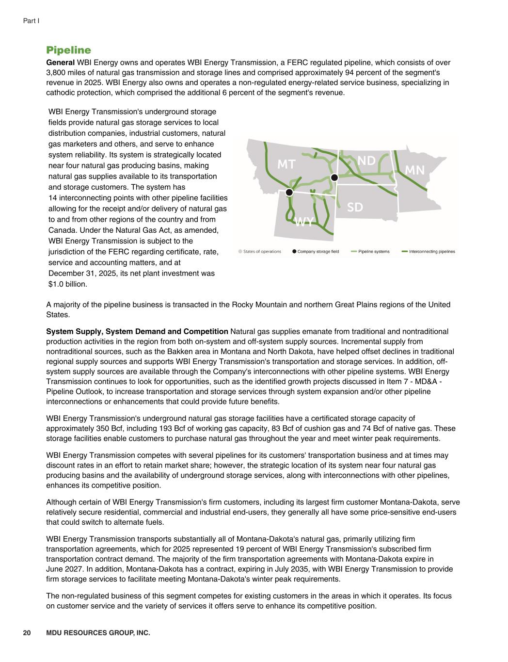 MDU RESOURCES GROUP, INC. Part I 20 Pipeline General WBI Energy owns and operates WBI Energy Transmission, a FERC regulated pipeline, which consists of over 3,800 miles of natural gas transmission and storage lines and comprised approximately 94 percent of the segment's revenue in 2025. WBI Energy also owns and operates a non-regulated energy-related service business, specializing in cathodic protection, which comprised the additional 6 percent of the segment's revenue. WBI Energy Transmission's underground storage fields provide natural gas storage services to local distribution companies, industrial customers, natural gas marketers and others, and serve to enhance system reliability. Its system is strategically located near four natural gas producing basins, making natural gas supplies available to its transportation and storage customers. The system has 14 interconnecting points with other pipeline facilities allowing for the receipt and/or delivery of natural gas to and from other regions of the country and from Canada. Under the Natural Gas Act, as amended, WBI Energy Transmission is subject to the jurisdiction of the FERC regarding certificate, rate, service and accounting matters, and at December 31, 2025, its net plant investment was $1.0 billion. A majority of the pipeline business is transacted in the Rocky Mountain and northern Great Plains regions of the United States. System Supply, System Demand and Competition Natural gas supplies emanate from traditional and nontraditional production activities in the region from both on-system and off-system supply sources. Incremental supply from nontraditional sources, such as the Bakken area in Montana and North Dakota, have helped offset declines in traditional regional supply sources and supports WBI Energy Transmission's transportation and storage services. In addition, off- system supply sources are available through the Company's interconnections with other pipeline systems. WBI Energy Transmission continues to look for opportunities, such as the identified growth projects discussed in Item 7 - MD&A - Pipeline Outlook, to increase transportation and storage services through system expansion and/or other pipeline interconnections or enhancements that could provide future benefits. WBI Energy Transmission's underground natural gas storage facilities have a certificated storage capacity of approximately 350 Bcf, including 193 Bcf of working gas capacity, 83 Bcf of cushion gas and 74 Bcf of native gas. These storage facilities enable customers to purchase natural gas throughout the year and meet winter peak requirements. WBI Energy Transmission competes with several pipelines for its customers' transportation business and at times may discount rates in an effort to retain market share; however, the strategic location of its system near four natural gas producing basins and the availability of underground storage services, along with interconnections with other pipelines, enhances its competitive position. Although certain of WBI Energy Transmission's firm customers, including its largest firm customer Montana-Dakota, serve relatively secure residential, commercial and industrial end-users, they generally all have some price-sensitive end-users that could switch to alternate fuels. WBI Energy Transmission transports substantially all of Montana-Dakota's natural gas, primarily utilizing firm transportation agreements, which for 2025 represented 19 percent of WBI Energy Transmission's subscribed firm transportation contract demand. The majority of the firm transportation agreements with Montana-Dakota expire in June 2027. In addition, Montana-Dakota has a contract, expiring in July 2035, with WBI Energy Transmission to provide firm storage services to facilitate meeting Montana-Dakota's winter peak requirements. The non-regulated business of this segment competes for existing customers in the areas in which it operates. Its focus on customer service and the variety of services it offers serve to enhance its competitive position. Index Part I 20 MDU Resources Group, Inc. Form 10-K