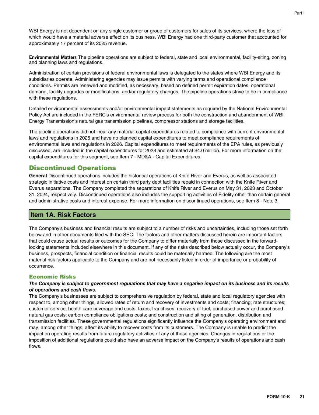 21 Part I FORM 10-K WBI Energy is not dependent on any single customer or group of customers for sales of its services, where the loss of which would have a material adverse effect on its business. WBI Energy had one third-party customer that accounted for approximately 17 percent of its 2025 revenue. Environmental Matters The pipeline operations are subject to federal, state and local environmental, facility-siting, zoning and planning laws and regulations. Administration of certain provisions of federal environmental laws is delegated to the states where WBI Energy and its subsidiaries operate. Administering agencies may issue permits with varying terms and operational compliance conditions. Permits are renewed and modified, as necessary, based on defined permit expiration dates, operational demand, facility upgrades or modifications, and/or regulatory changes. The pipeline operations strive to be in compliance with these regulations. Detailed environmental assessments and/or environmental impact statements as required by the National Environmental Policy Act are included in the FERC's environmental review process for both the construction and abandonment of WBI Energy Transmission's natural gas transmission pipelines, compressor stations and storage facilities. The pipeline operations did not incur any material capital expenditures related to compliance with current environmental laws and regulations in 2025 and have no planned capital expenditures to meet compliance requirements of environmental laws and regulations in 2026. Capital expenditures to meet requirements of the EPA rules, as previously discussed, are included in the capital expenditures for 2028 and estimated at $4.0 million. For more information on the capital expenditures for this segment, see Item 7 - MD&A - Capital Expenditures. Discontinued Operations General Discontinued operations includes the historical operations of Knife River and Everus, as well as associated strategic initiative costs and interest on certain third party debt facilities repaid in connection with the Knife River and Everus separations. The Company completed the separations of Knife River and Everus on May 31, 2023 and October 31, 2024, respectively. Discontinued operations also includes the supporting activities of Fidelity other than certain general and administrative costs and interest expense. For more information on discontinued operations, see Item 8 - Note 3. Item 1A. Risk Factors The Company's business and financial results are subject to a number of risks and uncertainties, including those set forth below and in other documents filed with the SEC. The factors and other matters discussed herein are important factors that could cause actual results or outcomes for the Company to differ materially from those discussed in the forward- looking statements included elsewhere in this document. If any of the risks described below actually occur, the Company's business, prospects, financial condition or financial results could be materially harmed. The following are the most material risk factors applicable to the Company and are not necessarily listed in order of importance or probability of occurrence. Economic Risks The Company is subject to government regulations that may have a negative impact on its business and its results of operations and cash flows. The Company's businesses are subject to comprehensive regulation by federal, state and local regulatory agencies with respect to, among other things, allowed rates of return and recovery of investments and costs; financing; rate structures; customer service; health care coverage and costs; taxes; franchises; recovery of fuel, purchased power and purchased natural gas costs; carbon compliance obligations costs; and construction and siting of generation, distribution and transmission facilities. These governmental regulations significantly influence the Company's operating environment and may, among other things, affect its ability to recover costs from its customers. The Company is unable to predict the impact on operating results from future regulatory activities of any of these agencies. Changes in regulations or the imposition of additional regulations could also have an adverse impact on the Company's results of operations and cash flows. Index Part I MDU Resources Group, Inc. Form 10-K 21