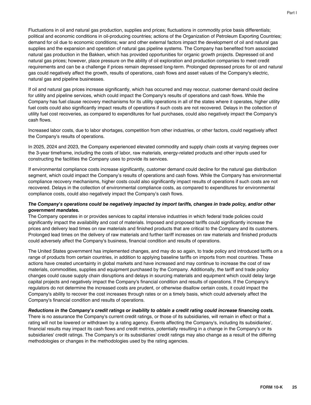 25 Part I FORM 10-K Fluctuations in oil and natural gas production, supplies and prices; fluctuations in commodity price basis differentials; political and economic conditions in oil-producing countries; actions of the Organization of Petroleum Exporting Countries; demand for oil due to economic conditions; war and other external factors impact the development of oil and natural gas supplies and the expansion and operation of natural gas pipeline systems. The Company has benefited from associated natural gas production in the Bakken, which has provided opportunities for organic growth projects. Depressed oil and natural gas prices; however, place pressure on the ability of oil exploration and production companies to meet credit requirements and can be a challenge if prices remain depressed long-term. Prolonged depressed prices for oil and natural gas could negatively affect the growth, results of operations, cash flows and asset values of the Company's electric, natural gas and pipeline businesses. If oil and natural gas prices increase significantly, which has occurred and may reoccur, customer demand could decline for utility and pipeline services, which could impact the Company's results of operations and cash flows. While the Company has fuel clause recovery mechanisms for its utility operations in all of the states where it operates, higher utility fuel costs could also significantly impact results of operations if such costs are not recovered. Delays in the collection of utility fuel cost recoveries, as compared to expenditures for fuel purchases, could also negatively impact the Company's cash flows. Increased labor costs, due to labor shortages, competition from other industries, or other factors, could negatively affect the Company's results of operations. In 2025, 2024 and 2023, the Company experienced elevated commodity and supply chain costs at varying degrees over the 3-year timeframe, including the costs of labor, raw materials, energy-related products and other inputs used for constructing the facilities the Company uses to provide its services. If environmental compliance costs increase significantly, customer demand could decline for the natural gas distribution segment, which could impact the Company’s results of operations and cash flows. While the Company has environmental compliance recovery mechanisms, higher costs could also significantly impact results of operations if such costs are not recovered. Delays in the collection of environmental compliance costs, as compared to expenditures for environmental compliance costs, could also negatively impact the Company’s cash flows. The Company's operations could be negatively impacted by import tariffs, changes in trade policy, and/or other government mandates. The Company operates in or provides services to capital intensive industries in which federal trade policies could significantly impact the availability and cost of materials. Imposed and proposed tariffs could significantly increase the prices and delivery lead times on raw materials and finished products that are critical to the Company and its customers. Prolonged lead times on the delivery of raw materials and further tariff increases on raw materials and finished products could adversely affect the Company's business, financial condition and results of operations. The United States government has implemented changes, and may do so again, to trade policy and introduced tariffs on a range of products from certain countries, in addition to applying baseline tariffs on imports from most countries. These actions have created uncertainty in global markets and have increased and may continue to increase the cost of raw materials, commodities, supplies and equipment purchased by the Company. Additionally, the tariff and trade policy changes could cause supply chain disruptions and delays in sourcing materials and equipment which could delay large capital projects and negatively impact the Company's financial condition and results of operations. If the Company's regulators do not determine the increased costs are prudent, or otherwise disallow certain costs, it could impact the Company's ability to recover the cost increases through rates or on a timely basis, which could adversely affect the Company's financial condition and results of operations. Reductions in the Company's credit ratings or inability to obtain a credit rating could increase financing costs. There is no assurance the Company's current credit ratings, or those of its subsidiaries, will remain in effect or that a rating will not be lowered or withdrawn by a rating agency. Events affecting the Company's, including its subsidiaries', financial results may impact its cash flows and credit metrics, potentially resulting in a change in the Company's or its subsidiaries' credit ratings. The Company's or its subsidiaries' credit ratings may also change as a result of the differing methodologies or changes in the methodologies used by the rating agencies. Index Part I MDU Resources Group, Inc. Form 10-K 25