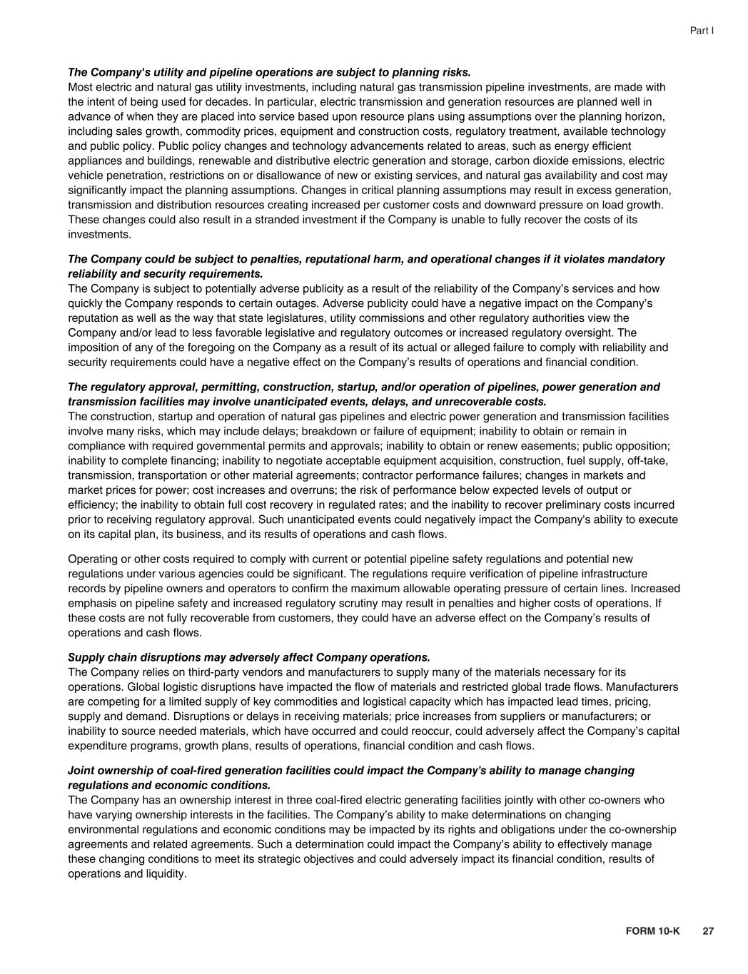 27 Part I FORM 10-K The Company's utility and pipeline operations are subject to planning risks. Most electric and natural gas utility investments, including natural gas transmission pipeline investments, are made with the intent of being used for decades. In particular, electric transmission and generation resources are planned well in advance of when they are placed into service based upon resource plans using assumptions over the planning horizon, including sales growth, commodity prices, equipment and construction costs, regulatory treatment, available technology and public policy. Public policy changes and technology advancements related to areas, such as energy efficient appliances and buildings, renewable and distributive electric generation and storage, carbon dioxide emissions, electric vehicle penetration, restrictions on or disallowance of new or existing services, and natural gas availability and cost may significantly impact the planning assumptions. Changes in critical planning assumptions may result in excess generation, transmission and distribution resources creating increased per customer costs and downward pressure on load growth. These changes could also result in a stranded investment if the Company is unable to fully recover the costs of its investments. The Company could be subject to penalties, reputational harm, and operational changes if it violates mandatory reliability and security requirements. The Company is subject to potentially adverse publicity as a result of the reliability of the Company’s services and how quickly the Company responds to certain outages. Adverse publicity could have a negative impact on the Company’s reputation as well as the way that state legislatures, utility commissions and other regulatory authorities view the Company and/or lead to less favorable legislative and regulatory outcomes or increased regulatory oversight. The imposition of any of the foregoing on the Company as a result of its actual or alleged failure to comply with reliability and security requirements could have a negative effect on the Company’s results of operations and financial condition. The regulatory approval, permitting, construction, startup, and/or operation of pipelines, power generation and transmission facilities may involve unanticipated events, delays, and unrecoverable costs. The construction, startup and operation of natural gas pipelines and electric power generation and transmission facilities involve many risks, which may include delays; breakdown or failure of equipment; inability to obtain or remain in compliance with required governmental permits and approvals; inability to obtain or renew easements; public opposition; inability to complete financing; inability to negotiate acceptable equipment acquisition, construction, fuel supply, off-take, transmission, transportation or other material agreements; contractor performance failures; changes in markets and market prices for power; cost increases and overruns; the risk of performance below expected levels of output or efficiency; the inability to obtain full cost recovery in regulated rates; and the inability to recover preliminary costs incurred prior to receiving regulatory approval. Such unanticipated events could negatively impact the Company's ability to execute on its capital plan, its business, and its results of operations and cash flows. Operating or other costs required to comply with current or potential pipeline safety regulations and potential new regulations under various agencies could be significant. The regulations require verification of pipeline infrastructure records by pipeline owners and operators to confirm the maximum allowable operating pressure of certain lines. Increased emphasis on pipeline safety and increased regulatory scrutiny may result in penalties and higher costs of operations. If these costs are not fully recoverable from customers, they could have an adverse effect on the Company’s results of operations and cash flows. Supply chain disruptions may adversely affect Company operations. The Company relies on third-party vendors and manufacturers to supply many of the materials necessary for its operations. Global logistic disruptions have impacted the flow of materials and restricted global trade flows. Manufacturers are competing for a limited supply of key commodities and logistical capacity which has impacted lead times, pricing, supply and demand. Disruptions or delays in receiving materials; price increases from suppliers or manufacturers; or inability to source needed materials, which have occurred and could reoccur, could adversely affect the Company’s capital expenditure programs, growth plans, results of operations, financial condition and cash flows. Joint ownership of coal-fired generation facilities could impact the Company’s ability to manage changing regulations and economic conditions. The Company has an ownership interest in three coal-fired electric generating facilities jointly with other co-owners who have varying ownership interests in the facilities. The Company’s ability to make determinations on changing environmental regulations and economic conditions may be impacted by its rights and obligations under the co-ownership agreements and related agreements. Such a determination could impact the Company’s ability to effectively manage these changing conditions to meet its strategic objectives and could adversely impact its financial condition, results of operations and liquidity. Index Part I MDU Resources Group, Inc. Form 10-K 27