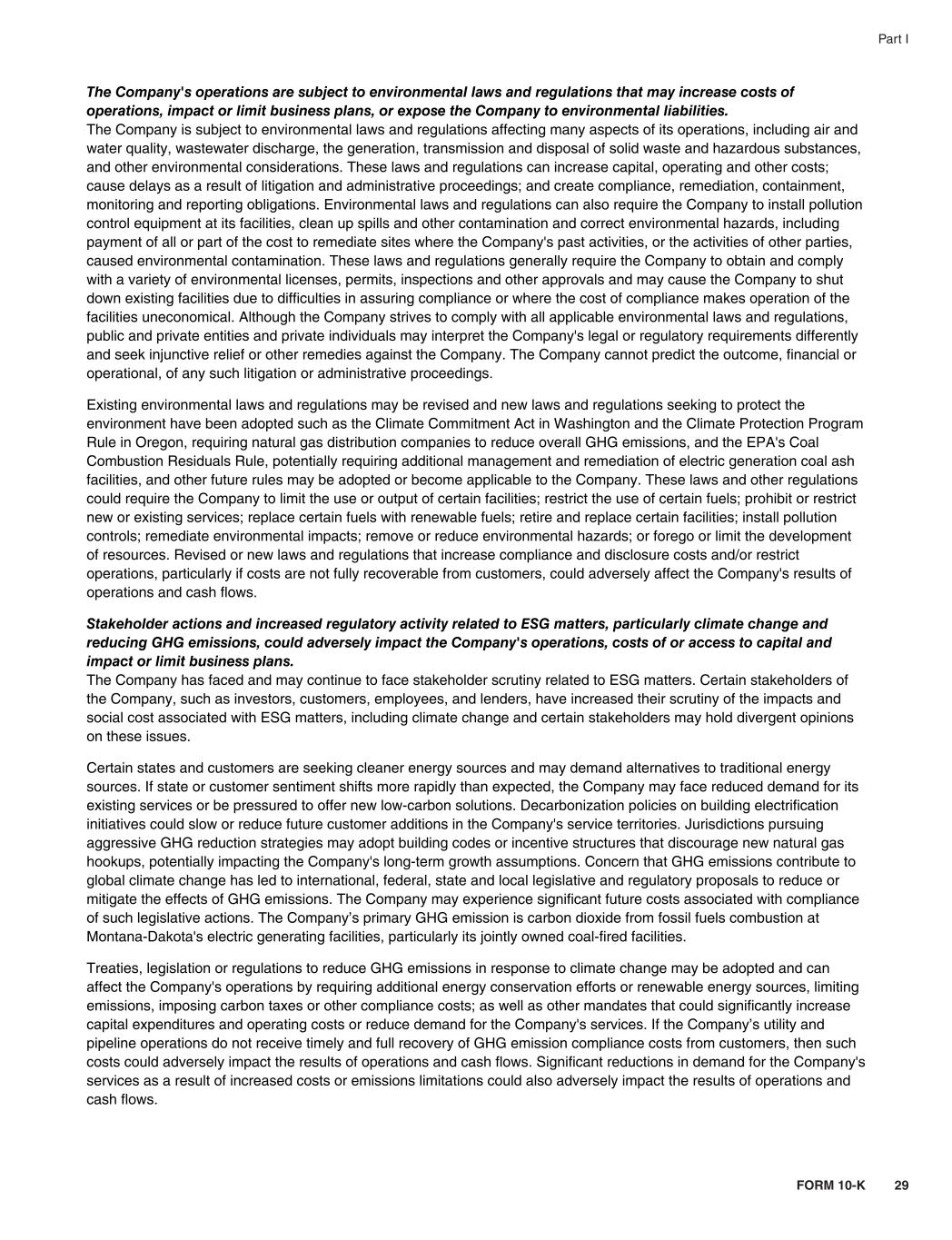29 Part I FORM 10-K The Company's operations are subject to environmental laws and regulations that may increase costs of operations, impact or limit business plans, or expose the Company to environmental liabilities. The Company is subject to environmental laws and regulations affecting many aspects of its operations, including air and water quality, wastewater discharge, the generation, transmission and disposal of solid waste and hazardous substances, and other environmental considerations. These laws and regulations can increase capital, operating and other costs; cause delays as a result of litigation and administrative proceedings; and create compliance, remediation, containment, monitoring and reporting obligations. Environmental laws and regulations can also require the Company to install pollution control equipment at its facilities, clean up spills and other contamination and correct environmental hazards, including payment of all or part of the cost to remediate sites where the Company's past activities, or the activities of other parties, caused environmental contamination. These laws and regulations generally require the Company to obtain and comply with a variety of environmental licenses, permits, inspections and other approvals and may cause the Company to shut down existing facilities due to difficulties in assuring compliance or where the cost of compliance makes operation of the facilities uneconomical. Although the Company strives to comply with all applicable environmental laws and regulations, public and private entities and private individuals may interpret the Company's legal or regulatory requirements differently and seek injunctive relief or other remedies against the Company. The Company cannot predict the outcome, financial or operational, of any such litigation or administrative proceedings. Existing environmental laws and regulations may be revised and new laws and regulations seeking to protect the environment have been adopted such as the Climate Commitment Act in Washington and the Climate Protection Program Rule in Oregon, requiring natural gas distribution companies to reduce overall GHG emissions, and the EPA's Coal Combustion Residuals Rule, potentially requiring additional management and remediation of electric generation coal ash facilities, and other future rules may be adopted or become applicable to the Company. These laws and other regulations could require the Company to limit the use or output of certain facilities; restrict the use of certain fuels; prohibit or restrict new or existing services; replace certain fuels with renewable fuels; retire and replace certain facilities; install pollution controls; remediate environmental impacts; remove or reduce environmental hazards; or forego or limit the development of resources. Revised or new laws and regulations that increase compliance and disclosure costs and/or restrict operations, particularly if costs are not fully recoverable from customers, could adversely affect the Company's results of operations and cash flows. Stakeholder actions and increased regulatory activity related to ESG matters, particularly climate change and reducing GHG emissions, could adversely impact the Company's operations, costs of or access to capital and impact or limit business plans. The Company has faced and may continue to face stakeholder scrutiny related to ESG matters. Certain stakeholders of the Company, such as investors, customers, employees, and lenders, have increased their scrutiny of the impacts and social cost associated with ESG matters, including climate change and certain stakeholders may hold divergent opinions on these issues. Certain states and customers are seeking cleaner energy sources and may demand alternatives to traditional energy sources. If state or customer sentiment shifts more rapidly than expected, the Company may face reduced demand for its existing services or be pressured to offer new low-carbon solutions. Decarbonization policies on building electrification initiatives could slow or reduce future customer additions in the Company's service territories. Jurisdictions pursuing aggressive GHG reduction strategies may adopt building codes or incentive structures that discourage new natural gas hookups, potentially impacting the Company's long-term growth assumptions. Concern that GHG emissions contribute to global climate change has led to international, federal, state and local legislative and regulatory proposals to reduce or mitigate the effects of GHG emissions. The Company may experience significant future costs associated with compliance of such legislative actions. The Company’s primary GHG emission is carbon dioxide from fossil fuels combustion at Montana-Dakota's electric generating facilities, particularly its jointly owned coal-fired facilities. Treaties, legislation or regulations to reduce GHG emissions in response to climate change may be adopted and can affect the Company's operations by requiring additional energy conservation efforts or renewable energy sources, limiting emissions, imposing carbon taxes or other compliance costs; as well as other mandates that could significantly increase capital expenditures and operating costs or reduce demand for the Company's services. If the Company’s utility and pipeline operations do not receive timely and full recovery of GHG emission compliance costs from customers, then such costs could adversely impact the results of operations and cash flows. Significant reductions in demand for the Company's services as a result of increased costs or emissions limitations could also adversely impact the results of operations and cash flows. Index Part I MDU Resources Group, Inc. Form 10-K 29