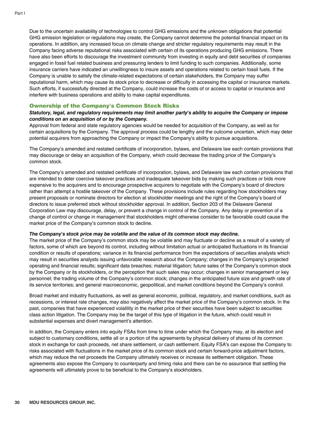 MDU RESOURCES GROUP, INC. Part I 30 Due to the uncertain availability of technologies to control GHG emissions and the unknown obligations that potential GHG emission legislation or regulations may create, the Company cannot determine the potential financial impact on its operations. In addition, any increased focus on climate change and stricter regulatory requirements may result in the Company facing adverse reputational risks associated with certain of its operations producing GHG emissions. There have also been efforts to discourage the investment community from investing in equity and debt securities of companies engaged in fossil fuel related business and pressuring lenders to limit funding to such companies. Additionally, some insurance carriers have indicated an unwillingness to insure assets and operations related to certain fossil fuels. If the Company is unable to satisfy the climate-related expectations of certain stakeholders, the Company may suffer reputational harm, which may cause its stock price to decrease or difficulty in accessing the capital or insurance markets. Such efforts, if successfully directed at the Company, could increase the costs of or access to capital or insurance and interfere with business operations and ability to make capital expenditures. Ownership of the Company's Common Stock Risks Statutory, legal, and regulatory requirements may limit another party's ability to acquire the Company or impose conditions on an acquisition of or by the Company. Approval from federal and state regulatory agencies would be needed for acquisition of the Company, as well as for certain acquisitions by the Company. The approval process could be lengthy and the outcome uncertain, which may deter potential acquirers from approaching the Company or impact the Company's ability to pursue acquisitions. The Company’s amended and restated certificate of incorporation, bylaws, and Delaware law each contain provisions that may discourage or delay an acquisition of the Company, which could decrease the trading price of the Company’s common stock. The Company’s amended and restated certificate of incorporation, bylaws, and Delaware law each contain provisions that are intended to deter coercive takeover practices and inadequate takeover bids by making such practices or bids more expensive to the acquirers and to encourage prospective acquirers to negotiate with the Company’s board of directors rather than attempt a hostile takeover of the Company. These provisions include rules regarding how stockholders may present proposals or nominate directors for election at stockholder meetings and the right of the Company’s board of directors to issue preferred stock without stockholder approval. In addition, Section 203 of the Delaware General Corporation Law may discourage, delay, or prevent a change in control of the Company. Any delay or prevention of a change of control or change in management that stockholders might otherwise consider to be favorable could cause the market price of the Company’s common stock to decline. The Company's stock price may be volatile and the value of its common stock may decline. The market price of the Company’s common stock may be volatile and may fluctuate or decline as a result of a variety of factors, some of which are beyond its control, including without limitation actual or anticipated fluctuations in its financial condition or results of operations; variance in its financial performance from the expectations of securities analysts which may result in securities analysts issuing unfavorable research about the Company; changes in the Company’s projected operating and financial results; significant data breaches; material litigation; future sales of the Company’s common stock by the Company or its stockholders, or the perception that such sales may occur; changes in senior management or key personnel; the trading volume of the Company’s common stock; changes in the anticipated future size and growth rate of its service territories; and general macroeconomic, geopolitical, and market conditions beyond the Company’s control. Broad market and industry fluctuations, as well as general economic, political, regulatory, and market conditions, such as recessions, or interest rate changes, may also negatively affect the market price of the Company’s common stock. In the past, companies that have experienced volatility in the market price of their securities have been subject to securities class action litigation. The Company may be the target of this type of litigation in the future, which could result in substantial expenses and divert management’s attention. In addition, the Company enters into equity FSAs from time to time under which the Company may, at its election and subject to customary conditions, settle all or a portion of the agreements by physical delivery of shares of its common stock in exchange for cash proceeds, net share settlement, or cash settlement. Equity FSA's can expose the Company to risks associated with fluctuations in the market price of its common stock and certain forward-price adjustment factors, which may reduce the net proceeds the Company ultimately receives or increase its settlement obligation. These agreements also expose the Company to counterparty and timing risks and there can be no assurance that settling the agreements will ultimately prove to be beneficial to the Company's stockholders. Index Part I 30 MDU Resources Group, Inc. Form 10-K