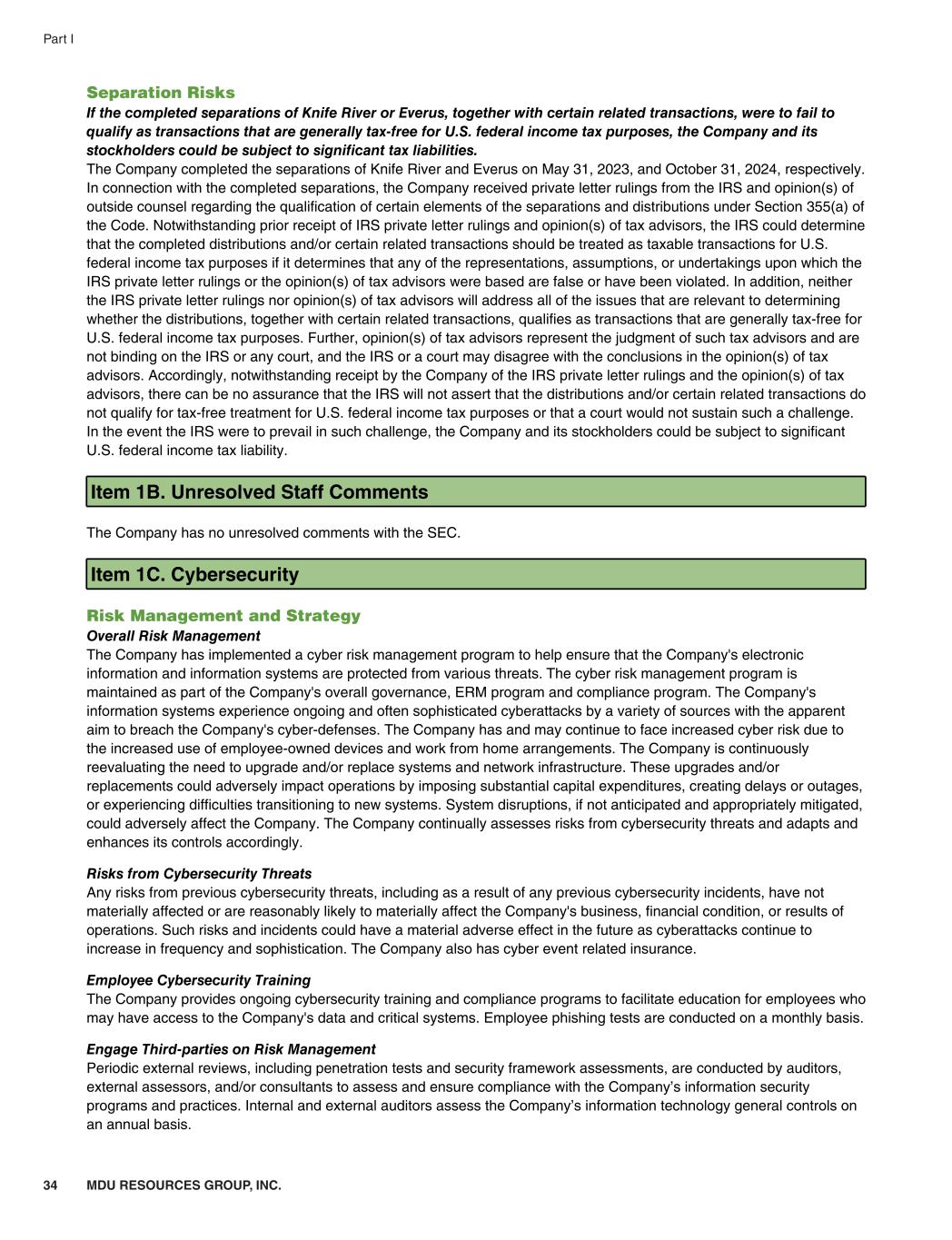 MDU RESOURCES GROUP, INC. Part I 34 Separation Risks If the completed separations of Knife River or Everus, together with certain related transactions, were to fail to qualify as transactions that are generally tax-free for U.S. federal income tax purposes, the Company and its stockholders could be subject to significant tax liabilities. The Company completed the separations of Knife River and Everus on May 31, 2023, and October 31, 2024, respectively. In connection with the completed separations, the Company received private letter rulings from the IRS and opinion(s) of outside counsel regarding the qualification of certain elements of the separations and distributions under Section 355(a) of the Code. Notwithstanding prior receipt of IRS private letter rulings and opinion(s) of tax advisors, the IRS could determine that the completed distributions and/or certain related transactions should be treated as taxable transactions for U.S. federal income tax purposes if it determines that any of the representations, assumptions, or undertakings upon which the IRS private letter rulings or the opinion(s) of tax advisors were based are false or have been violated. In addition, neither the IRS private letter rulings nor opinion(s) of tax advisors will address all of the issues that are relevant to determining whether the distributions, together with certain related transactions, qualifies as transactions that are generally tax-free for U.S. federal income tax purposes. Further, opinion(s) of tax advisors represent the judgment of such tax advisors and are not binding on the IRS or any court, and the IRS or a court may disagree with the conclusions in the opinion(s) of tax advisors. Accordingly, notwithstanding receipt by the Company of the IRS private letter rulings and the opinion(s) of tax advisors, there can be no assurance that the IRS will not assert that the distributions and/or certain related transactions do not qualify for tax-free treatment for U.S. federal income tax purposes or that a court would not sustain such a challenge. In the event the IRS were to prevail in such challenge, the Company and its stockholders could be subject to significant U.S. federal income tax liability. Item 1B. Unresolved Staff Comments The Company has no unresolved comments with the SEC. Item 1C. Cybersecurity Risk Management and Strategy Overall Risk Management The Company has implemented a cyber risk management program to help ensure that the Company's electronic information and information systems are protected from various threats. The cyber risk management program is maintained as part of the Company's overall governance, ERM program and compliance program. The Company's information systems experience ongoing and often sophisticated cyberattacks by a variety of sources with the apparent aim to breach the Company's cyber-defenses. The Company has and may continue to face increased cyber risk due to the increased use of employee-owned devices and work from home arrangements. The Company is continuously reevaluating the need to upgrade and/or replace systems and network infrastructure. These upgrades and/or replacements could adversely impact operations by imposing substantial capital expenditures, creating delays or outages, or experiencing difficulties transitioning to new systems. System disruptions, if not anticipated and appropriately mitigated, could adversely affect the Company. The Company continually assesses risks from cybersecurity threats and adapts and enhances its controls accordingly. Risks from Cybersecurity Threats Any risks from previous cybersecurity threats, including as a result of any previous cybersecurity incidents, have not materially affected or are reasonably likely to materially affect the Company's business, financial condition, or results of operations. Such risks and incidents could have a material adverse effect in the future as cyberattacks continue to increase in frequency and sophistication. The Company also has cyber event related insurance. Employee Cybersecurity Training The Company provides ongoing cybersecurity training and compliance programs to facilitate education for employees who may have access to the Company's data and critical systems. Employee phishing tests are conducted on a monthly basis. Engage Third-parties on Risk Management Periodic external reviews, including penetration tests and security framework assessments, are conducted by auditors, external assessors, and/or consultants to assess and ensure compliance with the Company’s information security programs and practices. Internal and external auditors assess the Company’s information technology general controls on an annual basis. Index Part I 34 MDU Resources Group, Inc. Form 10-K