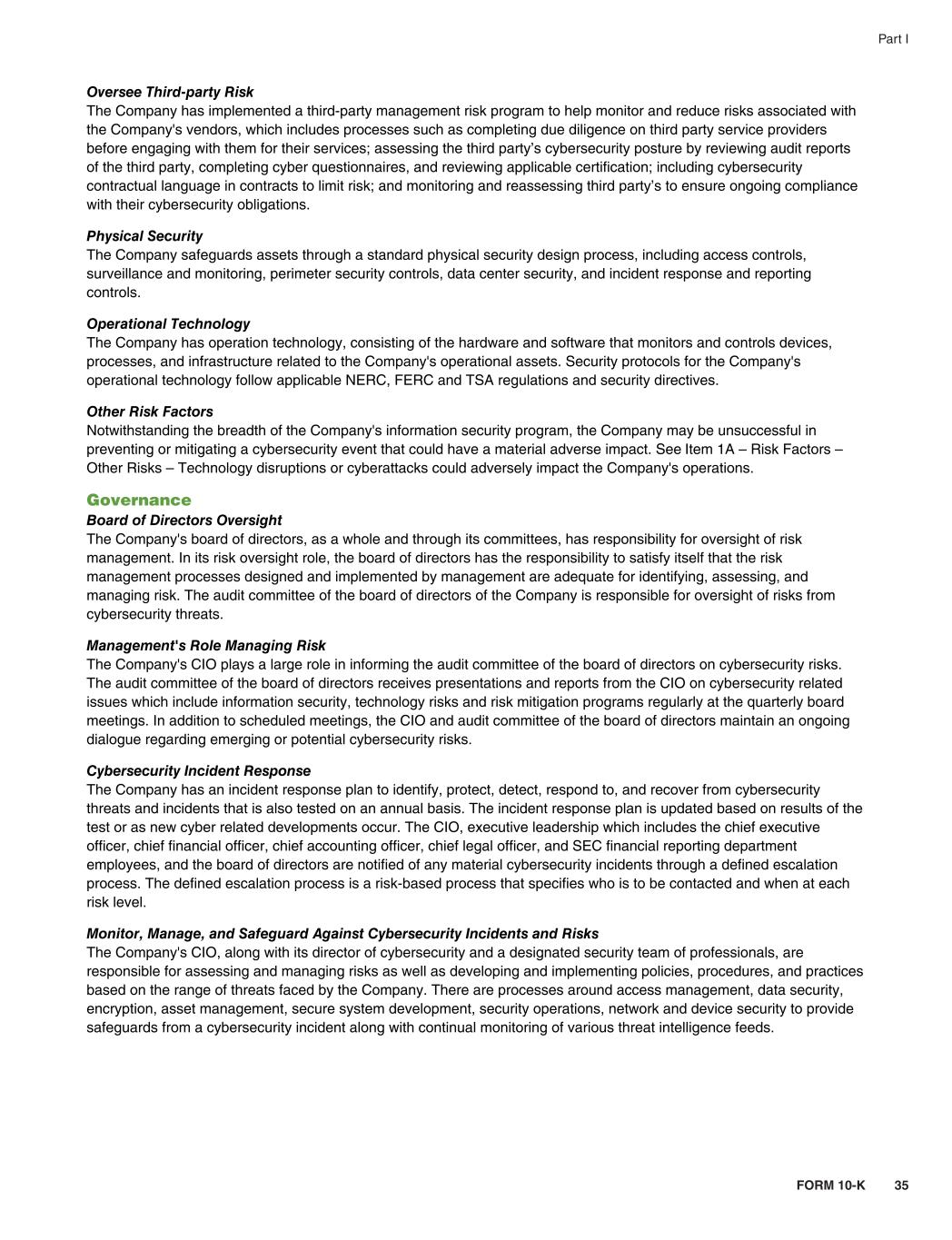35 Part I FORM 10-K Oversee Third-party Risk The Company has implemented a third-party management risk program to help monitor and reduce risks associated with the Company's vendors, which includes processes such as completing due diligence on third party service providers before engaging with them for their services; assessing the third party’s cybersecurity posture by reviewing audit reports of the third party, completing cyber questionnaires, and reviewing applicable certification; including cybersecurity contractual language in contracts to limit risk; and monitoring and reassessing third party’s to ensure ongoing compliance with their cybersecurity obligations. Physical Security The Company safeguards assets through a standard physical security design process, including access controls, surveillance and monitoring, perimeter security controls, data center security, and incident response and reporting controls. Operational Technology The Company has operation technology, consisting of the hardware and software that monitors and controls devices, processes, and infrastructure related to the Company's operational assets. Security protocols for the Company's operational technology follow applicable NERC, FERC and TSA regulations and security directives. Other Risk Factors Notwithstanding the breadth of the Company's information security program, the Company may be unsuccessful in preventing or mitigating a cybersecurity event that could have a material adverse impact. See Item 1A – Risk Factors – Other Risks – Technology disruptions or cyberattacks could adversely impact the Company's operations. Governance Board of Directors Oversight The Company's board of directors, as a whole and through its committees, has responsibility for oversight of risk management. In its risk oversight role, the board of directors has the responsibility to satisfy itself that the risk management processes designed and implemented by management are adequate for identifying, assessing, and managing risk. The audit committee of the board of directors of the Company is responsible for oversight of risks from cybersecurity threats. Management's Role Managing Risk The Company's CIO plays a large role in informing the audit committee of the board of directors on cybersecurity risks. The audit committee of the board of directors receives presentations and reports from the CIO on cybersecurity related issues which include information security, technology risks and risk mitigation programs regularly at the quarterly board meetings. In addition to scheduled meetings, the CIO and audit committee of the board of directors maintain an ongoing dialogue regarding emerging or potential cybersecurity risks. Cybersecurity Incident Response The Company has an incident response plan to identify, protect, detect, respond to, and recover from cybersecurity threats and incidents that is also tested on an annual basis. The incident response plan is updated based on results of the test or as new cyber related developments occur. The CIO, executive leadership which includes the chief executive officer, chief financial officer, chief accounting officer, chief legal officer, and SEC financial reporting department employees, and the board of directors are notified of any material cybersecurity incidents through a defined escalation process. The defined escalation process is a risk-based process that specifies who is to be contacted and when at each risk level. Monitor, Manage, and Safeguard Against Cybersecurity Incidents and Risks The Company's CIO, along with its director of cybersecurity and a designated security team of professionals, are responsible for assessing and managing risks as well as developing and implementing policies, procedures, and practices based on the range of threats faced by the Company. There are processes around access management, data security, encryption, asset management, secure system development, security operations, network and device security to provide safeguards from a cybersecurity incident along with continual monitoring of various threat intelligence feeds. Index Part I MDU Resources Group, Inc. Form 10-K 35