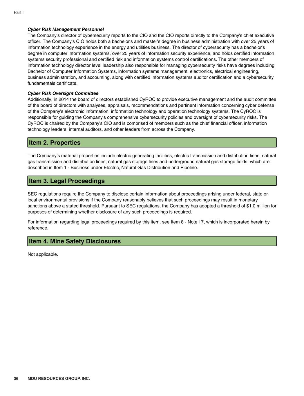 MDU RESOURCES GROUP, INC. Part I 36 Cyber Risk Management Personnel The Company's director of cybersecurity reports to the CIO and the CIO reports directly to the Company's chief executive officer. The Company's CIO holds both a bachelor's and master's degree in business administration with over 25 years of information technology experience in the energy and utilities business. The director of cybersecurity has a bachelor’s degree in computer information systems, over 25 years of information security experience, and holds certified information systems security professional and certified risk and information systems control certifications. The other members of information technology director level leadership also responsible for managing cybersecurity risks have degrees including Bachelor of Computer Information Systems, information systems management, electronics, electrical engineering, business administration, and accounting, along with certified information systems auditor certification and a cybersecurity fundamentals certificate. Cyber Risk Oversight Committee Additionally, in 2014 the board of directors established CyROC to provide executive management and the audit committee of the board of directors with analyses, appraisals, recommendations and pertinent information concerning cyber defense of the Company's electronic information, information technology and operation technology systems. The CyROC is responsible for guiding the Company's comprehensive cybersecurity policies and oversight of cybersecurity risks. The CyROC is chaired by the Company's CIO and is comprised of members such as the chief financial officer, information technology leaders, internal auditors, and other leaders from across the Company. Item 2. Properties The Company’s material properties include electric generating facilities, electric transmission and distribution lines, natural gas transmission and distribution lines, natural gas storage lines and underground natural gas storage fields, which are described in Item 1 - Business under Electric, Natural Gas Distribution and Pipeline. Item 3. Legal Proceedings SEC regulations require the Company to disclose certain information about proceedings arising under federal, state or local environmental provisions if the Company reasonably believes that such proceedings may result in monetary sanctions above a stated threshold. Pursuant to SEC regulations, the Company has adopted a threshold of $1.0 million for purposes of determining whether disclosure of any such proceedings is required. For information regarding legal proceedings required by this item, see Item 8 - Note 17, which is incorporated herein by reference. Item 4. Mine Safety Disclosures Not applicable. Index Part I 36 MDU Resources Group, Inc. Form 10-K