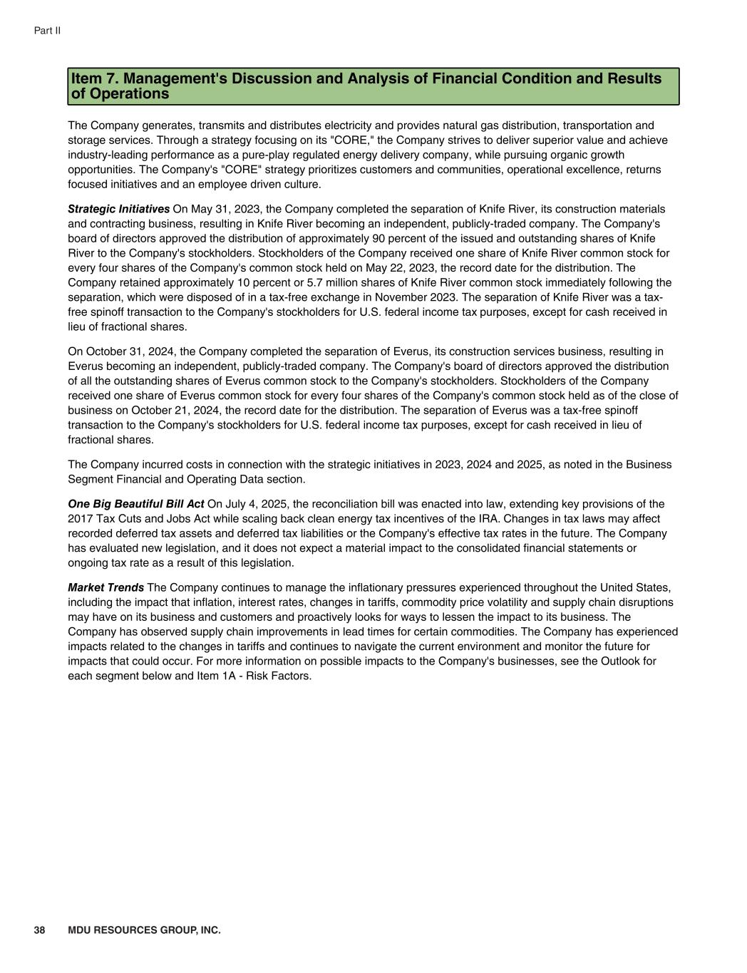 Part II MDU RESOURCES GROUP, INC.38 Item 7. Management's Discussion and Analysis of Financial Condition and Results of Operations The Company generates, transmits and distributes electricity and provides natural gas distribution, transportation and storage services. Through a strategy focusing on its "CORE," the Company strives to deliver superior value and achieve industry-leading performance as a pure-play regulated energy delivery company, while pursuing organic growth opportunities. The Company's "CORE" strategy prioritizes customers and communities, operational excellence, returns focused initiatives and an employee driven culture. Strategic Initiatives On May 31, 2023, the Company completed the separation of Knife River, its construction materials and contracting business, resulting in Knife River becoming an independent, publicly-traded company. The Company's board of directors approved the distribution of approximately 90 percent of the issued and outstanding shares of Knife River to the Company's stockholders. Stockholders of the Company received one share of Knife River common stock for every four shares of the Company's common stock held on May 22, 2023, the record date for the distribution. The Company retained approximately 10 percent or 5.7 million shares of Knife River common stock immediately following the separation, which were disposed of in a tax-free exchange in November 2023. The separation of Knife River was a tax- free spinoff transaction to the Company's stockholders for U.S. federal income tax purposes, except for cash received in lieu of fractional shares. On October 31, 2024, the Company completed the separation of Everus, its construction services business, resulting in Everus becoming an independent, publicly-traded company. The Company's board of directors approved the distribution of all the outstanding shares of Everus common stock to the Company's stockholders. Stockholders of the Company received one share of Everus common stock for every four shares of the Company's common stock held as of the close of business on October 21, 2024, the record date for the distribution. The separation of Everus was a tax-free spinoff transaction to the Company's stockholders for U.S. federal income tax purposes, except for cash received in lieu of fractional shares. The Company incurred costs in connection with the strategic initiatives in 2023, 2024 and 2025, as noted in the Business Segment Financial and Operating Data section. One Big Beautiful Bill Act On July 4, 2025, the reconciliation bill was enacted into law, extending key provisions of the 2017 Tax Cuts and Jobs Act while scaling back clean energy tax incentives of the IRA. Changes in tax laws may affect recorded deferred tax assets and deferred tax liabilities or the Company's effective tax rates in the future. The Company has evaluated new legislation, and it does not expect a material impact to the consolidated financial statements or ongoing tax rate as a result of this legislation. Market Trends The Company continues to manage the inflationary pressures experienced throughout the United States, including the impact that inflation, interest rates, changes in tariffs, commodity price volatility and supply chain disruptions may have on its business and customers and proactively looks for ways to lessen the impact to its business. The Company has observed supply chain improvements in lead times for certain commodities. The Company has experienced impacts related to the changes in tariffs and continues to navigate the current environment and monitor the future for impacts that could occur. For more information on possible impacts to the Company's businesses, see the Outlook for each segment below and Item 1A - Risk Factors. Index Part II 38 MDU Resources Group, Inc. Form 10-K