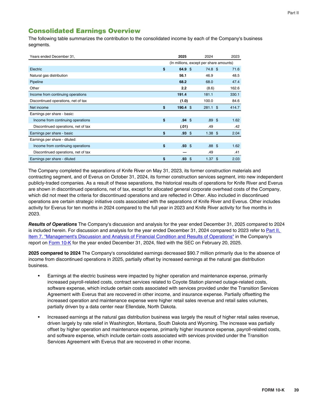 Part II 39FORM 10-K Consolidated Earnings Overview The following table summarizes the contribution to the consolidated income by each of the Company's business segments. Years ended December 31, 2025 2024 2023 (In millions, except per share amounts) Electric $ 64.9 $ 74.8 $ 71.6 Natural gas distribution 56.1 46.9 48.5 Pipeline 68.2 68.0 47.4 Other 2.2 (8.6) 162.6 Income from continuing operations 191.4 181.1 330.1 Discontinued operations, net of tax (1.0) 100.0 84.6 Net income $ 190.4 $ 281.1 $ 414.7 Earnings per share - basic: Income from continuing operations $ .94 $ .89 $ 1.62 Discontinued operations, net of tax (.01) .49 .42 Earnings per share - basic $ .93 $ 1.38 $ 2.04 Earnings per share - diluted: Income from continuing operations $ .93 $ .88 $ 1.62 Discontinued operations, net of tax — .49 .41 Earnings per share - diluted $ .93 $ 1.37 $ 2.03 The Company completed the separations of Knife River on May 31, 2023, its former construction materials and contracting segment, and of Everus on October 31, 2024, its former construction services segment, into new independent publicly-traded companies. As a result of these separations, the historical results of operations for Knife River and Everus are shown in discontinued operations, net of tax, except for allocated general corporate overhead costs of the Company, which did not meet the criteria for discontinued operations and are reflected in Other. Also included in discontinued operations are certain strategic initiative costs associated with the separations of Knife River and Everus. Other includes activity for Everus for ten months in 2024 compared to the full year in 2023 and Knife River activity for five months in 2023. Results of Operations The Company's discussion and analysis for the year ended December 31, 2025 compared to 2024 is included herein. For discussion and analysis for the year ended December 31, 2024 compared to 2023 refer to Part II, Item 7. "Management's Discussion and Analysis of Financial Condition and Results of Operations" in the Company's report on Form 10-K for the year ended December 31, 2024, filed with the SEC on February 20, 2025. 2025 compared to 2024 The Company's consolidated earnings decreased $90.7 million primarily due to the absence of income from discontinued operations in 2025, partially offset by increased earnings at the natural gas distribution business. • Earnings at the electric business were impacted by higher operation and maintenance expense, primarily increased payroll-related costs, contract services related to Coyote Station planned outage-related costs, software expense, which include certain costs associated with services provided under the Transition Services Agreement with Everus that are recovered in other income, and insurance expense. Partially offsetting the increased operation and maintenance expense were higher retail sales revenue and retail sales volumes, partially driven by a data center near Ellendale, North Dakota. • Increased earnings at the natural gas distribution business was largely the result of higher retail sales revenue, driven largely by rate relief in Washington, Montana, South Dakota and Wyoming. The increase was partially offset by higher operation and maintenance expense, primarily higher insurance expense, payroll-related costs, and software expense, which include certain costs associated with services provided under the Transition Services Agreement with Everus that are recovered in other income. Index Part II MDU Resources Group, Inc. Form 10-K 39