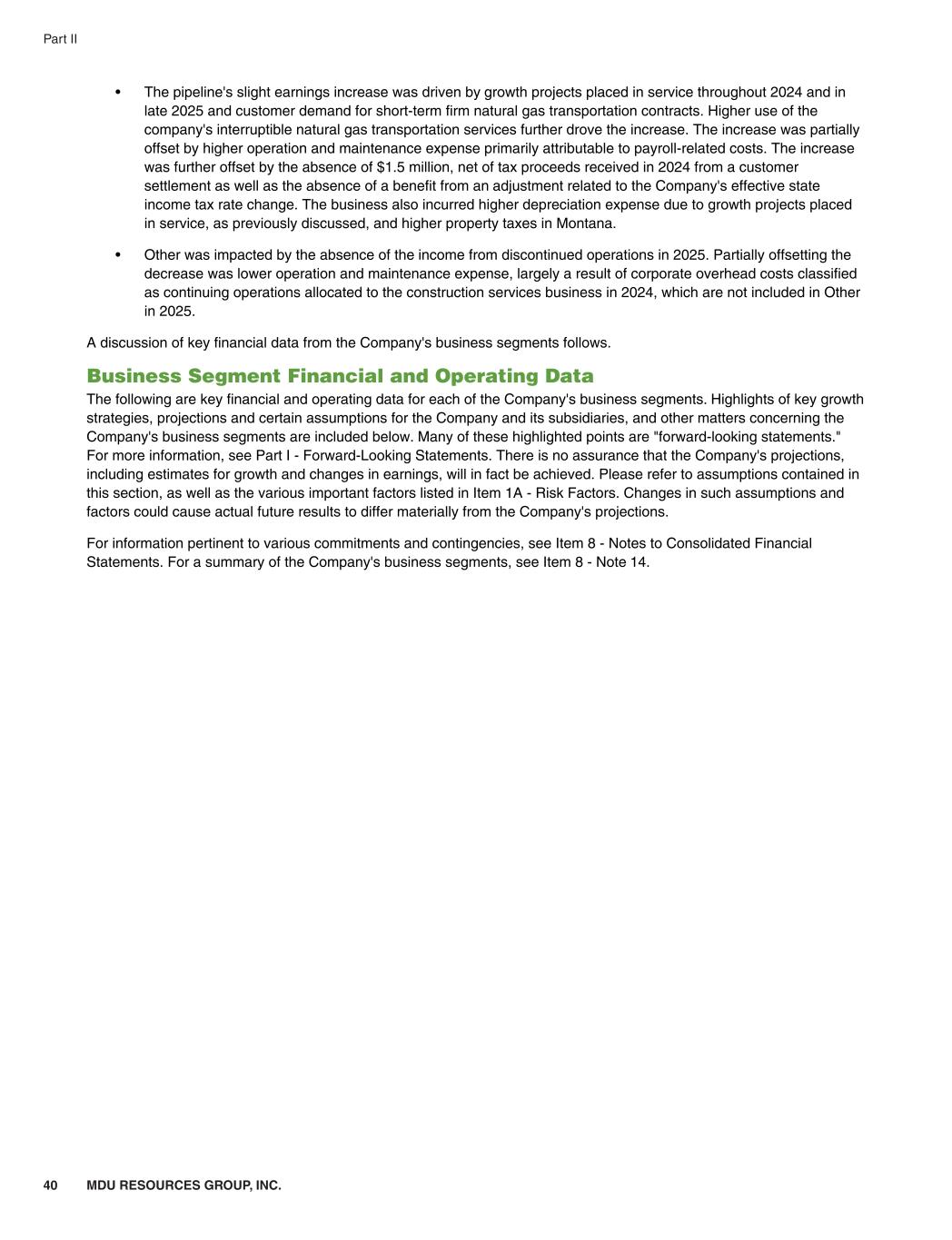 Part II MDU RESOURCES GROUP, INC.40 • The pipeline's slight earnings increase was driven by growth projects placed in service throughout 2024 and in late 2025 and customer demand for short-term firm natural gas transportation contracts. Higher use of the company's interruptible natural gas transportation services further drove the increase. The increase was partially offset by higher operation and maintenance expense primarily attributable to payroll-related costs. The increase was further offset by the absence of $1.5 million, net of tax proceeds received in 2024 from a customer settlement as well as the absence of a benefit from an adjustment related to the Company's effective state income tax rate change. The business also incurred higher depreciation expense due to growth projects placed in service, as previously discussed, and higher property taxes in Montana. • Other was impacted by the absence of the income from discontinued operations in 2025. Partially offsetting the decrease was lower operation and maintenance expense, largely a result of corporate overhead costs classified as continuing operations allocated to the construction services business in 2024, which are not included in Other in 2025. A discussion of key financial data from the Company's business segments follows. Business Segment Financial and Operating Data The following are key financial and operating data for each of the Company's business segments. Highlights of key growth strategies, projections and certain assumptions for the Company and its subsidiaries, and other matters concerning the Company's business segments are included below. Many of these highlighted points are "forward-looking statements." For more information, see Part I - Forward-Looking Statements. There is no assurance that the Company's projections, including estimates for growth and changes in earnings, will in fact be achieved. Please refer to assumptions contained in this section, as well as the various important factors listed in Item 1A - Risk Factors. Changes in such assumptions and factors could cause actual future results to differ materially from the Company's projections. For information pertinent to various commitments and contingencies, see Item 8 - Notes to Consolidated Financial Statements. For a summary of the Company's business segments, see Item 8 - Note 14. Index Part II 40 MDU Resources Group, Inc. Form 10-K