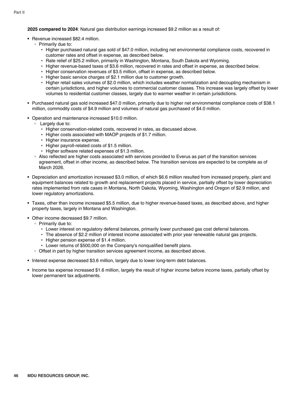 Part II MDU RESOURCES GROUP, INC.46 2025 compared to 2024: Natural gas distribution earnings increased $9.2 million as a result of: • Revenue increased $82.4 million. ◦ Primarily due to: ▪ Higher purchased natural gas sold of $47.0 million, including net environmental compliance costs, recovered in customer rates and offset in expense, as described below. ▪ Rate relief of $25.2 million, primarily in Washington, Montana, South Dakota and Wyoming. ▪ Higher revenue-based taxes of $3.6 million, recovered in rates and offset in expense, as described below. ▪ Higher conservation revenues of $3.5 million, offset in expense, as described below. ▪ Higher basic service charges of $2.1 million due to customer growth. ▪ Higher retail sales volumes of $2.0 million, which includes weather normalization and decoupling mechanism in certain jurisdictions, and higher volumes to commercial customer classes. This increase was largely offset by lower volumes to residential customer classes, largely due to warmer weather in certain jurisdictions. • Purchased natural gas sold increased $47.0 million, primarily due to higher net environmental compliance costs of $38.1 million, commodity costs of $4.9 million and volumes of natural gas purchased of $4.0 million. • Operation and maintenance increased $10.0 million. ◦ Largely due to: ▪ Higher conservation-related costs, recovered in rates, as discussed above. ▪ Higher costs associated with MAOP projects of $1.7 million. ▪ Higher insurance expense. ▪ Higher payroll-related costs of $1.5 million. ▪ Higher software related expenses of $1.3 million. ◦ Also reflected are higher costs associated with services provided to Everus as part of the transition services agreement, offset in other income, as described below. The transition services are expected to be complete as of March 2026. • Depreciation and amortization increased $3.0 million, of which $6.6 million resulted from increased property, plant and equipment balances related to growth and replacement projects placed in service, partially offset by lower depreciation rates implemented from rate cases in Montana, North Dakota, Wyoming, Washington and Oregon of $2.9 million, and lower regulatory amortizations. • Taxes, other than income increased $5.5 million, due to higher revenue-based taxes, as described above, and higher property taxes, largely in Montana and Washington. • Other income decreased $9.7 million. ◦ Primarily due to: ▪ Lower interest on regulatory deferral balances, primarily lower purchased gas cost deferral balances. ▪ The absence of $2.2 million of interest income associated with prior year renewable natural gas projects. ▪ Higher pension expense of $1.4 million. ▪ Lower returns of $500,000 on the Company's nonqualified benefit plans. ◦ Offset in part by higher transition services agreement income, as described above. • Interest expense decreased $3.6 million, largely due to lower long-term debt balances. • Income tax expense increased $1.6 million, largely the result of higher income before income taxes, partially offset by lower permanent tax adjustments. Index Part II 46 MDU Resources Group, Inc. Form 10-K