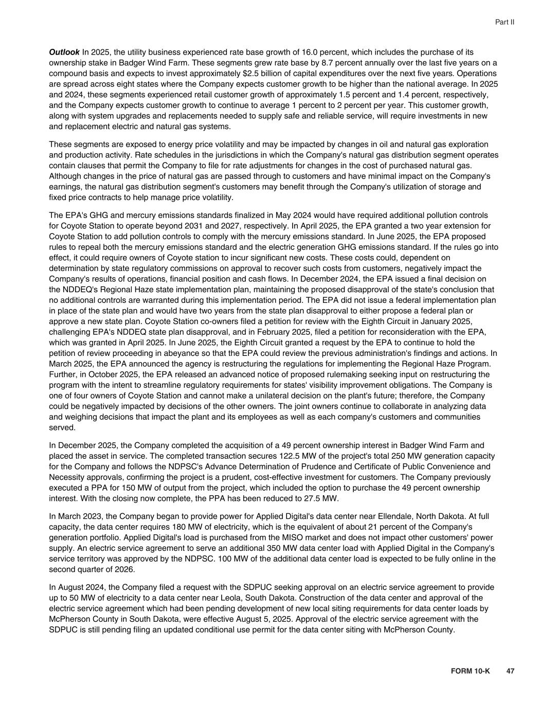 Part II 47FORM 10-K Outlook In 2025, the utility business experienced rate base growth of 16.0 percent, which includes the purchase of its ownership stake in Badger Wind Farm. These segments grew rate base by 8.7 percent annually over the last five years on a compound basis and expects to invest approximately $2.5 billion of capital expenditures over the next five years. Operations are spread across eight states where the Company expects customer growth to be higher than the national average. In 2025 and 2024, these segments experienced retail customer growth of approximately 1.5 percent and 1.4 percent, respectively, and the Company expects customer growth to continue to average 1 percent to 2 percent per year. This customer growth, along with system upgrades and replacements needed to supply safe and reliable service, will require investments in new and replacement electric and natural gas systems. These segments are exposed to energy price volatility and may be impacted by changes in oil and natural gas exploration and production activity. Rate schedules in the jurisdictions in which the Company's natural gas distribution segment operates contain clauses that permit the Company to file for rate adjustments for changes in the cost of purchased natural gas. Although changes in the price of natural gas are passed through to customers and have minimal impact on the Company's earnings, the natural gas distribution segment's customers may benefit through the Company's utilization of storage and fixed price contracts to help manage price volatility. The EPA's GHG and mercury emissions standards finalized in May 2024 would have required additional pollution controls for Coyote Station to operate beyond 2031 and 2027, respectively. In April 2025, the EPA granted a two year extension for Coyote Station to add pollution controls to comply with the mercury emissions standard. In June 2025, the EPA proposed rules to repeal both the mercury emissions standard and the electric generation GHG emissions standard. If the rules go into effect, it could require owners of Coyote station to incur significant new costs. These costs could, dependent on determination by state regulatory commissions on approval to recover such costs from customers, negatively impact the Company's results of operations, financial position and cash flows. In December 2024, the EPA issued a final decision on the NDDEQ's Regional Haze state implementation plan, maintaining the proposed disapproval of the state's conclusion that no additional controls are warranted during this implementation period. The EPA did not issue a federal implementation plan in place of the state plan and would have two years from the state plan disapproval to either propose a federal plan or approve a new state plan. Coyote Station co-owners filed a petition for review with the Eighth Circuit in January 2025, challenging EPA's NDDEQ state plan disapproval, and in February 2025, filed a petition for reconsideration with the EPA, which was granted in April 2025. In June 2025, the Eighth Circuit granted a request by the EPA to continue to hold the petition of review proceeding in abeyance so that the EPA could review the previous administration's findings and actions. In March 2025, the EPA announced the agency is restructuring the regulations for implementing the Regional Haze Program. Further, in October 2025, the EPA released an advanced notice of proposed rulemaking seeking input on restructuring the program with the intent to streamline regulatory requirements for states' visibility improvement obligations. The Company is one of four owners of Coyote Station and cannot make a unilateral decision on the plant's future; therefore, the Company could be negatively impacted by decisions of the other owners. The joint owners continue to collaborate in analyzing data and weighing decisions that impact the plant and its employees as well as each company's customers and communities served. In December 2025, the Company completed the acquisition of a 49 percent ownership interest in Badger Wind Farm and placed the asset in service. The completed transaction secures 122.5 MW of the project's total 250 MW generation capacity for the Company and follows the NDPSC's Advance Determination of Prudence and Certificate of Public Convenience and Necessity approvals, confirming the project is a prudent, cost-effective investment for customers. The Company previously executed a PPA for 150 MW of output from the project, which included the option to purchase the 49 percent ownership interest. With the closing now complete, the PPA has been reduced to 27.5 MW. In March 2023, the Company began to provide power for Applied Digital's data center near Ellendale, North Dakota. At full capacity, the data center requires 180 MW of electricity, which is the equivalent of about 21 percent of the Company's generation portfolio. Applied Digital's load is purchased from the MISO market and does not impact other customers' power supply. An electric service agreement to serve an additional 350 MW data center load with Applied Digital in the Company's service territory was approved by the NDPSC. 100 MW of the additional data center load is expected to be fully online in the second quarter of 2026. In August 2024, the Company filed a request with the SDPUC seeking approval on an electric service agreement to provide up to 50 MW of electricity to a data center near Leola, South Dakota. Construction of the data center and approval of the electric service agreement which had been pending development of new local siting requirements for data center loads by McPherson County in South Dakota, were effective August 5, 2025. Approval of the electric service agreement with the SDPUC is still pending filing an updated conditional use permit for the data center siting with McPherson County. Index Part II MDU Resources Group, Inc. Form 10-K 47
