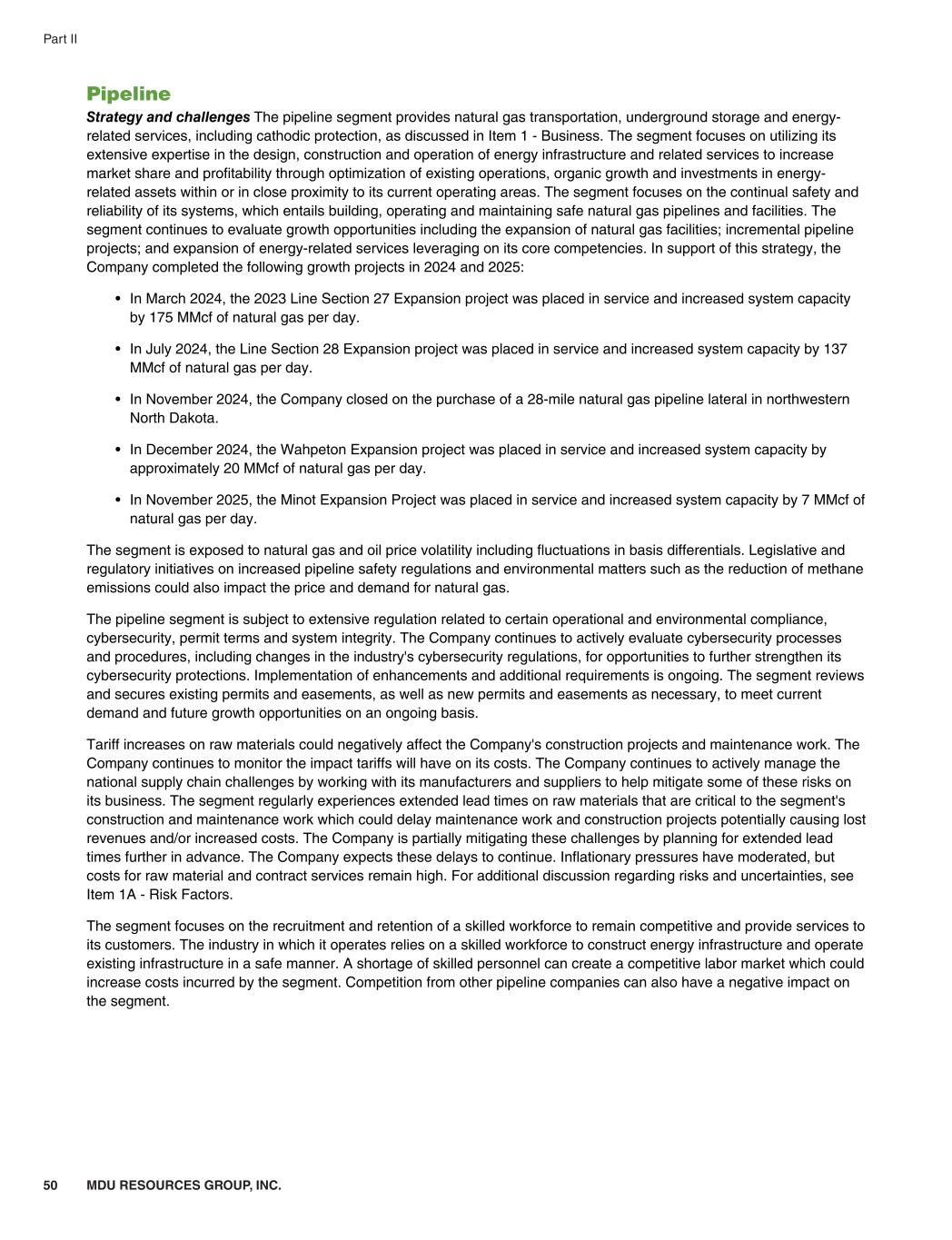 Part II MDU RESOURCES GROUP, INC.50 Pipeline Strategy and challenges The pipeline segment provides natural gas transportation, underground storage and energy- related services, including cathodic protection, as discussed in Item 1 - Business. The segment focuses on utilizing its extensive expertise in the design, construction and operation of energy infrastructure and related services to increase market share and profitability through optimization of existing operations, organic growth and investments in energy- related assets within or in close proximity to its current operating areas. The segment focuses on the continual safety and reliability of its systems, which entails building, operating and maintaining safe natural gas pipelines and facilities. The segment continues to evaluate growth opportunities including the expansion of natural gas facilities; incremental pipeline projects; and expansion of energy-related services leveraging on its core competencies. In support of this strategy, the Company completed the following growth projects in 2024 and 2025: • In March 2024, the 2023 Line Section 27 Expansion project was placed in service and increased system capacity by 175 MMcf of natural gas per day. • In July 2024, the Line Section 28 Expansion project was placed in service and increased system capacity by 137 MMcf of natural gas per day. • In November 2024, the Company closed on the purchase of a 28-mile natural gas pipeline lateral in northwestern North Dakota. • In December 2024, the Wahpeton Expansion project was placed in service and increased system capacity by approximately 20 MMcf of natural gas per day. • In November 2025, the Minot Expansion Project was placed in service and increased system capacity by 7 MMcf of natural gas per day. The segment is exposed to natural gas and oil price volatility including fluctuations in basis differentials. Legislative and regulatory initiatives on increased pipeline safety regulations and environmental matters such as the reduction of methane emissions could also impact the price and demand for natural gas. The pipeline segment is subject to extensive regulation related to certain operational and environmental compliance, cybersecurity, permit terms and system integrity. The Company continues to actively evaluate cybersecurity processes and procedures, including changes in the industry's cybersecurity regulations, for opportunities to further strengthen its cybersecurity protections. Implementation of enhancements and additional requirements is ongoing. The segment reviews and secures existing permits and easements, as well as new permits and easements as necessary, to meet current demand and future growth opportunities on an ongoing basis. Tariff increases on raw materials could negatively affect the Company's construction projects and maintenance work. The Company continues to monitor the impact tariffs will have on its costs. The Company continues to actively manage the national supply chain challenges by working with its manufacturers and suppliers to help mitigate some of these risks on its business. The segment regularly experiences extended lead times on raw materials that are critical to the segment's construction and maintenance work which could delay maintenance work and construction projects potentially causing lost revenues and/or increased costs. The Company is partially mitigating these challenges by planning for extended lead times further in advance. The Company expects these delays to continue. Inflationary pressures have moderated, but costs for raw material and contract services remain high. For additional discussion regarding risks and uncertainties, see Item 1A - Risk Factors. The segment focuses on the recruitment and retention of a skilled workforce to remain competitive and provide services to its customers. The industry in which it operates relies on a skilled workforce to construct energy infrastructure and operate existing infrastructure in a safe manner. A shortage of skilled personnel can create a competitive labor market which could increase costs incurred by the segment. Competition from other pipeline companies can also have a negative impact on the segment. Index Part II 50 MDU Resources Group, Inc. Form 10-K