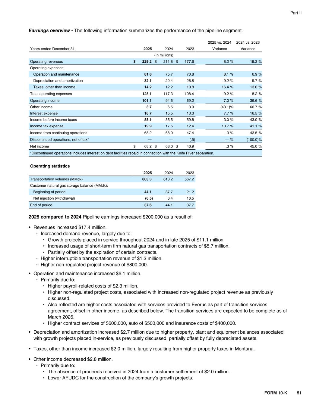 Part II 51FORM 10-K Earnings overview - The following information summarizes the performance of the pipeline segment. 2025 vs. 2024 2024 vs. 2023 Years ended December 31, 2025 2024 2023 Variance Variance (In millions) Operating revenues $ 229.2 $ 211.8 $ 177.6 8.2 % 19.3 % Operating expenses: Operation and maintenance 81.8 75.7 70.8 8.1 % 6.9 % Depreciation and amortization 32.1 29.4 26.8 9.2 % 9.7 % Taxes, other than income 14.2 12.2 10.8 16.4 % 13.0 % Total operating expenses 128.1 117.3 108.4 9.2 % 8.2 % Operating income 101.1 94.5 69.2 7.0 % 36.6 % Other income 3.7 6.5 3.9 (43.1) % 66.7 % Interest expense 16.7 15.5 13.3 7.7 % 16.5 % Income before income taxes 88.1 85.5 59.8 3.0 % 43.0 % Income tax expense 19.9 17.5 12.4 13.7 % 41.1 % Income from continuing operations 68.2 68.0 47.4 .3 % 43.5 % Discontinued operations, net of tax* — — (.5) — % (100.0) % Net income $ 68.2 $ 68.0 $ 46.9 .3 % 45.0 % *Discontinued operations includes interest on debt facilities repaid in connection with the Knife River separation. Operating statistics 2025 2024 2023 Transportation volumes (MMdk) 603.3 613.2 567.2 Customer natural gas storage balance (MMdk): Beginning of period 44.1 37.7 21.2 Net injection (withdrawal) (6.5) 6.4 16.5 End of period 37.6 44.1 37.7 2025 compared to 2024 Pipeline earnings increased $200,000 as a result of: • Revenues increased $17.4 million. ◦ Increased demand revenue, largely due to: ▪ Growth projects placed in service throughout 2024 and in late 2025 of $11.1 million. ▪ Increased usage of short-term firm natural gas transportation contracts of $5.7 million. ▪ Partially offset by the expiration of certain contracts. ◦ Higher interruptible transportation revenue of $1.3 million. ◦ Higher non-regulated project revenue of $800,000. • Operation and maintenance increased $6.1 million. ◦ Primarily due to: ▪ Higher payroll-related costs of $2.3 million. ▪ Higher non-regulated project costs, associated with increased non-regulated project revenue as previously discussed. ▪ Also reflected are higher costs associated with services provided to Everus as part of transition services agreement, offset in other income, as described below. The transition services are expected to be complete as of March 2026. ▪ Higher contract services of $600,000, auto of $500,000 and insurance costs of $400,000. • Depreciation and amortization increased $2.7 million due to higher property, plant and equipment balances associated with growth projects placed in-service, as previously discussed, partially offset by fully depreciated assets. • Taxes, other than income increased $2.0 million, largely resulting from higher property taxes in Montana. • Other income decreased $2.8 million. ◦ Primarily due to: ▪ The absence of proceeds received in 2024 from a customer settlement of $2.0 million. ▪ Lower AFUDC for the construction of the company's growth projects. Index Part II MDU Resources Group, Inc. Form 10-K 51