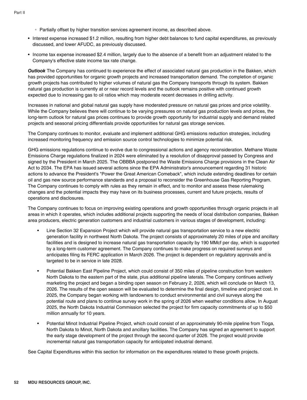 Part II MDU RESOURCES GROUP, INC.52 ◦ Partially offset by higher transition services agreement income, as described above. • Interest expense increased $1.2 million, resulting from higher debt balances to fund capital expenditures, as previously discussed, and lower AFUDC, as previously discussed. • Income tax expense increased $2.4 million, largely due to the absence of a benefit from an adjustment related to the Company's effective state income tax rate change. Outlook The Company has continued to experience the effect of associated natural gas production in the Bakken, which has provided opportunities for organic growth projects and increased transportation demand. The completion of organic growth projects has contributed to higher volumes of natural gas the Company transports through its system. Bakken natural gas production is currently at or near record levels and the outlook remains positive with continued growth expected due to increasing gas to oil ratios which may moderate recent decreases in drilling activity. Increases in national and global natural gas supply have moderated pressure on natural gas prices and price volatility. While the Company believes there will continue to be varying pressures on natural gas production levels and prices, the long-term outlook for natural gas prices continues to provide growth opportunity for industrial supply and demand related projects and seasonal pricing differentials provide opportunities for natural gas storage services. The Company continues to monitor, evaluate and implement additional GHG emissions reduction strategies, including increased monitoring frequency and emission source control technologies to minimize potential risk. GHG emissions regulations continue to evolve due to congressional actions and agency reconsideration. Methane Waste Emissions Charge regulations finalized in 2024 were eliminated by a resolution of disapproval passed by Congress and signed by the President in March 2025. The OBBBA postponed the Waste Emissions Charge provisions in the Clean Air Act to 2034. The EPA has issued several actions since the EPA Administrator's announcement regarding 31 historic actions to advance the President's "Power the Great American Comeback", which include extending deadlines for certain oil and gas new source performance standards and a proposal to reconsider the Greenhouse Gas Reporting Program. The Company continues to comply with rules as they remain in effect, and to monitor and assess these rulemaking changes and the potential impacts they may have on its business processes, current and future projects, results of operations and disclosures. The Company continues to focus on improving existing operations and growth opportunities through organic projects in all areas in which it operates, which includes additional projects supporting the needs of local distribution companies, Bakken area producers, electric generation customers and industrial customers in various stages of development, including: • Line Section 32 Expansion Project which will provide natural gas transportation service to a new electric generation facility in northwest North Dakota. The project consists of approximately 20 miles of pipe and ancillary facilities and is designed to increase natural gas transportation capacity by 190 MMcf per day, which is supported by a long-term customer agreement. The Company continues to make progress on required surveys and anticipates filing its FERC application in March 2026. The project is dependent on regulatory approvals and is targeted to be in service in late 2028. • Potential Bakken East Pipeline Project, which could consist of 350 miles of pipeline construction from western North Dakota to the eastern part of the state, plus additional pipeline laterals. The Company continues actively marketing the project and began a binding open season on February 2, 2026, which will conclude on March 13, 2026. The results of the open season will be evaluated to determine the final design, timeline and project cost. In 2025, the Company began working with landowners to conduct environmental and civil surveys along the potential route and plans to continue survey work in the spring of 2026 when weather conditions allow. In August 2025, the North Dakota Industrial Commission selected the project for firm capacity commitments of up to $50 million annually for 10 years. • Potential Minot Industrial Pipeline Project, which could consist of an approximately 90-mile pipeline from Tioga, North Dakota to Minot, North Dakota and ancillary facilities. The Company has signed an agreement to support the early stage development of the project through the second quarter of 2026. The project would provide incremental natural gas transportation capacity for anticipated industrial demand. See Capital Expenditures within this section for information on the expenditures related to these growth projects. Index Part II 52 MDU Resources Group, Inc. Form 10-K