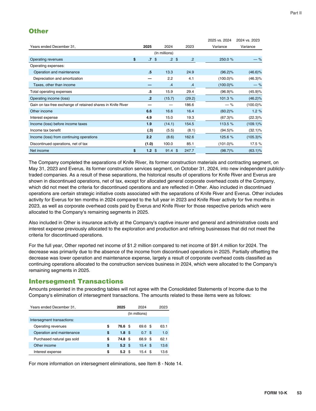 Part II 53FORM 10-K Other 2025 vs. 2024 2024 vs. 2023 Years ended December 31, 2025 2024 2023 Variance Variance (In millions) Operating revenues $ .7 $ .2 $ .2 250.0 % — % Operating expenses: Operation and maintenance .5 13.3 24.9 (96.2) % (46.6) % Depreciation and amortization — 2.2 4.1 (100.0) % (46.3) % Taxes, other than income — .4 .4 (100.0) % — % Total operating expenses .5 15.9 29.4 (96.9) % (45.9) % Operating income (loss) .2 (15.7) (29.2) 101.3 % (46.2) % Gain on tax-free exchange of retained shares in Knife River — — 186.6 — % (100.0) % Other income 6.6 16.6 16.4 (60.2) % 1.2 % Interest expense 4.9 15.0 19.3 (67.3) % (22.3) % Income (loss) before income taxes 1.9 (14.1) 154.5 113.5 % (109.1) % Income tax benefit (.3) (5.5) (8.1) (94.5) % (32.1) % Income (loss) from continuing operations 2.2 (8.6) 162.6 125.6 % (105.3) % Discontinued operations, net of tax (1.0) 100.0 85.1 (101.0) % 17.5 % Net income $ 1.2 $ 91.4 $ 247.7 (98.7) % (63.1) % The Company completed the separations of Knife River, its former construction materials and contracting segment, on May 31, 2023 and Everus, its former construction services segment, on October 31, 2024, into new independent publicly- traded companies. As a result of these separations, the historical results of operations for Knife River and Everus are shown in discontinued operations, net of tax, except for allocated general corporate overhead costs of the Company, which did not meet the criteria for discontinued operations and are reflected in Other. Also included in discontinued operations are certain strategic initiative costs associated with the separations of Knife River and Everus. Other includes activity for Everus for ten months in 2024 compared to the full year in 2023 and Knife River activity for five months in 2023, as well as corporate overhead costs paid by Everus and Knife River for those respective periods which were allocated to the Company's remaining segments in 2025. Also included in Other is insurance activity at the Company's captive insurer and general and administrative costs and interest expense previously allocated to the exploration and production and refining businesses that did not meet the criteria for discontinued operations. For the full year, Other reported net income of $1.2 million compared to net income of $91.4 million for 2024. The decrease was primarily due to the absence of the income from discontinued operations in 2025. Partially offsetting the decrease was lower operation and maintenance expense, largely a result of corporate overhead costs classified as continuing operations allocated to the construction services business in 2024, which were allocated to the Company's remaining segments in 2025. Intersegment Transactions Amounts presented in the preceding tables will not agree with the Consolidated Statements of Income due to the Company's elimination of intersegment transactions. The amounts related to these items were as follows: Years ended December 31, 2025 2024 2023 (In millions) Intersegment transactions: Operating revenues $ 76.6 $ 69.6 $ 63.1 Operation and maintenance $ 1.8 $ 0.7 $ 1.0 Purchased natural gas sold $ 74.8 $ 68.9 $ 62.1 Other income $ 5.2 $ 15.4 $ 13.6 Interest expense $ 5.2 $ 15.4 $ 13.6 For more information on intersegment eliminations, see Item 8 - Note 14. Index Part II MDU Resources Group, Inc. Form 10-K 53