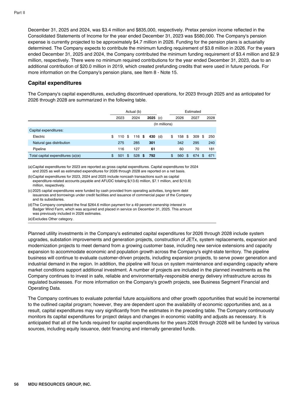 Part II MDU RESOURCES GROUP, INC.56 December 31, 2025 and 2024, was $3.4 million and $835,000, respectively. Pretax pension income reflected in the Consolidated Statements of Income for the year ended December 31, 2023 was $580,000. The Company's pension expense is currently projected to be approximately $4.7 million in 2026. Funding for the pension plans is actuarially determined. The Company expects to contribute the minimum funding requirement of $3.8 million in 2026. For the years ended December 31, 2025 and 2024, the Company contributed the minimum funding requirement of $3.4 million and $2.9 million, respectively. There were no minimum required contributions for the year ended December 31, 2023, due to an additional contribution of $20.0 million in 2019, which created prefunding credits that were used in future periods. For more information on the Company's pension plans, see Item 8 - Note 15. Capital expenditures The Company's capital expenditures, excluding discontinued operations, for 2023 through 2025 and as anticipated for 2026 through 2028 are summarized in the following table. Actual (b) Estimated 2023 2024 2025 (c) 2026 2027 2028 (In millions) Capital expenditures: Electric $ 110 $ 116 $ 430 (d) $ 158 $ 309 $ 250 Natural gas distribution 275 285 301 342 295 240 Pipeline 116 127 61 60 70 181 Total capital expenditures (a)(e) $ 501 $ 528 $ 792 $ 560 $ 674 $ 671 (a)Capital expenditures for 2023 are reported as gross capital expenditures. Capital expenditures for 2024 and 2025 as well as estimated expenditures for 2026 through 2028 are reported on a net basis. (b)Capital expenditures for 2023, 2024 and 2025 include noncash transactions such as capital expenditure-related accounts payable and AFUDC totaling $(13.6) million, $7.1 million, and $(10.8) million, respectively. (c)2025 capital expenditures were funded by cash provided from operating activities, long-term debt issuances and borrowings under credit facilities and issuance of commercial paper of the Company and its subsidiaries. (d)The Company completed the final $264.6 million payment for a 49 percent ownership interest in Badger Wind Farm, which was acquired and placed in service on December 31, 2025. This amount was previously included in 2026 estimates. (e)Excludes Other category. Planned utility investments in the Company's estimated capital expenditures for 2026 through 2028 include system upgrades, substation improvements and generation projects, construction of JETx, system replacements, expansion and modernization projects to meet demand from a growing customer base, including new service extensions and capacity expansion to accommodate economic and population growth across the Company's eight-state territory. The pipeline business will continue to evaluate customer-driven projects, including expansion projects, to serve power generation and industrial demand in the region. In addition, the pipeline will focus on system maintenance and expanding capacity where market conditions support additional investment. A number of projects are included in the planned investments as the Company continues to invest in safe, reliable and environmentally-responsible energy delivery infrastructure across its regulated businesses. For more information on the Company's growth projects, see Business Segment Financial and Operating Data. The Company continues to evaluate potential future acquisitions and other growth opportunities that would be incremental to the outlined capital program; however, they are dependent upon the availability of economic opportunities and, as a result, capital expenditures may vary significantly from the estimates in the preceding table. The Company continuously monitors its capital expenditures for project delays and changes in economic viability and adjusts as necessary. It is anticipated that all of the funds required for capital expenditures for the years 2026 through 2028 will be funded by various sources, including equity issuance, debt financing and internally generated funds. Index Part II 56 MDU Resources Group, Inc. Form 10-K