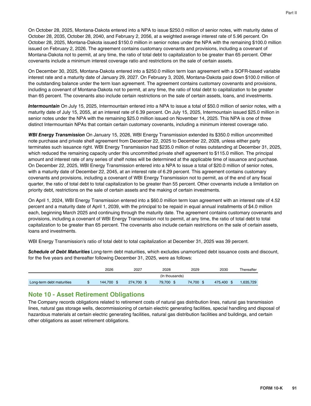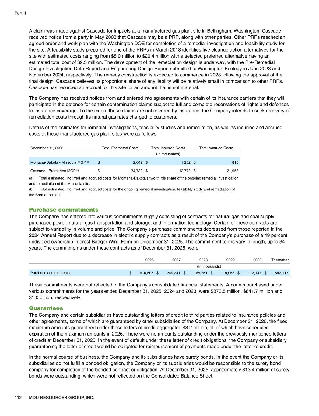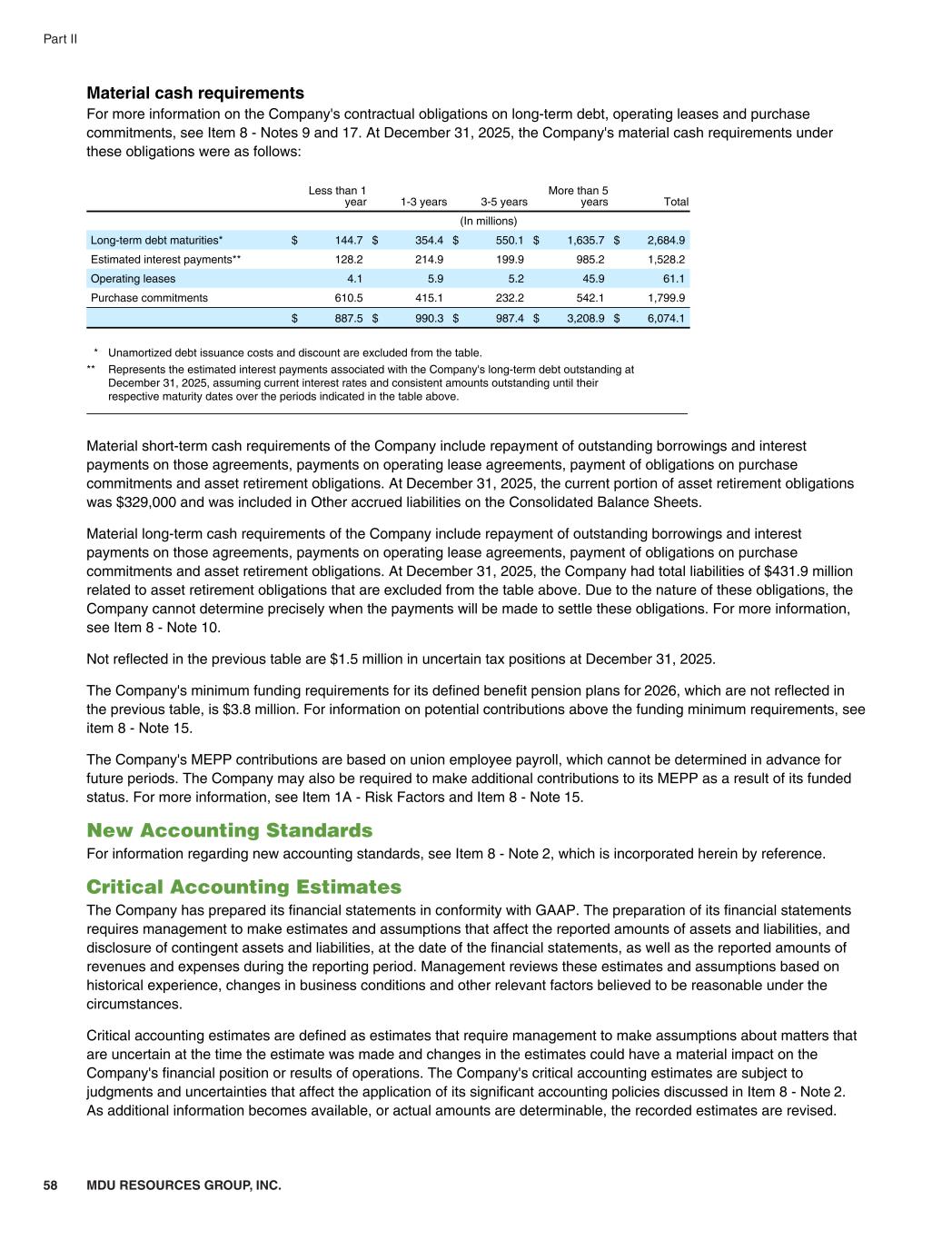 Part II MDU RESOURCES GROUP, INC.58 Material cash requirements For more information on the Company's contractual obligations on long-term debt, operating leases and purchase commitments, see Item 8 - Notes 9 and 17. At December 31, 2025, the Company's material cash requirements under these obligations were as follows: Less than 1 year 1-3 years 3-5 years More than 5 years Total (In millions) Long-term debt maturities* $ 144.7 $ 354.4 $ 550.1 $ 1,635.7 $ 2,684.9 Estimated interest payments** 128.2 214.9 199.9 985.2 1,528.2 Operating leases 4.1 5.9 5.2 45.9 61.1 Purchase commitments 610.5 415.1 232.2 542.1 1,799.9 $ 887.5 $ 990.3 $ 987.4 $ 3,208.9 $ 6,074.1 * Unamortized debt issuance costs and discount are excluded from the table. ** Represents the estimated interest payments associated with the Company's long-term debt outstanding at December 31, 2025, assuming current interest rates and consistent amounts outstanding until their respective maturity dates over the periods indicated in the table above. Material short-term cash requirements of the Company include repayment of outstanding borrowings and interest payments on those agreements, payments on operating lease agreements, payment of obligations on purchase commitments and asset retirement obligations. At December 31, 2025, the current portion of asset retirement obligations was $329,000 and was included in Other accrued liabilities on the Consolidated Balance Sheets. Material long-term cash requirements of the Company include repayment of outstanding borrowings and interest payments on those agreements, payments on operating lease agreements, payment of obligations on purchase commitments and asset retirement obligations. At December 31, 2025, the Company had total liabilities of $431.9 million related to asset retirement obligations that are excluded from the table above. Due to the nature of these obligations, the Company cannot determine precisely when the payments will be made to settle these obligations. For more information, see Item 8 - Note 10. Not reflected in the previous table are $1.5 million in uncertain tax positions at December 31, 2025. The Company's minimum funding requirements for its defined benefit pension plans for 2026, which are not reflected in the previous table, is $3.8 million. For information on potential contributions above the funding minimum requirements, see item 8 - Note 15. The Company's MEPP contributions are based on union employee payroll, which cannot be determined in advance for future periods. The Company may also be required to make additional contributions to its MEPP as a result of its funded status. For more information, see Item 1A - Risk Factors and Item 8 - Note 15. New Accounting Standards For information regarding new accounting standards, see Item 8 - Note 2, which is incorporated herein by reference. Critical Accounting Estimates The Company has prepared its financial statements in conformity with GAAP. The preparation of its financial statements requires management to make estimates and assumptions that affect the reported amounts of assets and liabilities, and disclosure of contingent assets and liabilities, at the date of the financial statements, as well as the reported amounts of revenues and expenses during the reporting period. Management reviews these estimates and assumptions based on historical experience, changes in business conditions and other relevant factors believed to be reasonable under the circumstances. Critical accounting estimates are defined as estimates that require management to make assumptions about matters that are uncertain at the time the estimate was made and changes in the estimates could have a material impact on the Company's financial position or results of operations. The Company's critical accounting estimates are subject to judgments and uncertainties that affect the application of its significant accounting policies discussed in Item 8 - Note 2. As additional information becomes available, or actual amounts are determinable, the recorded estimates are revised. Index Part II 58 MDU Resources Group, Inc. Form 10-K