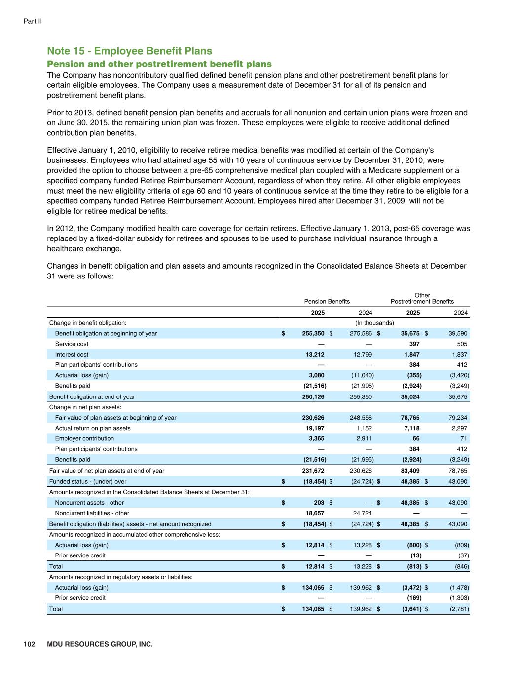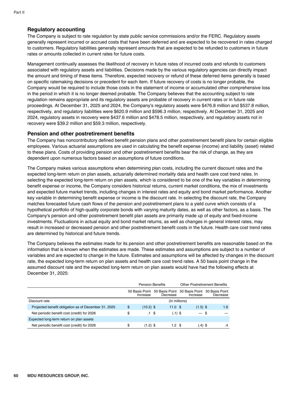 Part II MDU RESOURCES GROUP, INC.60 Regulatory accounting The Company is subject to rate regulation by state public service commissions and/or the FERC. Regulatory assets generally represent incurred or accrued costs that have been deferred and are expected to be recovered in rates charged to customers. Regulatory liabilities generally represent amounts that are expected to be refunded to customers in future rates or amounts collected in current rates for future costs. Management continually assesses the likelihood of recovery in future rates of incurred costs and refunds to customers associated with regulatory assets and liabilities. Decisions made by the various regulatory agencies can directly impact the amount and timing of these items. Therefore, expected recovery or refund of these deferred items generally is based on specific ratemaking decisions or precedent for each item. If future recovery of costs is no longer probable, the Company would be required to include those costs in the statement of income or accumulated other comprehensive loss in the period in which it is no longer deemed probable. The Company believes that the accounting subject to rate regulation remains appropriate and its regulatory assets are probable of recovery in current rates or in future rate proceedings. At December 31, 2025 and 2024, the Company's regulatory assets were $476.8 million and $537.8 million, respectively, and regulatory liabilities were $620.9 million and $596.3 million, respectively. At December 31, 2025 and 2024, regulatory assets in recovery were $437.6 million and $478.5 million, respectively, and regulatory assets not in recovery were $39.2 million and $59.3 million, respectively. Pension and other postretirement benefits The Company has noncontributory defined benefit pension plans and other postretirement benefit plans for certain eligible employees. Various actuarial assumptions are used in calculating the benefit expense (income) and liability (asset) related to these plans. Costs of providing pension and other postretirement benefits bear the risk of change, as they are dependent upon numerous factors based on assumptions of future conditions. The Company makes various assumptions when determining plan costs, including the current discount rates and the expected long-term return on plan assets, actuarially determined mortality data and health care cost trend rates. In selecting the expected long-term return on plan assets, which is considered to be one of the key variables in determining benefit expense or income, the Company considers historical returns, current market conditions, the mix of investments and expected future market trends, including changes in interest rates and equity and bond market performance. Another key variable in determining benefit expense or income is the discount rate. In selecting the discount rate, the Company matches forecasted future cash flows of the pension and postretirement plans to a yield curve which consists of a hypothetical portfolio of high-quality corporate bonds with varying maturity dates, as well as other factors, as a basis. The Company's pension and other postretirement benefit plan assets are primarily made up of equity and fixed-income investments. Fluctuations in actual equity and bond market returns, as well as changes in general interest rates, may result in increased or decreased pension and other postretirement benefit costs in the future. Health care cost trend rates are determined by historical and future trends. The Company believes the estimates made for its pension and other postretirement benefits are reasonable based on the information that is known when the estimates are made. These estimates and assumptions are subject to a number of variables and are expected to change in the future. Estimates and assumptions will be affected by changes in the discount rate, the expected long-term return on plan assets and health care cost trend rates. A 50 basis point change in the assumed discount rate and the expected long-term return on plan assets would have had the following effects at December 31, 2025: Pension Benefits Other Postretirement Benefits 50 Basis Point Increase 50 Basis Point Decrease 50 Basis Point Increase 50 Basis Point Decrease Discount rate (In millions) Projected benefit obligation as of December 31, 2025 $ (10.2) $ 11.0 $ (1.5) $ 1.6 Net periodic benefit cost (credit) for 2026 $ .1 $ (.1) $ — $ — Expected long-term return on plan assets Net periodic benefit cost (credit) for 2026 $ (1.2) $ 1.2 $ (.4) $ .4 Index Part II 60 MDU Resources Group, Inc. Form 10-K