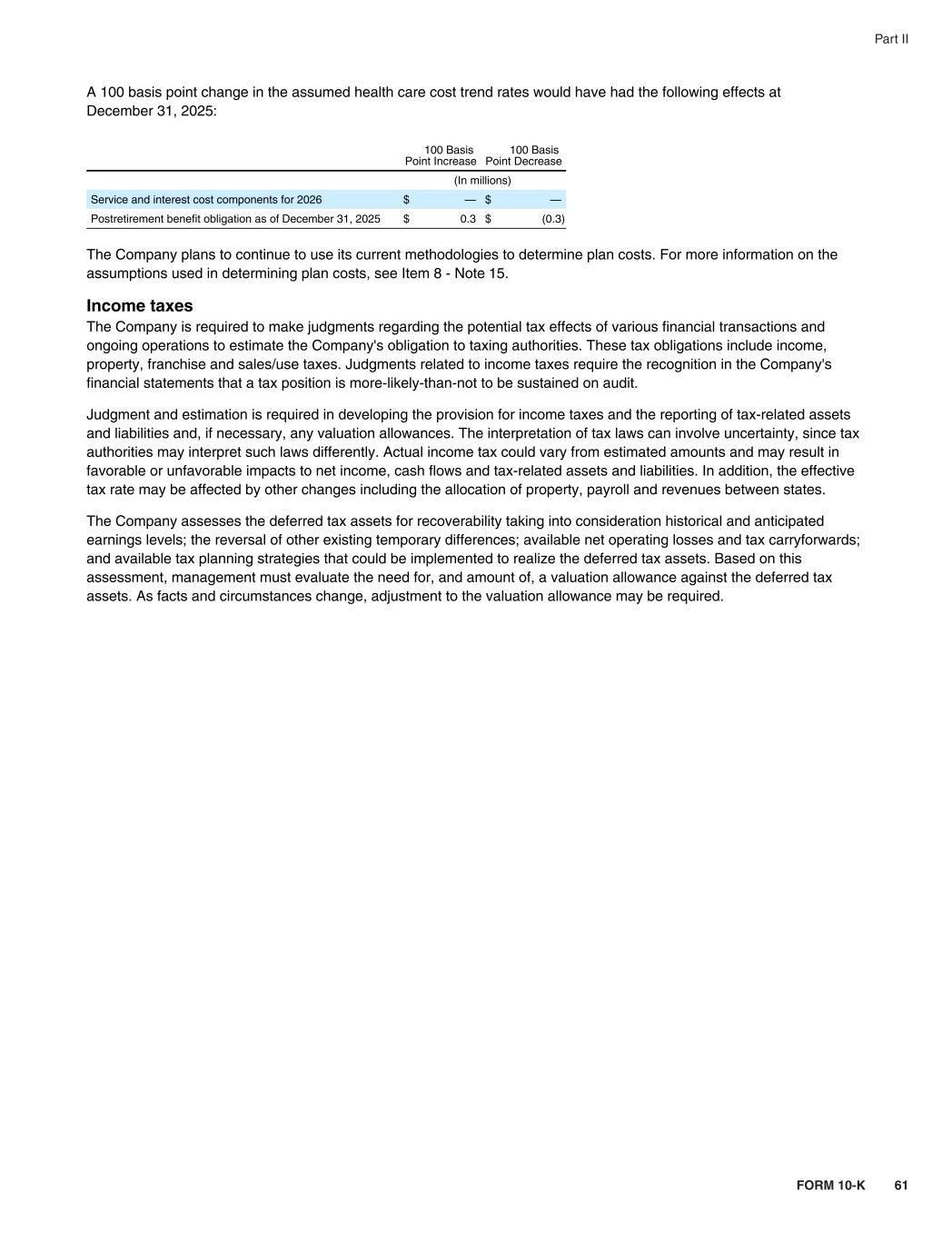 Part II 61FORM 10-K A 100 basis point change in the assumed health care cost trend rates would have had the following effects at December 31, 2025: 100 Basis Point Increase 100 Basis Point Decrease (In millions) Service and interest cost components for 2026 $ — $ — Postretirement benefit obligation as of December 31, 2025 $ 0.3 $ (0.3) The Company plans to continue to use its current methodologies to determine plan costs. For more information on the assumptions used in determining plan costs, see Item 8 - Note 15. Income taxes The Company is required to make judgments regarding the potential tax effects of various financial transactions and ongoing operations to estimate the Company's obligation to taxing authorities. These tax obligations include income, property, franchise and sales/use taxes. Judgments related to income taxes require the recognition in the Company's financial statements that a tax position is more-likely-than-not to be sustained on audit. Judgment and estimation is required in developing the provision for income taxes and the reporting of tax-related assets and liabilities and, if necessary, any valuation allowances. The interpretation of tax laws can involve uncertainty, since tax authorities may interpret such laws differently. Actual income tax could vary from estimated amounts and may result in favorable or unfavorable impacts to net income, cash flows and tax-related assets and liabilities. In addition, the effective tax rate may be affected by other changes including the allocation of property, payroll and revenues between states. The Company assesses the deferred tax assets for recoverability taking into consideration historical and anticipated earnings levels; the reversal of other existing temporary differences; available net operating losses and tax carryforwards; and available tax planning strategies that could be implemented to realize the deferred tax assets. Based on this assessment, management must evaluate the need for, and amount of, a valuation allowance against the deferred tax assets. As facts and circumstances change, adjustment to the valuation allowance may be required. Index Part II MDU Resources Group, Inc. Form 10-K 61
