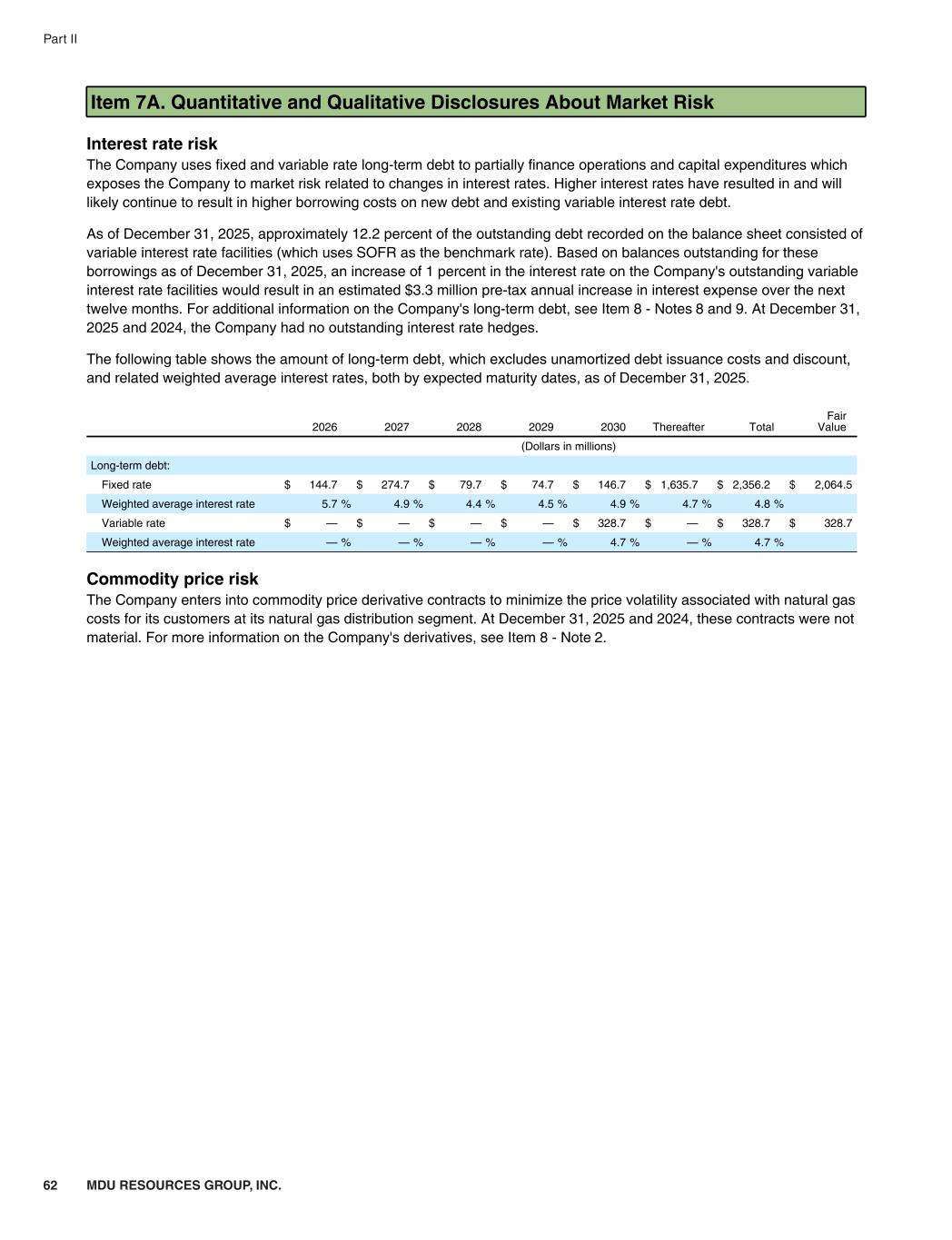 Part II MDU RESOURCES GROUP, INC.62 Item 7A. Quantitative and Qualitative Disclosures About Market Risk Interest rate risk The Company uses fixed and variable rate long-term debt to partially finance operations and capital expenditures which exposes the Company to market risk related to changes in interest rates. Higher interest rates have resulted in and will likely continue to result in higher borrowing costs on new debt and existing variable interest rate debt. As of December 31, 2025, approximately 12.2 percent of the outstanding debt recorded on the balance sheet consisted of variable interest rate facilities (which uses SOFR as the benchmark rate). Based on balances outstanding for these borrowings as of December 31, 2025, an increase of 1 percent in the interest rate on the Company's outstanding variable interest rate facilities would result in an estimated $3.3 million pre-tax annual increase in interest expense over the next twelve months. For additional information on the Company's long-term debt, see Item 8 - Notes 8 and 9. At December 31, 2025 and 2024, the Company had no outstanding interest rate hedges. The following table shows the amount of long-term debt, which excludes unamortized debt issuance costs and discount, and related weighted average interest rates, both by expected maturity dates, as of December 31, 2025. 2026 2027 2028 2029 2030 Thereafter Total Fair Value (Dollars in millions) Long-term debt: Fixed rate $ 144.7 $ 274.7 $ 79.7 $ 74.7 $ 146.7 $ 1,635.7 $ 2,356.2 $ 2,064.5 Weighted average interest rate 5.7 % 4.9 % 4.4 % 4.5 % 4.9 % 4.7 % 4.8 % Variable rate $ — $ — $ — $ — $ 328.7 $ — $ 328.7 $ 328.7 Weighted average interest rate — % — % — % — % 4.7 % — % 4.7 % Commodity price risk The Company enters into commodity price derivative contracts to minimize the price volatility associated with natural gas costs for its customers at its natural gas distribution segment. At December 31, 2025 and 2024, these contracts were not material. For more information on the Company's derivatives, see Item 8 - Note 2. Index Part II 62 MDU Resources Group, Inc. Form 10-K