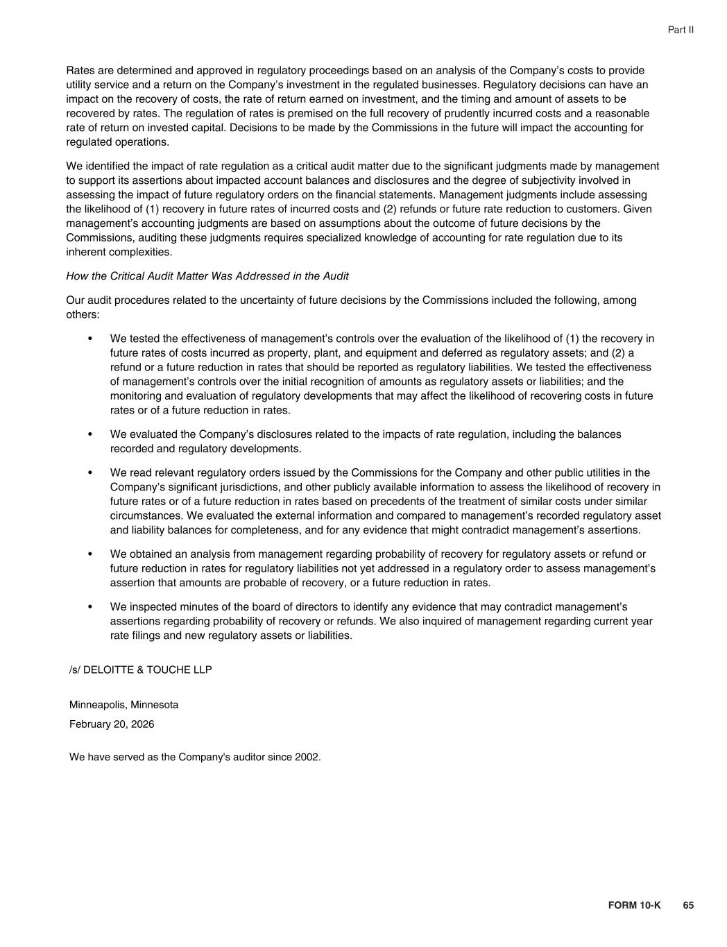 Part II 65FORM 10-K Rates are determined and approved in regulatory proceedings based on an analysis of the Company’s costs to provide utility service and a return on the Company’s investment in the regulated businesses. Regulatory decisions can have an impact on the recovery of costs, the rate of return earned on investment, and the timing and amount of assets to be recovered by rates. The regulation of rates is premised on the full recovery of prudently incurred costs and a reasonable rate of return on invested capital. Decisions to be made by the Commissions in the future will impact the accounting for regulated operations. We identified the impact of rate regulation as a critical audit matter due to the significant judgments made by management to support its assertions about impacted account balances and disclosures and the degree of subjectivity involved in assessing the impact of future regulatory orders on the financial statements. Management judgments include assessing the likelihood of (1) recovery in future rates of incurred costs and (2) refunds or future rate reduction to customers. Given management’s accounting judgments are based on assumptions about the outcome of future decisions by the Commissions, auditing these judgments requires specialized knowledge of accounting for rate regulation due to its inherent complexities. How the Critical Audit Matter Was Addressed in the Audit Our audit procedures related to the uncertainty of future decisions by the Commissions included the following, among others: • We tested the effectiveness of management’s controls over the evaluation of the likelihood of (1) the recovery in future rates of costs incurred as property, plant, and equipment and deferred as regulatory assets; and (2) a refund or a future reduction in rates that should be reported as regulatory liabilities. We tested the effectiveness of management’s controls over the initial recognition of amounts as regulatory assets or liabilities; and the monitoring and evaluation of regulatory developments that may affect the likelihood of recovering costs in future rates or of a future reduction in rates. • We evaluated the Company’s disclosures related to the impacts of rate regulation, including the balances recorded and regulatory developments. • We read relevant regulatory orders issued by the Commissions for the Company and other public utilities in the Company’s significant jurisdictions, and other publicly available information to assess the likelihood of recovery in future rates or of a future reduction in rates based on precedents of the treatment of similar costs under similar circumstances. We evaluated the external information and compared to management’s recorded regulatory asset and liability balances for completeness, and for any evidence that might contradict management’s assertions. • We obtained an analysis from management regarding probability of recovery for regulatory assets or refund or future reduction in rates for regulatory liabilities not yet addressed in a regulatory order to assess management’s assertion that amounts are probable of recovery, or a future reduction in rates. • We inspected minutes of the board of directors to identify any evidence that may contradict management’s assertions regarding probability of recovery or refunds. We also inquired of management regarding current year rate filings and new regulatory assets or liabilities. /s/ DELOITTE & TOUCHE LLP Minneapolis, Minnesota February 20, 2026 We have served as the Company's auditor since 2002. Index Part II MDU Resources Group, Inc. Form 10-K 65