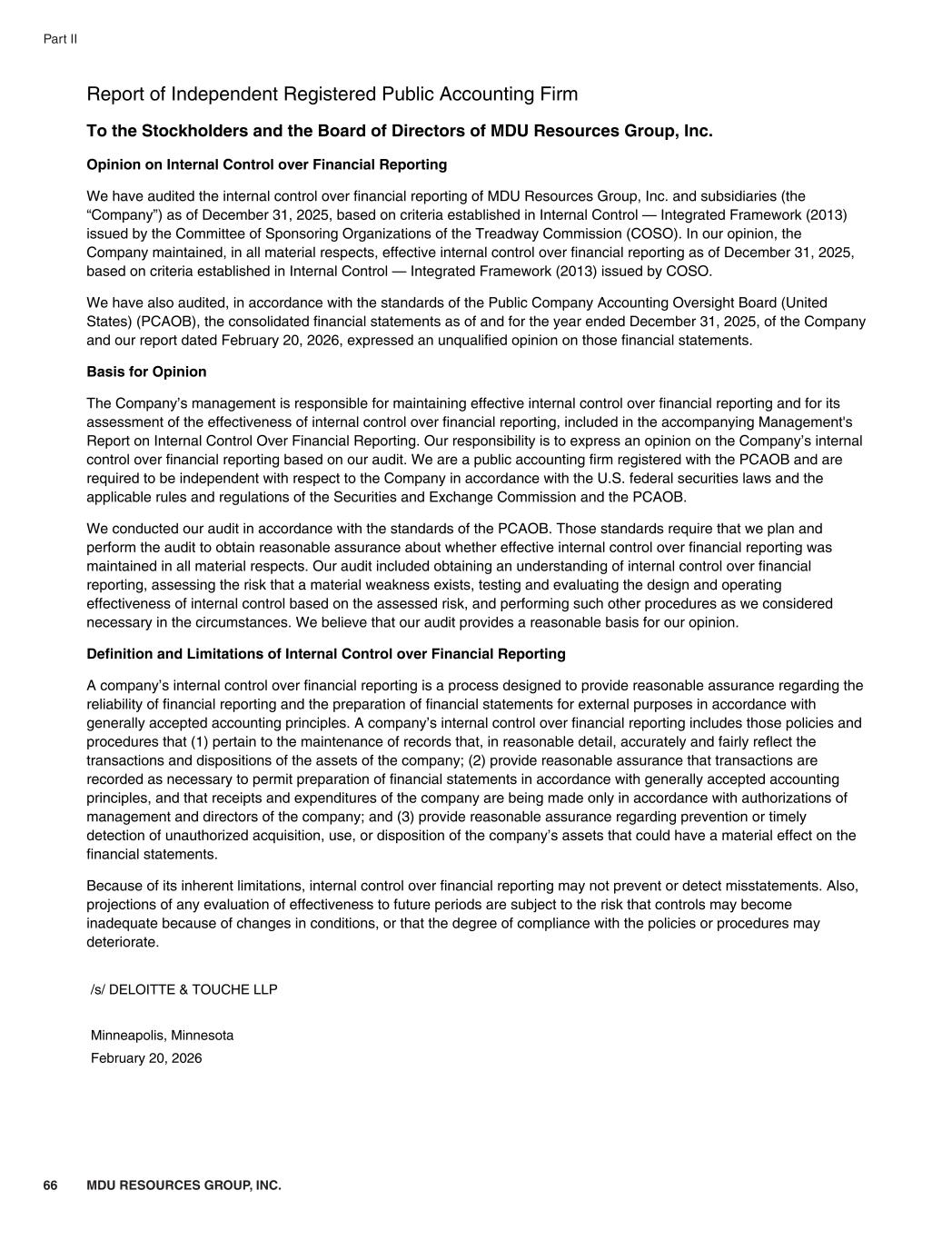 Part II MDU RESOURCES GROUP, INC.66 Report of Independent Registered Public Accounting Firm To the Stockholders and the Board of Directors of MDU Resources Group, Inc. Opinion on Internal Control over Financial Reporting We have audited the internal control over financial reporting of MDU Resources Group, Inc. and subsidiaries (the “Company”) as of December 31, 2025, based on criteria established in Internal Control — Integrated Framework (2013) issued by the Committee of Sponsoring Organizations of the Treadway Commission (COSO). In our opinion, the Company maintained, in all material respects, effective internal control over financial reporting as of December 31, 2025, based on criteria established in Internal Control — Integrated Framework (2013) issued by COSO. We have also audited, in accordance with the standards of the Public Company Accounting Oversight Board (United States) (PCAOB), the consolidated financial statements as of and for the year ended December 31, 2025, of the Company and our report dated February 20, 2026, expressed an unqualified opinion on those financial statements. Basis for Opinion The Company’s management is responsible for maintaining effective internal control over financial reporting and for its assessment of the effectiveness of internal control over financial reporting, included in the accompanying Management's Report on Internal Control Over Financial Reporting. Our responsibility is to express an opinion on the Company’s internal control over financial reporting based on our audit. We are a public accounting firm registered with the PCAOB and are required to be independent with respect to the Company in accordance with the U.S. federal securities laws and the applicable rules and regulations of the Securities and Exchange Commission and the PCAOB. We conducted our audit in accordance with the standards of the PCAOB. Those standards require that we plan and perform the audit to obtain reasonable assurance about whether effective internal control over financial reporting was maintained in all material respects. Our audit included obtaining an understanding of internal control over financial reporting, assessing the risk that a material weakness exists, testing and evaluating the design and operating effectiveness of internal control based on the assessed risk, and performing such other procedures as we considered necessary in the circumstances. We believe that our audit provides a reasonable basis for our opinion. Definition and Limitations of Internal Control over Financial Reporting A company’s internal control over financial reporting is a process designed to provide reasonable assurance regarding the reliability of financial reporting and the preparation of financial statements for external purposes in accordance with generally accepted accounting principles. A company’s internal control over financial reporting includes those policies and procedures that (1) pertain to the maintenance of records that, in reasonable detail, accurately and fairly reflect the transactions and dispositions of the assets of the company; (2) provide reasonable assurance that transactions are recorded as necessary to permit preparation of financial statements in accordance with generally accepted accounting principles, and that receipts and expenditures of the company are being made only in accordance with authorizations of management and directors of the company; and (3) provide reasonable assurance regarding prevention or timely detection of unauthorized acquisition, use, or disposition of the company’s assets that could have a material effect on the financial statements. Because of its inherent limitations, internal control over financial reporting may not prevent or detect misstatements. Also, projections of any evaluation of effectiveness to future periods are subject to the risk that controls may become inadequate because of changes in conditions, or that the degree of compliance with the policies or procedures may deteriorate. /s/ DELOITTE & TOUCHE LLP Minneapolis, Minnesota February 20, 2026 Index Part II 66 MDU Resources Group, Inc. Form 10-K