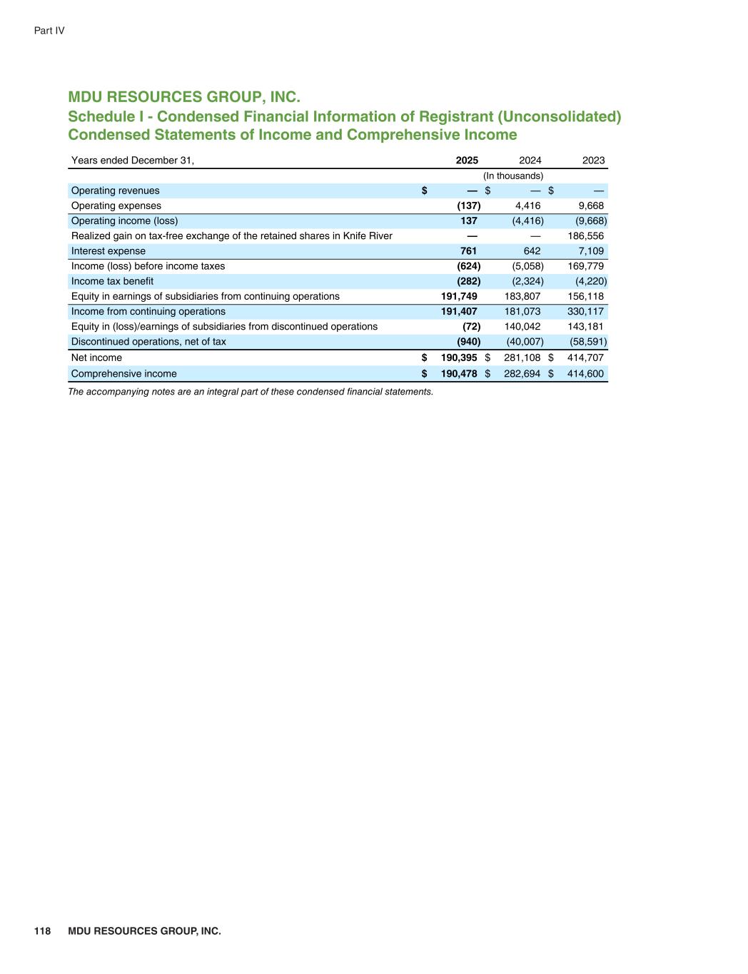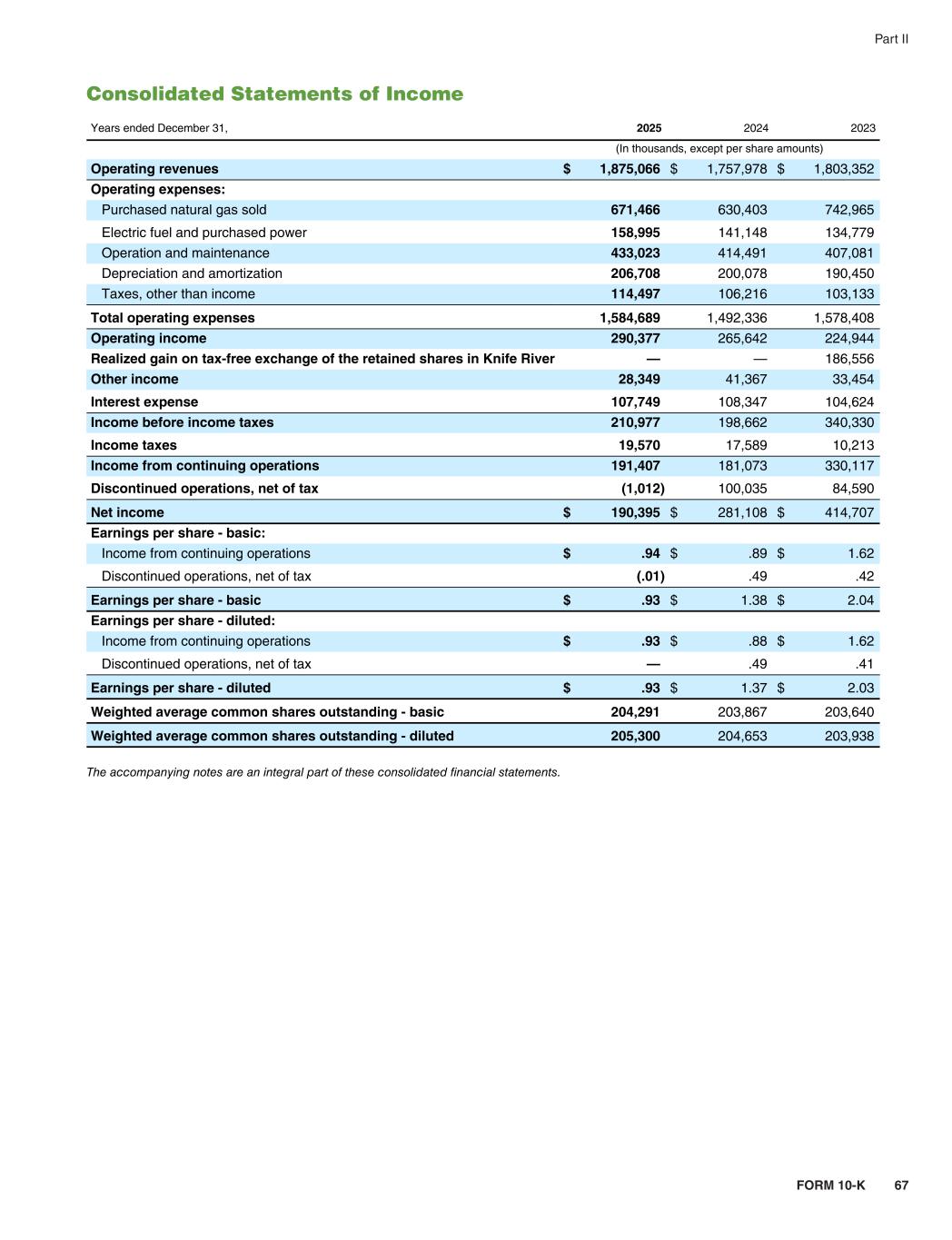 Part II 67FORM 10-K Consolidated Statements of Income Years ended December 31, 2025 2024 2023 (In thousands, except per share amounts) Operating revenues $ 1,875,066 $ 1,757,978 $ 1,803,352 Operating expenses: Purchased natural gas sold 671,466 630,403 742,965 Electric fuel and purchased power 158,995 141,148 134,779 Operation and maintenance 433,023 414,491 407,081 Depreciation and amortization 206,708 200,078 190,450 Taxes, other than income 114,497 106,216 103,133 Total operating expenses 1,584,689 1,492,336 1,578,408 Operating income 290,377 265,642 224,944 Realized gain on tax-free exchange of the retained shares in Knife River — — 186,556 Other income 28,349 41,367 33,454 Interest expense 107,749 108,347 104,624 Income before income taxes 210,977 198,662 340,330 Income taxes 19,570 17,589 10,213 Income from continuing operations 191,407 181,073 330,117 Discontinued operations, net of tax (1,012) 100,035 84,590 Net income $ 190,395 $ 281,108 $ 414,707 Earnings per share - basic: Income from continuing operations $ .94 $ .89 $ 1.62 Discontinued operations, net of tax (.01) .49 .42 Earnings per share - basic $ .93 $ 1.38 $ 2.04 Earnings per share - diluted: Income from continuing operations $ .93 $ .88 $ 1.62 Discontinued operations, net of tax — .49 .41 Earnings per share - diluted $ .93 $ 1.37 $ 2.03 Weighted average common shares outstanding - basic 204,291 203,867 203,640 Weighted average common shares outstanding - diluted 205,300 204,653 203,938 The accompanying notes are an integral part of these consolidated financial statements. Index Part II MDU Resources Group, Inc. Form 10-K 67