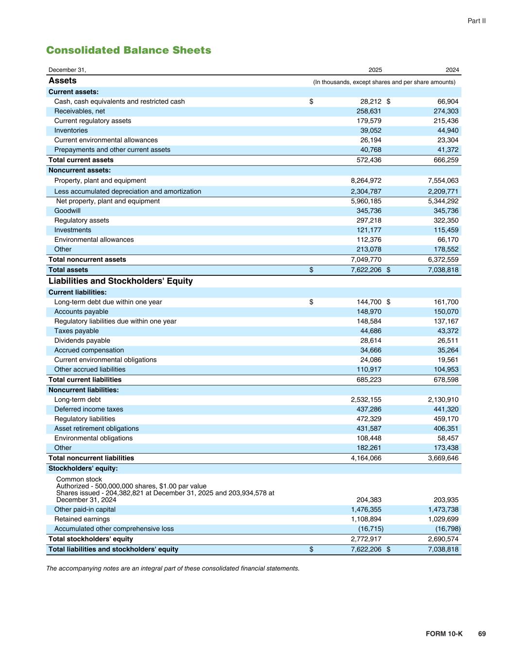 Part II 69FORM 10-K Consolidated Balance Sheets December 31, 2025 2024 Assets (In thousands, except shares and per share amounts) Current assets: Cash, cash equivalents and restricted cash $ 28,212 $ 66,904 Receivables, net 258,631 274,303 Current regulatory assets 179,579 215,436 Inventories 39,052 44,940 Current environmental allowances 26,194 23,304 Prepayments and other current assets 40,768 41,372 Total current assets 572,436 666,259 Noncurrent assets: Property, plant and equipment 8,264,972 7,554,063 Less accumulated depreciation and amortization 2,304,787 2,209,771 Net property, plant and equipment 5,960,185 5,344,292 Goodwill 345,736 345,736 Regulatory assets 297,218 322,350 Investments 121,177 115,459 Environmental allowances 112,376 66,170 Other 213,078 178,552 Total noncurrent assets 7,049,770 6,372,559 Total assets $ 7,622,206 $ 7,038,818 Liabilities and Stockholders' Equity Current liabilities: Long-term debt due within one year $ 144,700 $ 161,700 Accounts payable 148,970 150,070 Regulatory liabilities due within one year 148,584 137,167 Taxes payable 44,686 43,372 Dividends payable 28,614 26,511 Accrued compensation 34,666 35,264 Current environmental obligations 24,086 19,561 Other accrued liabilities 110,917 104,953 Total current liabilities 685,223 678,598 Noncurrent liabilities: Long-term debt 2,532,155 2,130,910 Deferred income taxes 437,286 441,320 Regulatory liabilities 472,329 459,170 Asset retirement obligations 431,587 406,351 Environmental obligations 108,448 58,457 Other 182,261 173,438 Total noncurrent liabilities 4,164,066 3,669,646 Stockholders' equity: Common stock Authorized - 500,000,000 shares, $1.00 par value Shares issued - 204,382,821 at December 31, 2025 and 203,934,578 at December 31, 2024 204,383 203,935 Other paid-in capital 1,476,355 1,473,738 Retained earnings 1,108,894 1,029,699 Accumulated other comprehensive loss (16,715) (16,798) Total stockholders' equity 2,772,917 2,690,574 Total liabilities and stockholders' equity $ 7,622,206 $ 7,038,818 The accompanying notes are an integral part of these consolidated financial statements. Index Part II MDU Resources Group, Inc. Form 10-K 69