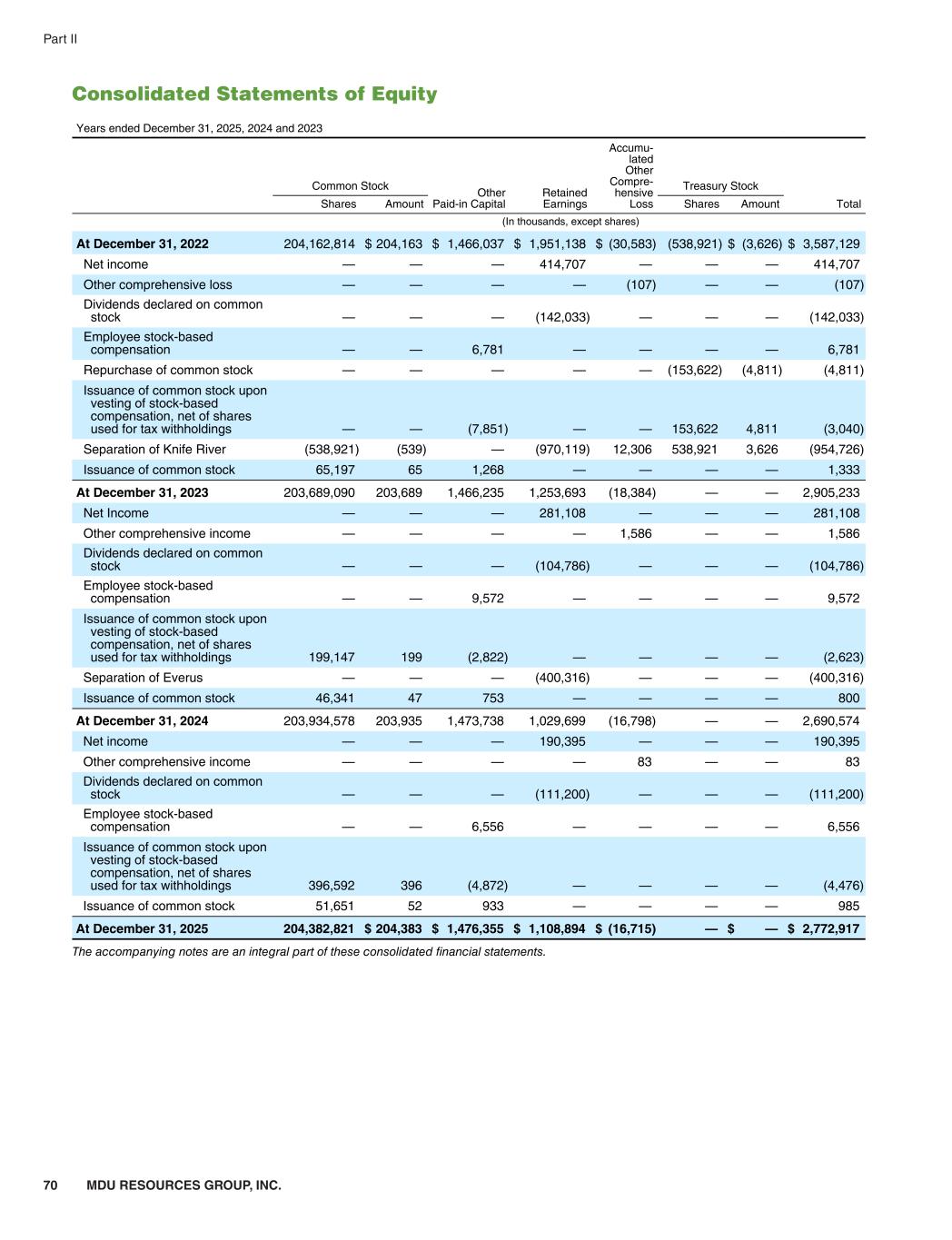 Part II MDU RESOURCES GROUP, INC.70 Consolidated Statements of Equity Years ended December 31, 2025, 2024 and 2023 Other Paid-in Capital Retained Earnings Accumu- lated Other Compre- hensive Loss Common Stock Treasury Stock Shares Amount Shares Amount Total (In thousands, except shares) At December 31, 2022 204,162,814 $ 204,163 $ 1,466,037 $ 1,951,138 $ (30,583) (538,921) $ (3,626) $ 3,587,129 Net income — — — 414,707 — — — 414,707 Other comprehensive loss — — — — (107) — — (107) Dividends declared on common stock — — — (142,033) — — — (142,033) Employee stock-based compensation — — 6,781 — — — — 6,781 Repurchase of common stock — — — — — (153,622) (4,811) (4,811) Issuance of common stock upon vesting of stock-based compensation, net of shares used for tax withholdings — — (7,851) — — 153,622 4,811 (3,040) Separation of Knife River (538,921) (539) — (970,119) 12,306 538,921 3,626 (954,726) Issuance of common stock 65,197 65 1,268 — — — — 1,333 At December 31, 2023 203,689,090 203,689 1,466,235 1,253,693 (18,384) — — 2,905,233 Net Income — — — 281,108 — — — 281,108 Other comprehensive income — — — — 1,586 — — 1,586 Dividends declared on common stock — — — (104,786) — — — (104,786) Employee stock-based compensation — — 9,572 — — — — 9,572 Issuance of common stock upon vesting of stock-based compensation, net of shares used for tax withholdings 199,147 199 (2,822) — — — — (2,623) Separation of Everus — — — (400,316) — — — (400,316) Issuance of common stock 46,341 47 753 — — — — 800 At December 31, 2024 203,934,578 203,935 1,473,738 1,029,699 (16,798) — — 2,690,574 Net income — — — 190,395 — — — 190,395 Other comprehensive income — — — — 83 — — 83 Dividends declared on common stock — — — (111,200) — — — (111,200) Employee stock-based compensation — — 6,556 — — — — 6,556 Issuance of common stock upon vesting of stock-based compensation, net of shares used for tax withholdings 396,592 396 (4,872) — — — — (4,476) Issuance of common stock 51,651 52 933 — — — — 985 At December 31, 2025 204,382,821 $ 204,383 $ 1,476,355 $ 1,108,894 $ (16,715) — $ — $ 2,772,917 The accompanying notes are an integral part of these consolidated financial statements. Index Part II 70 MDU Resources Group, Inc. Form 10-K