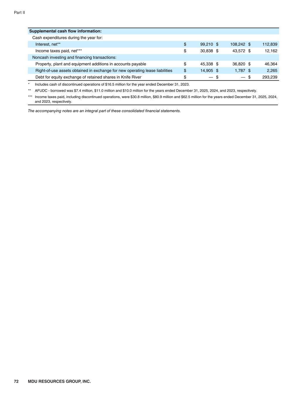 Part II MDU RESOURCES GROUP, INC.72 Supplemental cash flow information: Cash expenditures during the year for: Interest, net** $ 99,210 $ 108,242 $ 112,839 Income taxes paid, net*** $ 30,838 $ 43,572 $ 12,162 Noncash investing and financing transactions: Property, plant and equipment additions in accounts payable $ 45,338 $ 36,820 $ 46,364 Right-of-use assets obtained in exchange for new operating lease liabilities $ 14,905 $ 1,787 $ 2,265 Debt for equity exchange of retained shares in Knife River $ — $ — $ 293,239 * Includes cash of discontinued operations of $16.5 million for the year ended December 31, 2023. ** AFUDC - borrowed was $7.4 million, $11.0 million and $10.0 million for the years ended December 31, 2025, 2024, and 2023, respectively. *** Income taxes paid, including discontinued operations, were $30.8 million, $80.9 million and $62.5 million for the years ended December 31, 2025, 2024, and 2023, respectively. The accompanying notes are an integral part of these consolidated financial statements. Index Part II 72 MDU Resources Group, Inc. Form 10-K